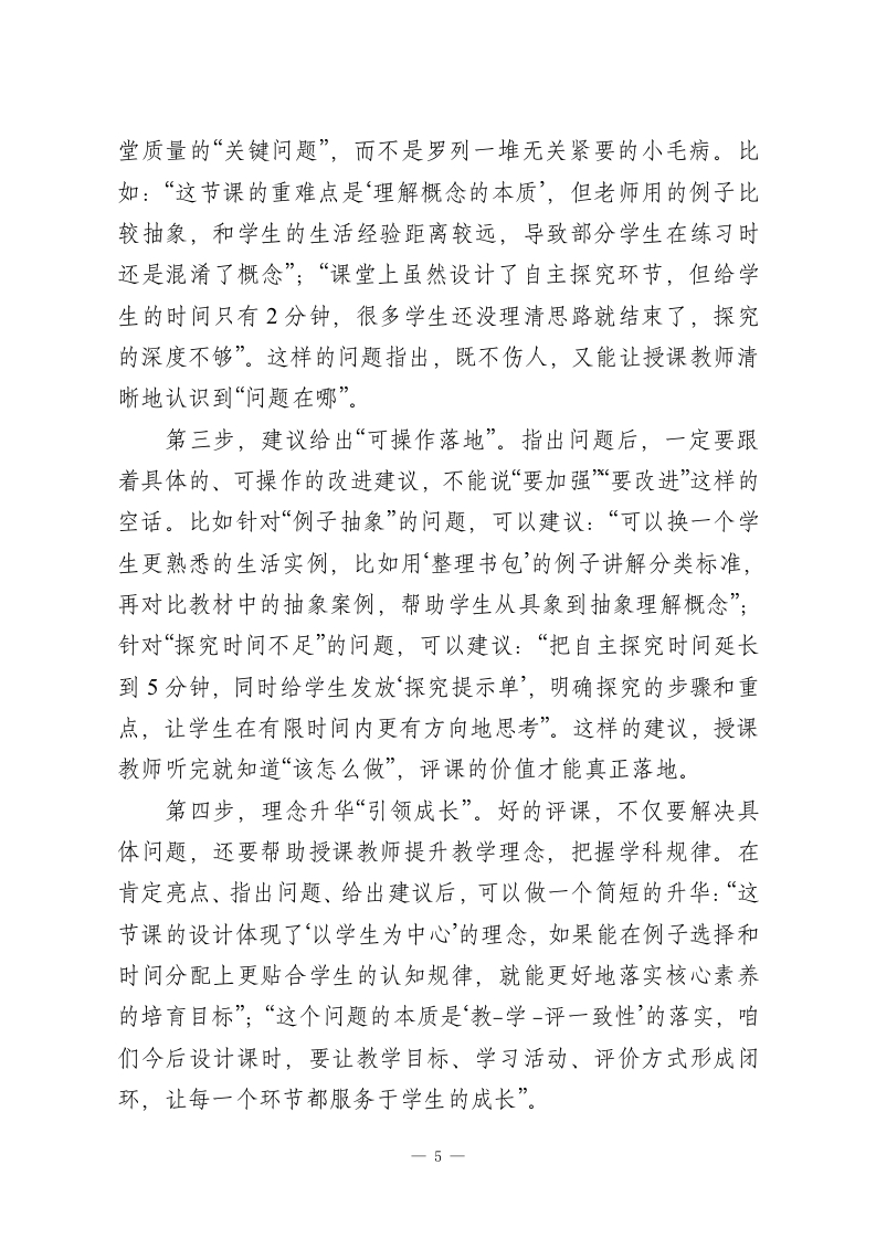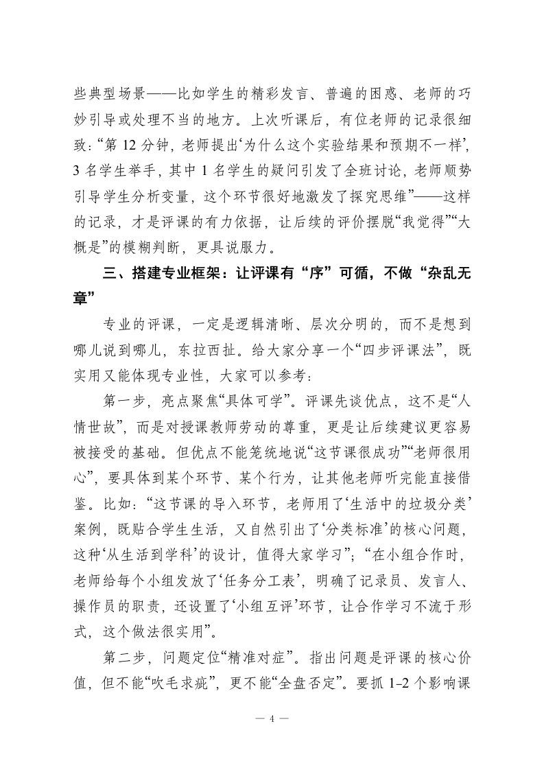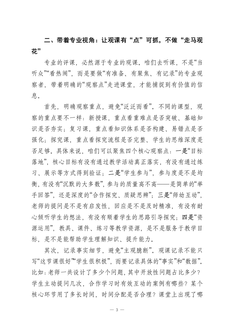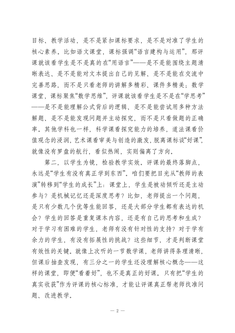 校长在教师会议上讲话:让每一次评课交流都成为教学成长的养分各位同仁:大家上午好!今天想和大家聊一个咱们天天接触、却值得深钻细研的话题一评课。说到评课,很多老师可能会觉得“就是开研讨会、提提意见”,但真正专业的评课,从来不是“走过场的赞美”,也不是“挑刺式的批评”,而是能让授课者受启发、听课者有收获、教学质量能提升的专业对话。它就像一面镜子,既能照见课堂的亮点,也能照亮改进的方向;更像一座桥梁,连接起个体经验与集体智慧。专业评课的核心,其实就藏在三个“不”和三个“要”里:不凭印象下结论、不凭资历定高低、不凭人情搞平衡;要以标准为依据、要以事实为支撑、要以成长为目标。接下来,我结合咱们日常教学的真实场景,和大家聊聊如何把评课的专业性落到每一个细节里。一、锚定专业基准:让评课有“根”可依,不做“无的放矢”评课首先要解决“评什么、按什么评”的问题,这个“根”就是《课程标准》和学生的真实发展需求,而不是“我以前都这么教”的经验主义,更不是“这节课看着挺顺”的主观感受。第一,以课标为纲,校准教学方向。咱们评课,先别急着看“老师教得顺不顺“课堂气氛热不热”,首要先看这节课的教学1