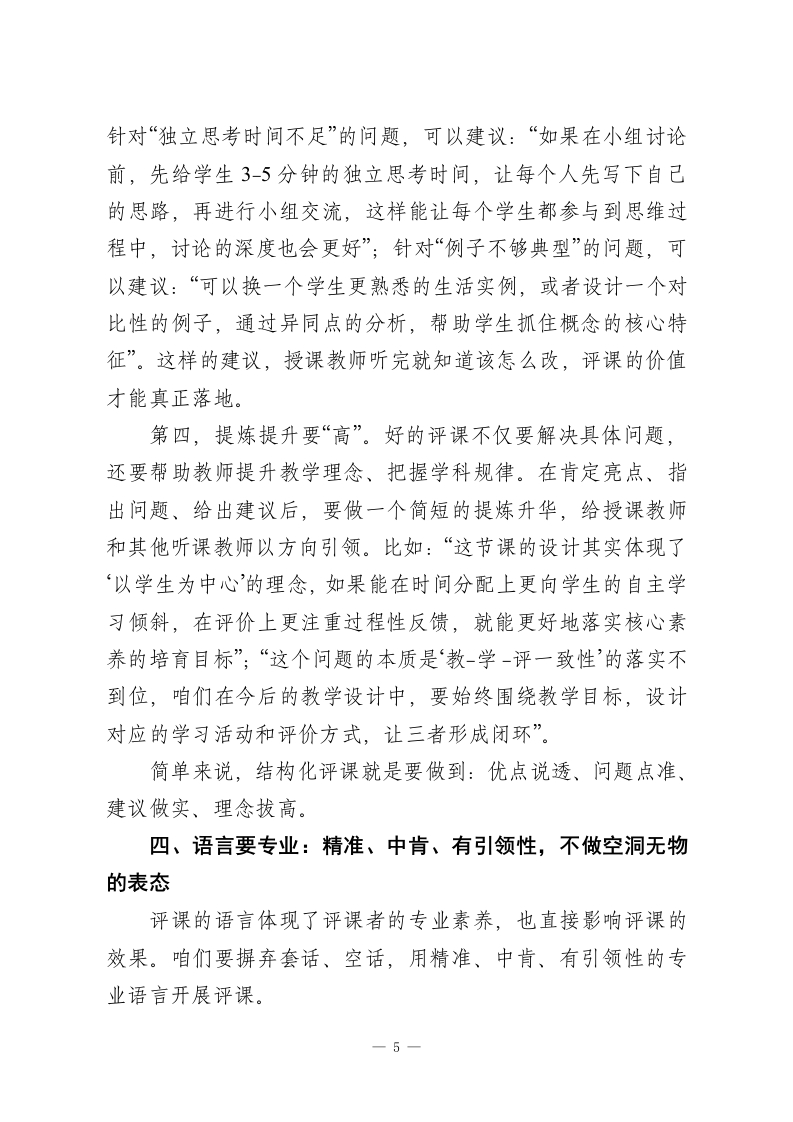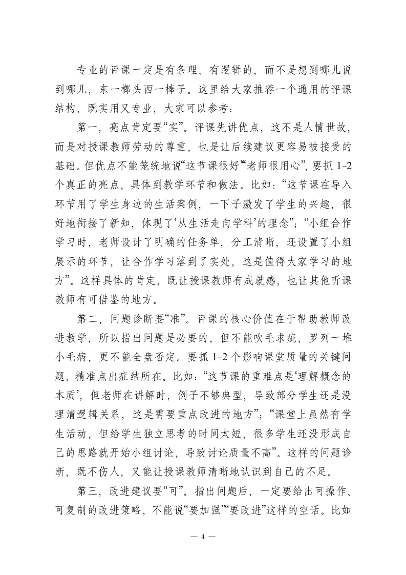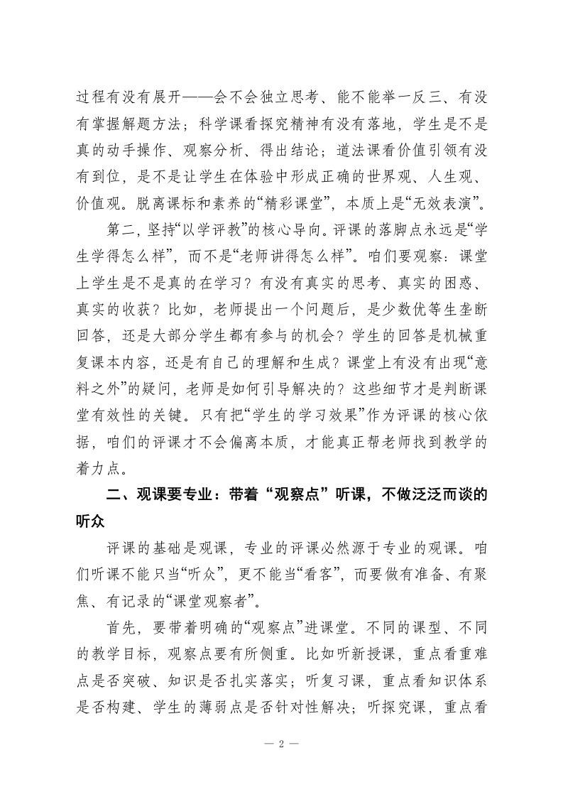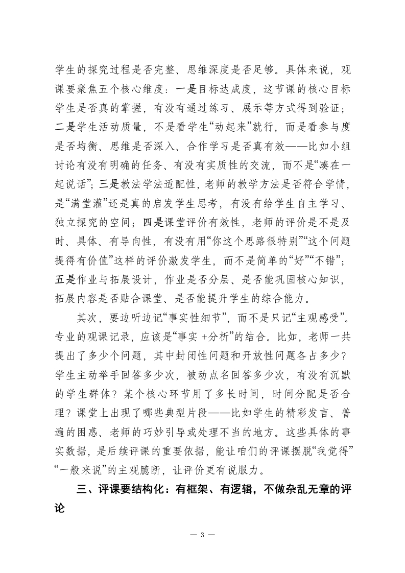 校长在教师例会上发言:如何让评课更具专业性各位老师,大家上午好!今天咱们齐聚一堂,想和大家深入聊聊一个核心话题一一如何让评课更具专业性。在座的每一位都是教学一线的中坚力量,咱们都清楚,评课不是简单的“说好话*“挑毛病”,它是助推教学质量提升、促进教师专业成长的关键抓手,更是咱们学校打造高效课堂、培育核心素养的重要支撑。真正专业的评课,说到底就三个字:有标准、有依据、有方法,坚决不凭感觉下判断、不凭喜好定优劣、不搞人情走过场。接下来,我结合自己的教学管理经验和大家的实际教学场景,和各位具体聊聊怎么把评课的专业性落到实处。一、先立住专业“标尺”:用课标说话,不拿经验代替标准评课首先要解决“凭什么评”的问题,这个“凭”就是咱们的专业标尺一课程标准和学科本质而不是个人多年的教学经验。第一,对标课标看核心素养。咱们评课,不能先看课堂“热闹不热闹“氛围活不活跃”,更不能觉得“老师讲得精彩就是好课。首要标准是看这节课的教学目标是否紧扣课标要求,是否指向学生的核心素养培育。比如语文课堂,不能只看老师朗读多有感染力、PPT多精美,关键看学生的语言运用能力有没有提升一一会不会准确表达、能不能逻辑思辨、有没有情感共鸣;数学课堂,不能只看学生做题对不对、速度快不快,核心看思维一1