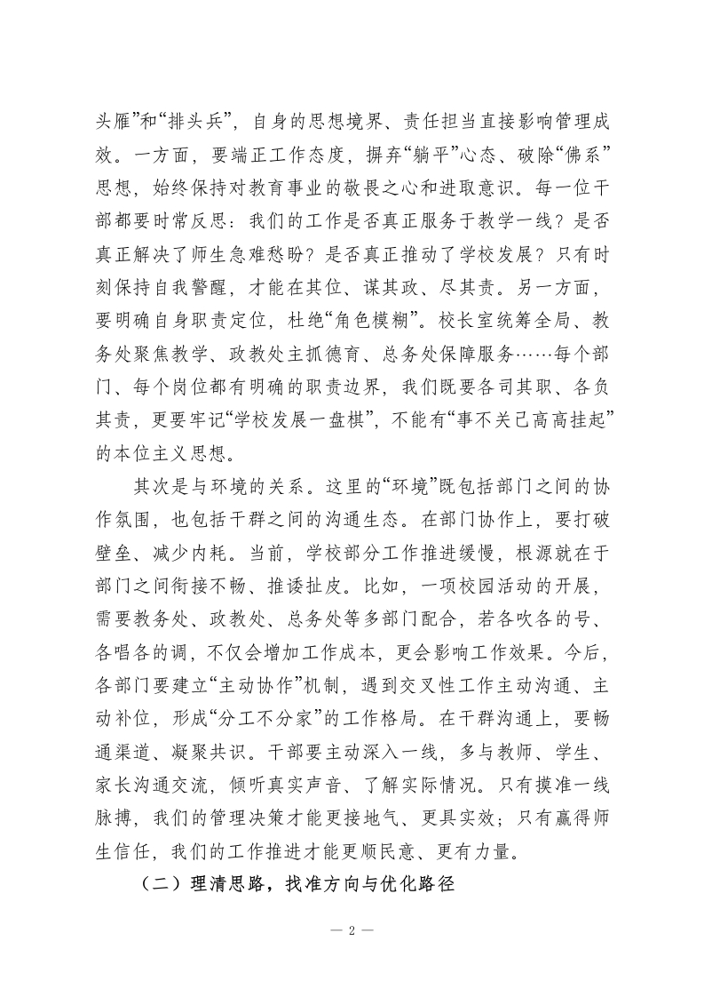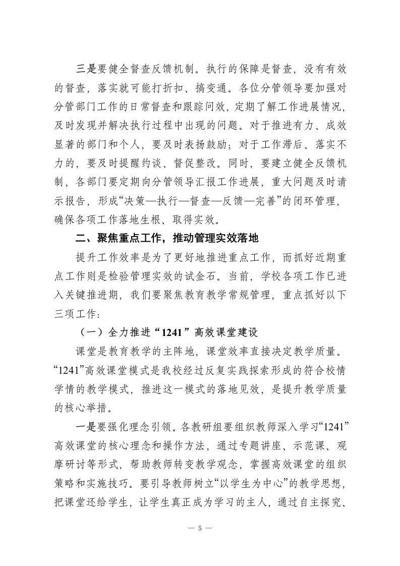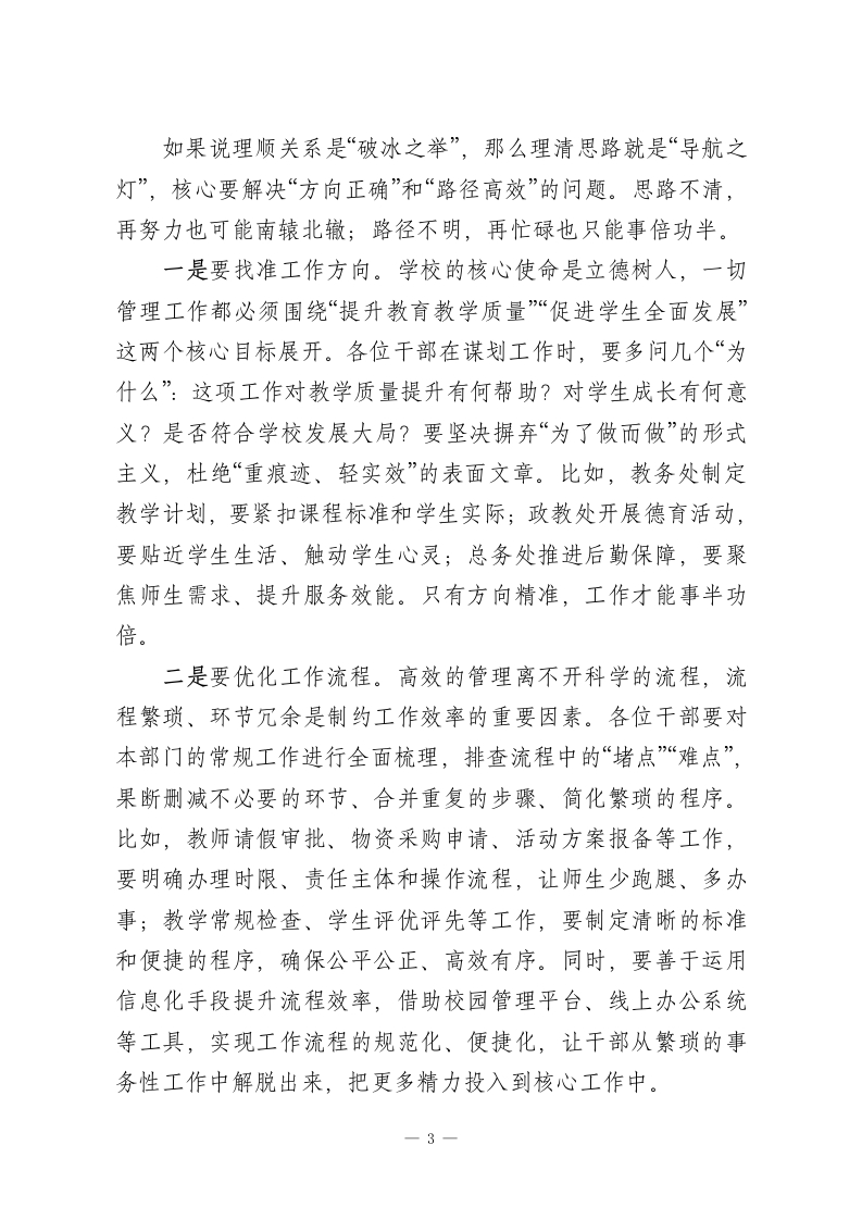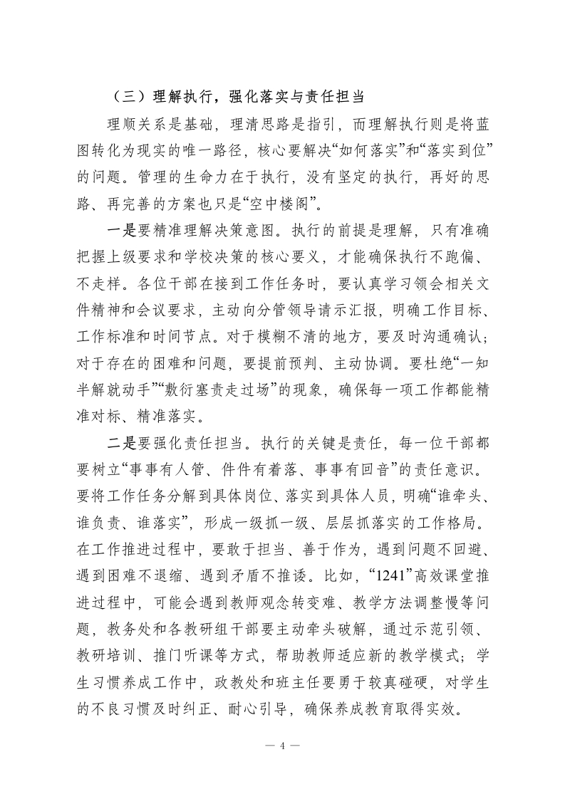 校长在四月份行政干部例会上的讲话:在管理中求实效各位行政干部:大家上午好!春潮涌动,万象更新,在这充满生机与希望的四月,我们齐聚一堂召开本次行政干部例会。教育管理是一项系统工程,更是一场需要久久为功的修行,而“实效”正是检验我们管理工作的核心标尺。没有实效的管理,如同无源之水、无本之木,既无法推动学校发展,更难以回应师生期盼与社会重托。今天,我们围绕“在管理中求实效”这一核心主题,重点强调两个方面的工作:一是通过“理顺关系、理清思路、理解执行”提升工作效率,二是聚焦教育教学常规管理抓好近期重点工作。希望大家以此次会议为契机,统一思想、凝聚共识,把各项要求转化为实实在在的行动,共同推动学校管理再上新台阶。一、提升工作效率,筑牢管理实效根基工作效率是管理实效的直接体现,而高效能的管理必然离不开清晰的关系、明确的思路和坚定的执行。在学校管理工作中,我们要从这三个维度精准发力,破解管理难题、激活工作动能。(一)理顺关系,破解思想与协作瓶颈理顺关系,本质上是解决“思想认知”和“协作机制”的问题,核心要处理好“与自我”和“与环境”的双重关系。首先是与自我的关系。作为行政干部,我们是学校发展的“领1