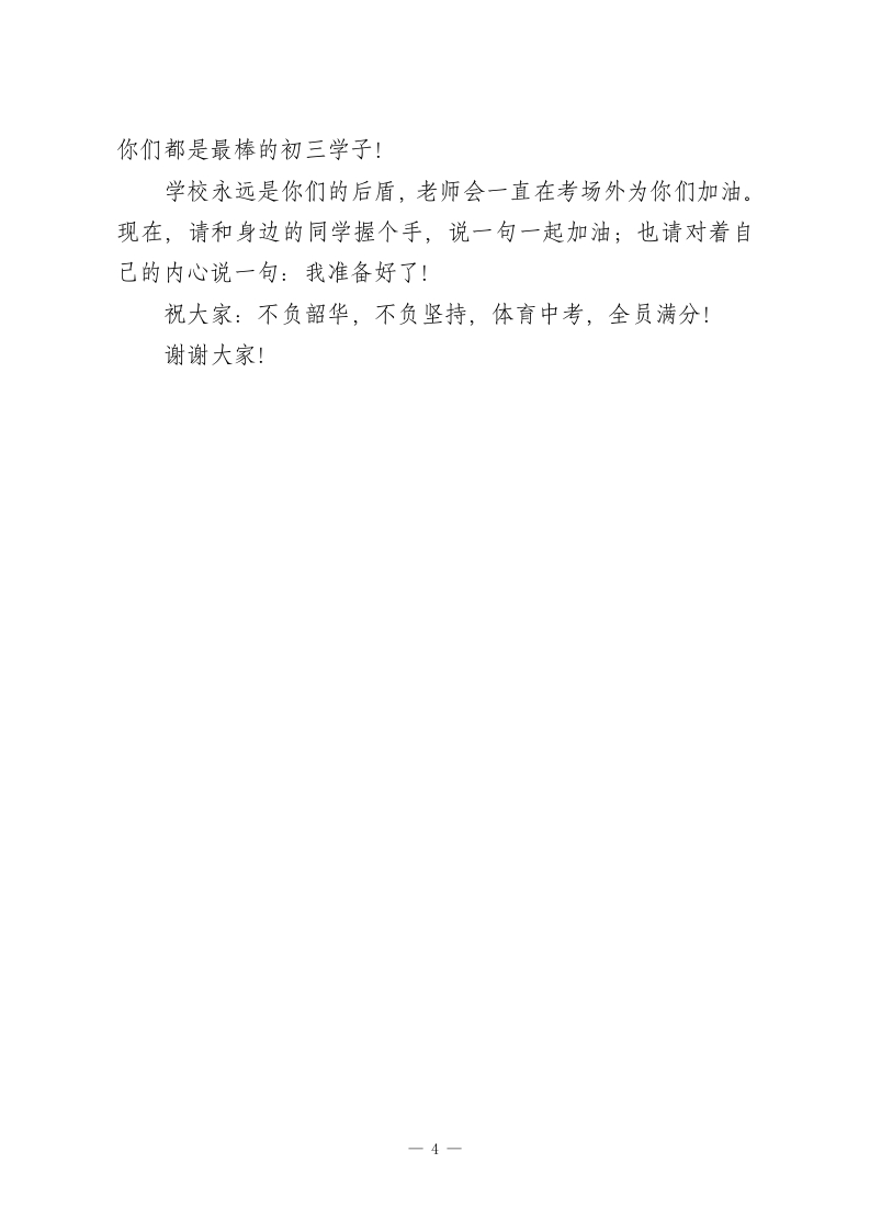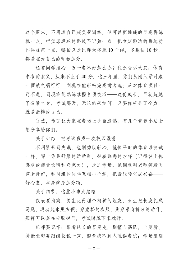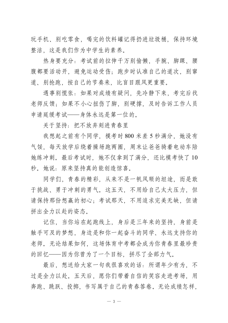 校长在体育中考动员大会上讲话:体育中考,是青春最燃的一次冲刺亲爱的初三同学们:当操场边的樟树又抽出新叶,当晨跑时的风里少了几分凉意,我们终于迎来了初中生涯里最热血的一场挑战一一还有五天,4月22日,体育中考就要来了。我知道,这几天的操场总能看到你们加练的身影:有人趁着课间操反复练习立定跳远,有人放学后缠着体育老师纠正实心球姿势,还有人拉着同伴一起冲刺800米、1000米。那些湿透的校服、发红的脸颊、磨破的运动鞋,都在悄悄诉说着你们的坚持。今天,我们不是来提要求、定规矩,而是想和大家聊聊:这场40分的考试,到底意味着什么?对每一个人来说,这40分都藏着不同的意义。或许你是文化课尖子生,正朝着重点高中的目标冲刺一这40分就是你稳操胜券的底气,多一分,就多一份超越对手的把握;或许你觉得自己在书桌前的优势不够明显,但运动场上的你总能闪闪发光一这40分就是你证明自己的舞台,告诉所有人:你从未放弃,只是在自已擅长的领域默默发力;或许你已经规划好未来要走进职校的课堂,想学一门喜欢的专业一一但请记得,职校的热门专业同样需要分数通行证,这40分能让你在选择专业时更有主动权,能让你未来的路走得更从容。我常听到有同学说:只剩五天了,再练也没用吧?其实不然。体育训练就像攒星星,每一次小小的进步都在为满分铺路。1
