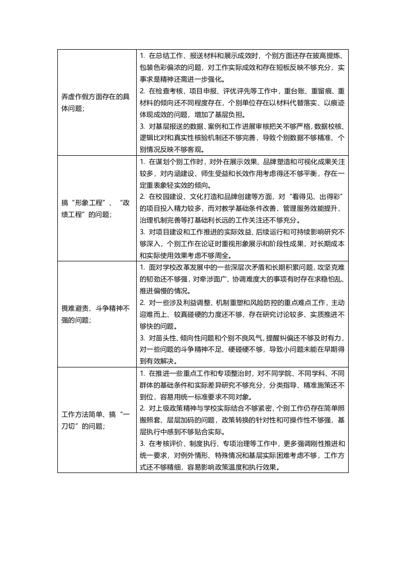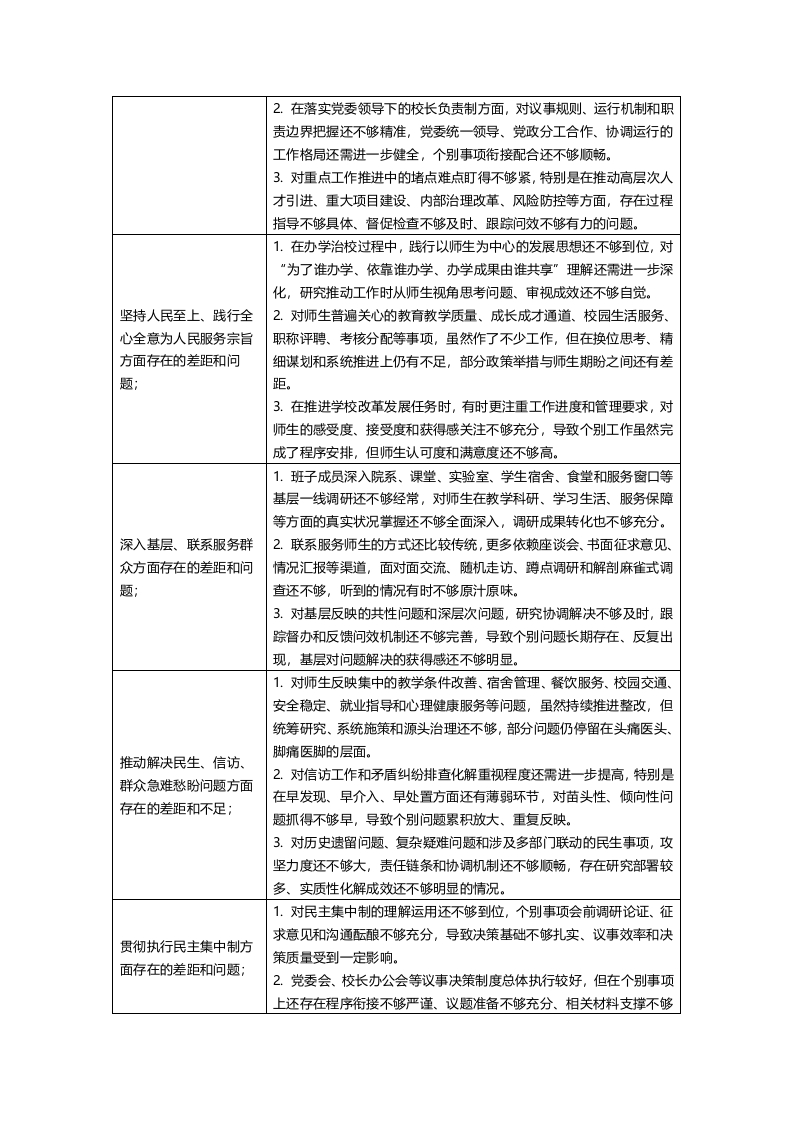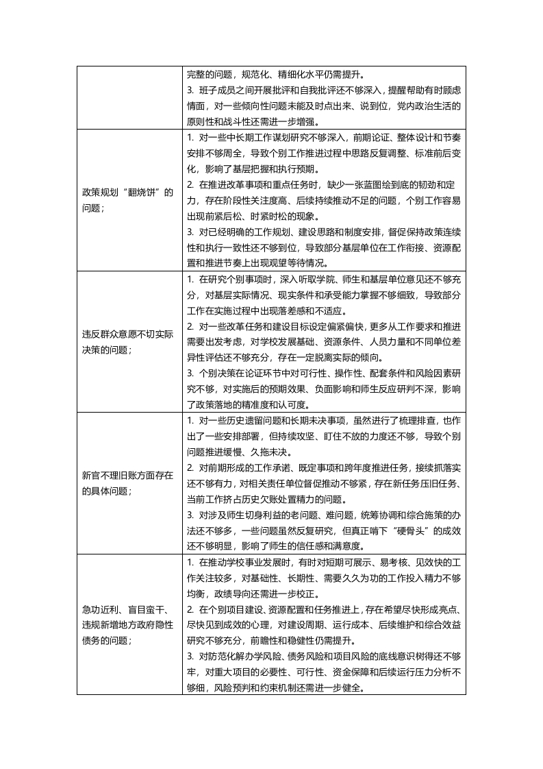 学习教育查摆问题清单(高校党委班子)填报单位(人):高校党委班子填报时间:存在问题具体表现1.对党中央关于教育、科技、人才一体推进以及立德树人根本任务的学习把握还不够系统全面,往往停留在传达学习和原则领会上,结合学校实际转化为年度重点任务、专项工作清单和责任台账还不够细致,导致有的工作落点不够准、抓手不够实。2.对党中央和上级党委关于高校党的建设、意识形态、人才培养、科落实党的大政方针和党研创新等重大部署,存在重安排部署、轻跟踪督办的问题,任务分解、中央重大决策部署方面过程调度、督查问效和结果运用衔接还不够紧密,压力传导到院系、存在的差距和问题:支部和具体岗位还不够充分。3.在推动党建工作与办学治校深度融合上办法还不够多,围绕立德树人、学科建设、师资队伍建设、科研平台打造、服务地方发展等重点任务统筹谋划还不够到位,个别领域仍不同程度存在党建业务“两张皮”、同频共振不够的问题。1.对习近平总书记关于教育工作、意识形态工作、思想政治工作和教师队伍建设的重要讲话重要指示批示精神,虽然能够及时组织传达学习,但在系统梳理、专题研讨和深度消化吸收上还不够,学思用贯通、知信行统一还有差距。落实习近平总书记重要2.在贯彻落实总书记重要讲话和重要指示批示精神过程中,有时更多讲话和重要指示批示精停留在会议传达、文件转发和表态部署上,结合学校发展所处阶段、神方面存在的差距和问学科特点和师生实际提出务实管用举措还不够,制度化、项目化、清题单化推进力度仍需加强。3.对贯彻落实情况缺少常态化“回头看”和全过程闭环管理,对哪些已经落地见效、哪些推进较慢、哪些还存在短板弱项掌握得不够及时精准,导致有的事项推进深度和落实成色还不够高。1.从服务国家战略和区域经济社会发展大局的高度谋划学校工作还不够主动,对学校在教育强国、科技强国、人才强国建设中的职责使命研究还不够深,个别工作仍然存在从学校自身出发考虑较多、从大局需要出发谋划不够的问题。树立“全国一盘棋”思2.在优化学科专业布局、调整人才培养方向、组织科研攻关和开展社想、服务服从大局方面会服务时,与国家战略需求、区域产业发展需求、地方经济社会发展存在的差距和问题;需求的对接还不够紧密,前瞻性布局和主动性融入还不够强。3.对一些涉及全局的重大改革事项和协同任务,统筹校内资源、打通部门壁垒、强化协同联动还不够到位,学院之间、部门之间在项目争取、资源使用、任务落实上还存在各自为战、统筹不足的现象。1.班子成员履行岗位职责还不够严实,对分管领域工作系统研究不对照岗位职责履职方面够、主动谋划不够,深入教学科研管理一线掌握实情、解决问题的频存在的差距和问题。次和深度还不够,存在重部署、轻落地的情况。