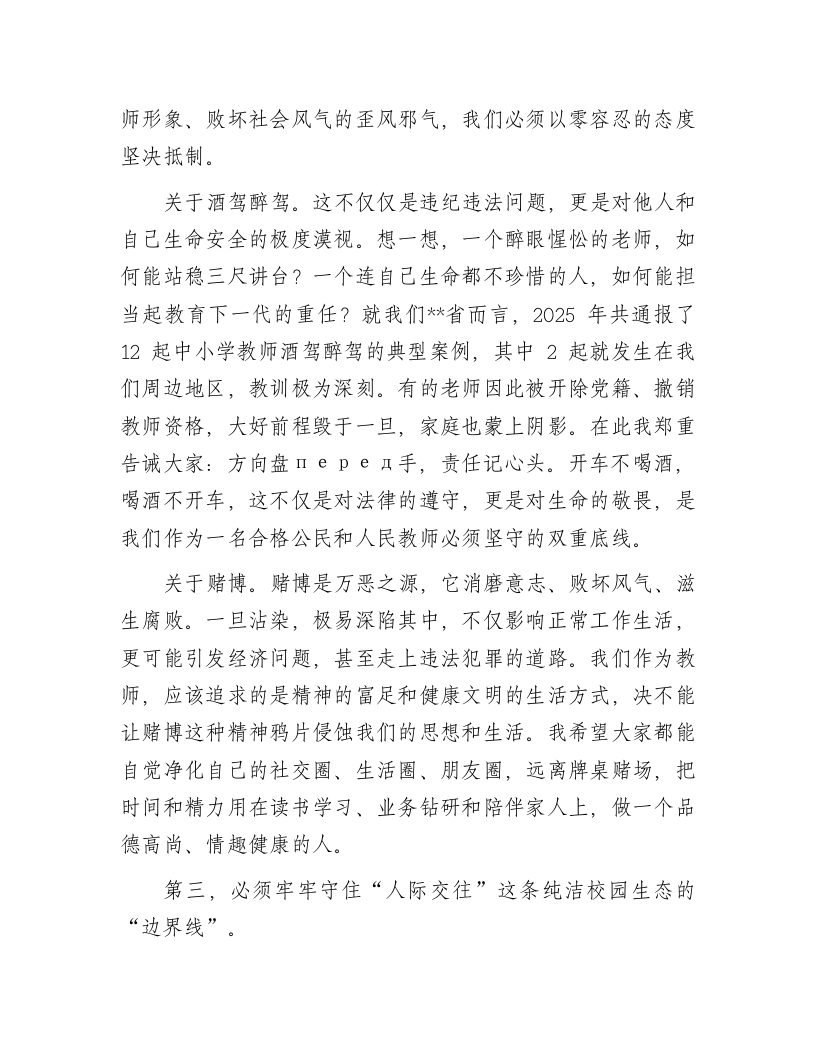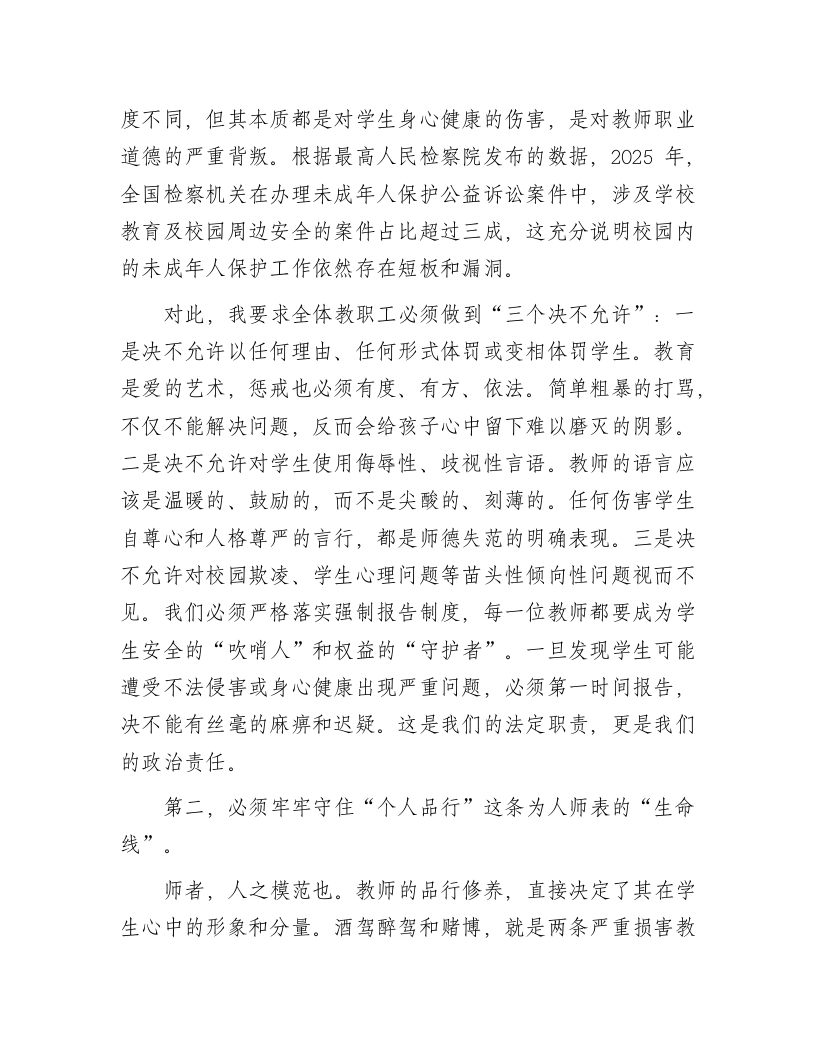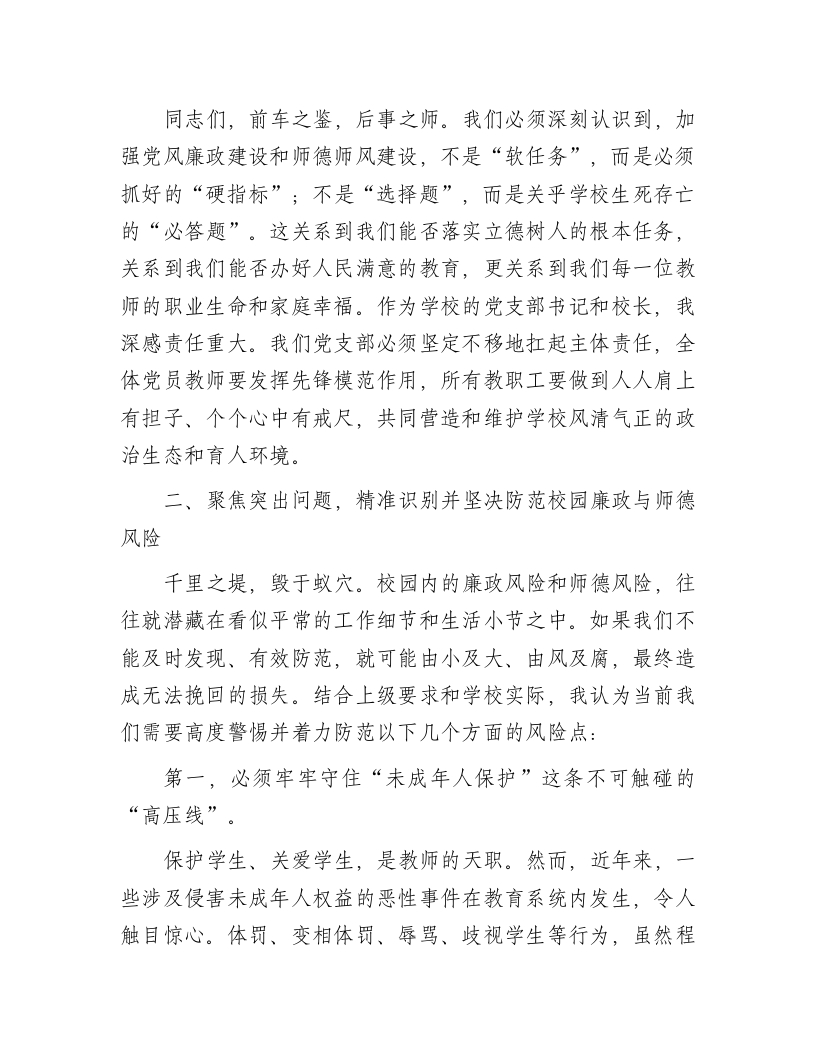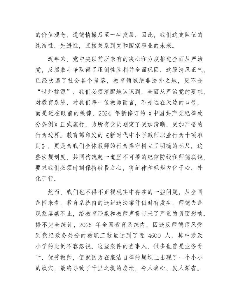在小学党风廉政建设专题党课上的讲话:守纪律正师风护成长同志们:今天,我们在这里召开全体教职工大会,共同开展一次以“守纪律、正师风、护成长”为主题的党风廉政建设专题学习。这既是一次深刻的纪律教育,也是一堂严肃的师德党课,更是一场触及灵魂的思想洗礼。目的就是要进一步统一思想、凝聚共识,引导我们全体教职工深刻认识新时代全面从严治党向纵深发展的新形势、新要求,准确把握教育工作者肩负的特殊使命与重大责任,从而以更加坚定的信念、更加清醒的头脑、更加务实的作风,共同守护好*小学这片教育净土,全力护航每一个孩子的健康成长。下面,我将围绕三个方面,与大家进行交流。一、提高政治站位,深刻领会新时代加强师德师风与廉政建设的极端重要性教育是国之大计、党之大计。党的二十大报告擘画了以中国式现代化全面推进中华民族伟大复兴的宏伟蓝图,明确提出要“办好人民满意的教育”。作为国民教育体系的基石,小学教育是立德树人的起点,是为孩子扣好人生第一粒扣子的关键阶段。我们每一位教师,不仅是知识的传授者,更是学生品德的塑造者、灵魂的工程师。我们的一言一行,直接影响着学生