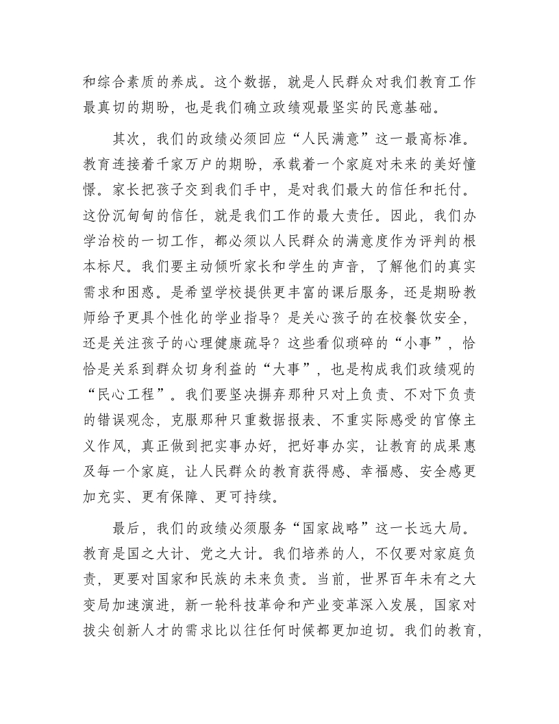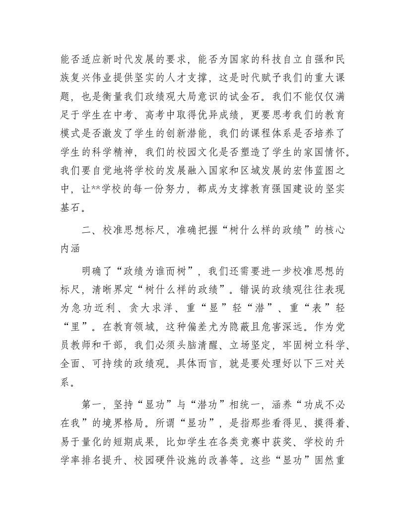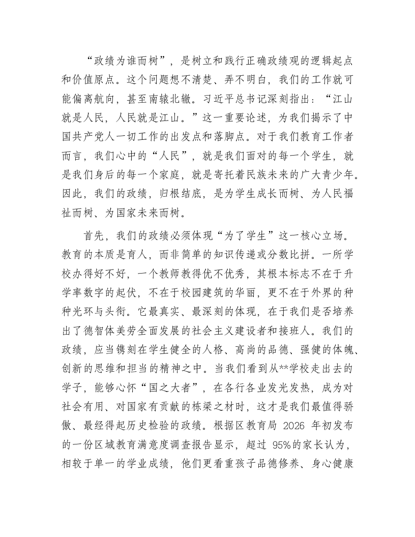 党课讲稿:践行正确政绩观当好学生引路人同志们:今天,我们齐聚一堂,召开学校树立和践行正确政绩观动员部署会,并借此机会,我以“践行正确政绩观,当好学生引路人”为题,与大家共同学习、深入交流。今年是“十五五”规划的开局之年,也是我们国家迈向全面建设社会主义现代化国家新征程的关键起步期。在这样一个承前启后、继往开来的重要历史节点,党中央在全党部署开展树立和践行正确政绩观学习教育,这不仅是一场深刻的思想淬炼和政治历练,更是一次精准的行动校准和方向指引。对于我们教育工作者而言,这堂“必修课”尤其具有极其重要和深远的现实意义。我们作为党的教育事业的忠诚实践者,作为塑造未来的灵魂工程师,必须深刻思考并清晰回答一个根本性问题:身处教育一线,我们的“政绩”是什么?我们应当为谁树立政绩、树立什么样的政绩、又该怎样树立政绩?这三个问题,构成了我们教育工作者正确政绩观的核心坐标。今天,我将围绕这三个问题,结合学校的实际情况,与同志们共同探讨,以期统一思想、凝聚共识、激发力量,共同推动学校的高质量发展。一、提高政治站位,深刻领悟“政绩为谁而树”的根本问题
