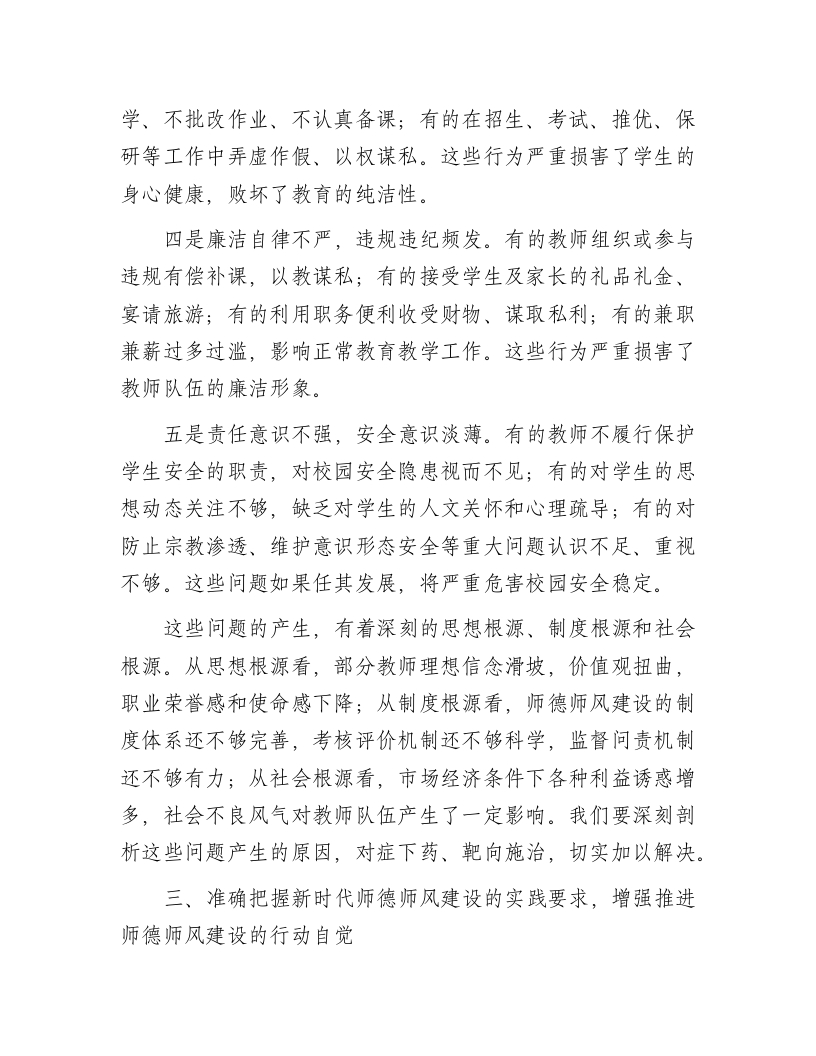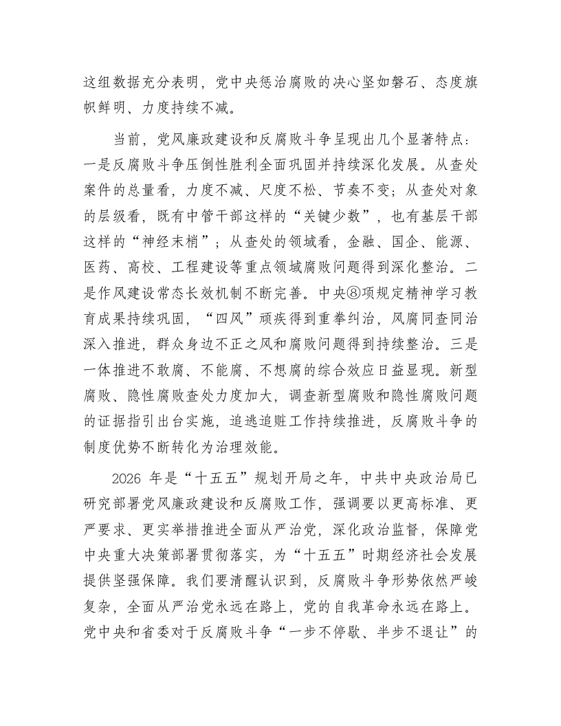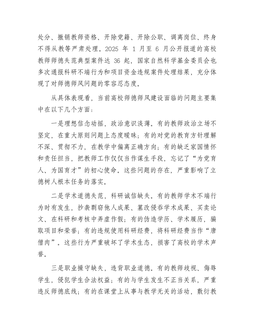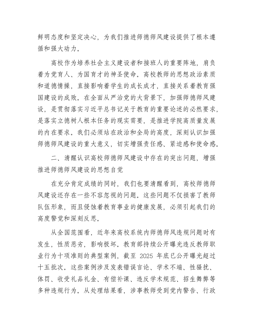 廉政党课:涵养崇高师德筑牢廉洁根基为推动学院高质量发展提供坚强保障同志们:根据校师德专题培训会议统一部署,今天,我结合工作实际,围绕师德师风建设这一主题,与大家进行一次深入的交流探讨。教育是国之大计、党之大计,教师是立教之本、兴教之源。师德师风建设事关教师队伍形象,事关教育事业兴衰,事关立德树人根本任务的落实。在新时代新征程上,我们要以更加坚定的政治自觉、更加清醒的思想认识、更加务实的工作作风,持续推动师德师风建设走深走实,为学院高质量发展筑牢坚实根基。一、深刻把握当前党风廉政建设和反腐败斗争形势,增强推进师德师风建设的政治自觉党的十八大以来,以习近平同志为核心的党中央以前所未有的勇气和定力推进全面从严治党,以雷霆之势开展反腐败斗争,取得了历史性、开创性成就。2025年,全国纪检监察机关立案78.9万件,处分67.7万人,中管干部64人落马,持续释放出全面从严、一严到底的强烈信号。2025年前十一个月,全国查处违反中央⑧项规定精神问题25.15万起,批评教育和处理32.68万人,其中党纪政务处分22.53万人。