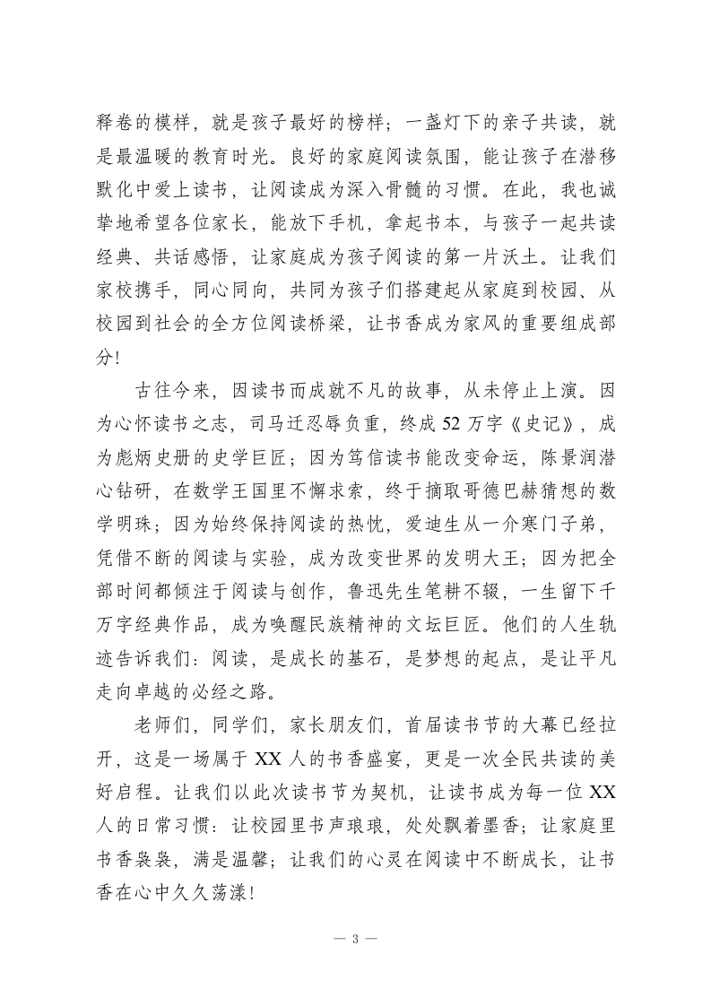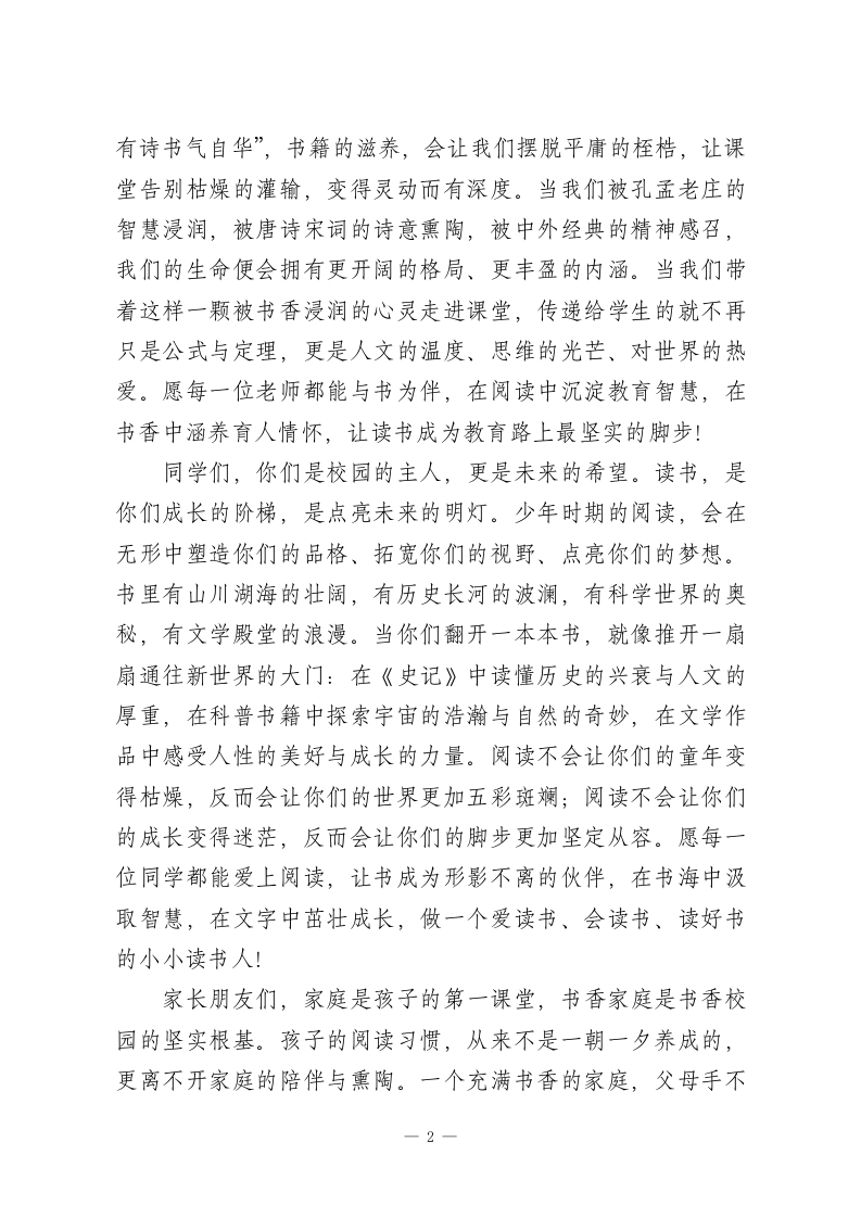 学校首届读书节开幕式上,校长讲话:以书为翼,赴春之约尊敬的各位领导、各位来宾,亲爱的家长朋友们,老师们、同学们大家上午好!春风拂校园,书香润心田。在这草长莺飞、万物勃发的丙午马年春日,我们满怀热忱与期待,齐聚一堂,共同迎来XX学校首届读书节的隆重开幕。首先,我谨代表学校,向莅临现场指导的各位领导、各界来宾表示最诚挚的欢迎!向长期以来关心支持学校发展的家长朋友们致以最衷心的感谢!向辛勤耕耘的全体教师和朝气蓬勃的同学们,致以最热烈的祝贺!古人云:“立身以立学为先,立学以读书为本。”读书,是与古今中外智者对话的桥梁,是让心灵穿越时空的旅程。当我们翻开书页,指尖触碰的不仅是油墨文字,更是人类文明的璀璨瑰宝;当我们沉浸书海,内心收获的不仅是知识的丰盈,更是精神的成长与蜕变。书,能让平凡的生命变得丰盈而深刻,能让迷茫的心灵找到方向与力量,更能让浮躁的心境回归宁静与本真。在这充满生机的春日里,我们以读书节为媒,让书香飘满校园,让阅读成为每一位X人的生活方式,这既是对经典文化的传承,更是对学校育人初心的践行。老师们,作为教育的践行者,读书是我们安身立命的根本,更是提升专业素养的必经之路。“师者,传道授业解惑也。”而要传好道、授好业、解好惑,唯有以书为梯,不断汲取养分。“腹1