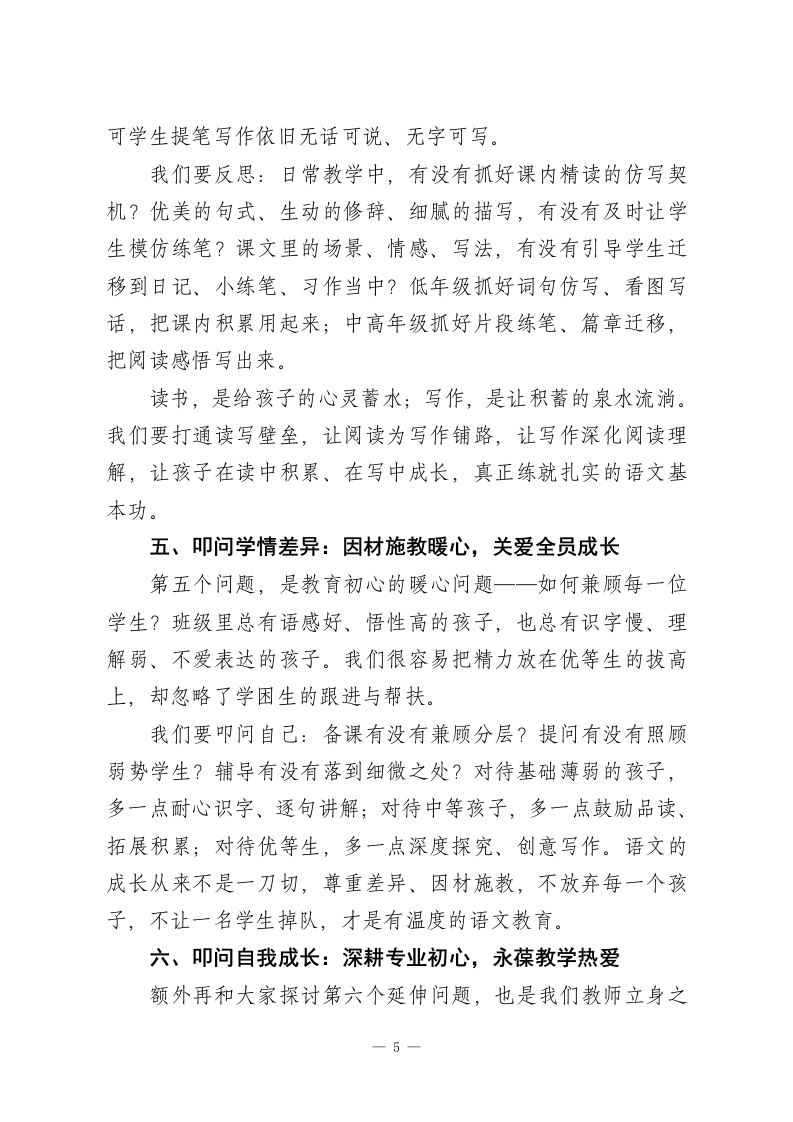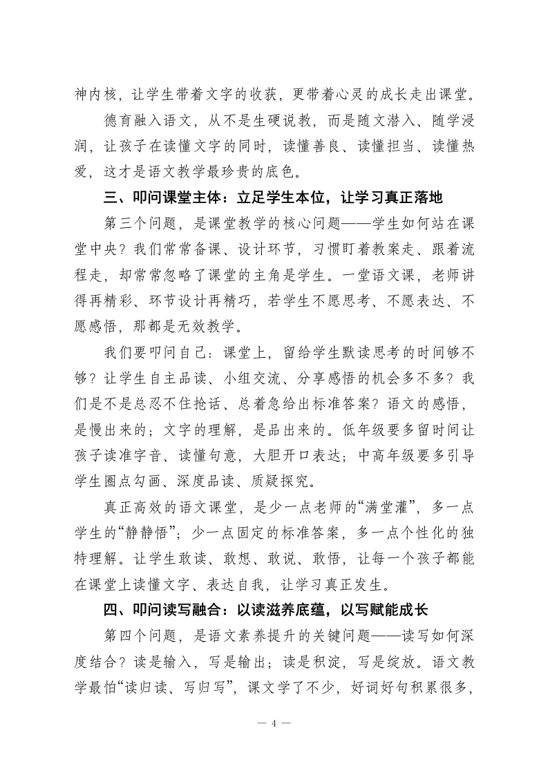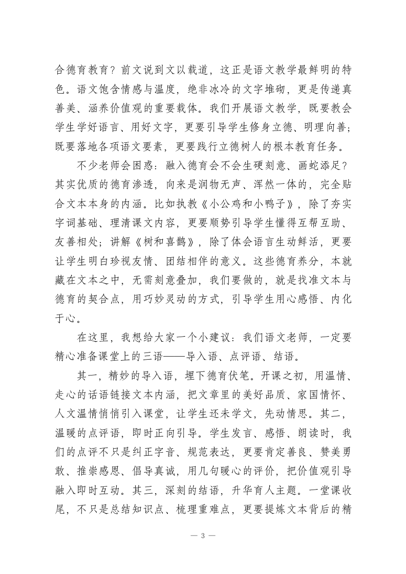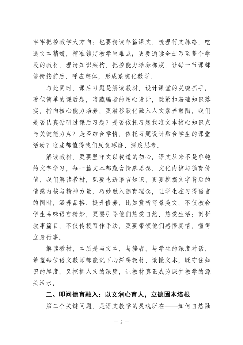 语文组教研活动后,校长总结讲话:读懂善良、读懂担当、读懂热爱各位语文教研组的老师们:大家下午好!今天我们欢聚一堂,开展这场务实走心、温情满满的语文教研研讨活动。刚才我们共同听课评课,交流教学感悟,剖析课堂难题。每位老师的分享,都藏着对语文教学的赤诚热爱;每一个独到见解,都凝结着扎根一线课堂的实践思考。深耕语文教育多年,我始终坚信:语文是一门有温度、有情怀、有深厚文化底蕴的学科,承载着传承中华文脉、滋养学生心灵、培育综合素养的重要使命。语文课堂,是我们传递文化力量、润泽学生心灵、培育时代新人的主阵地。一堂精彩的语文课,既能让学生夯实知识根基、提升语文能力,更能带领他们品读文字之美、体悟人文内涵、涵养美好品德。结合今天的听课收获与日常教学观察,我不侧重夸赞现有亮点,只想和大家静心反思,共同深究语文教学中最核心、最关键的六大问题:一、叩问教材解读:深耕文本深处,深挖育人内涵第一个核心问题,也是语文教学的立身之本一一该如何精准解读教材?常说备课必先吃透教材,但真正把文本读深、读透、读活,做到融会贯通,实则不易。解读教材,绝不能停留在通读课文、标注重点的浅层阶段,必须做到统筹全局、前后联动:既要研读单元导语,明晰单元人文主题与核心语文要素,1
