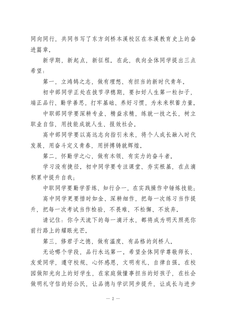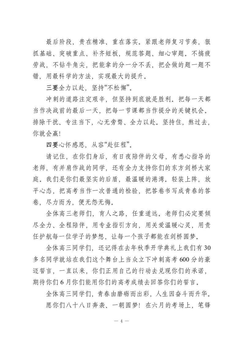 在2026年春季开学典礼暨高三迎高考88天誓师动员大会、高三成人礼仪式上校长讲话:青春由磨砺而出彩,人生因奋斗而升华尊敬的各位家长、老师、亲爱的同学们:大家上午好!春风浩荡启新程,奋楫扬帆向未来。今天,我们东方剑桥本溪校区全体师生欢聚一堂,隆重举行2026年春季开学典礼暨高三迎高考88天誓师动员大会、高三成人礼仪式。首先,我谨代表学校,向一直以来信任支持、默默付出、全程陪伴的全体高三家长朋友们表示热烈欢迎和衷心感谢。向辛勤耕耘、默默奉献的全体教职工,致以最崇高的敬意!向朝气蓬勃、奋发向上的全体同学,致以新学期最美好的祝福!向刚刚获奖的先进集体、先进个人表示热烈的祝贺。向朝气蓬勃、奋发向上的全体同学,致以新学期最美好的祝福!向冲刺中考的初三同学、尤其向即将成年、全力迎战高考的高三全体学子,致以最诚挚的敬意和最美好的祝愿:祝你们六月圆梦,蟾官折桂,金榜题名,马到成功。刚刚过去的一学期,是本溪校区全体师生同心同德、实干笃行的一学期。高中部稳中求进、学风浓厚;初中部夯实基础、全面发展;中职部技能精进、特色鲜明。三校三学段同根同源、