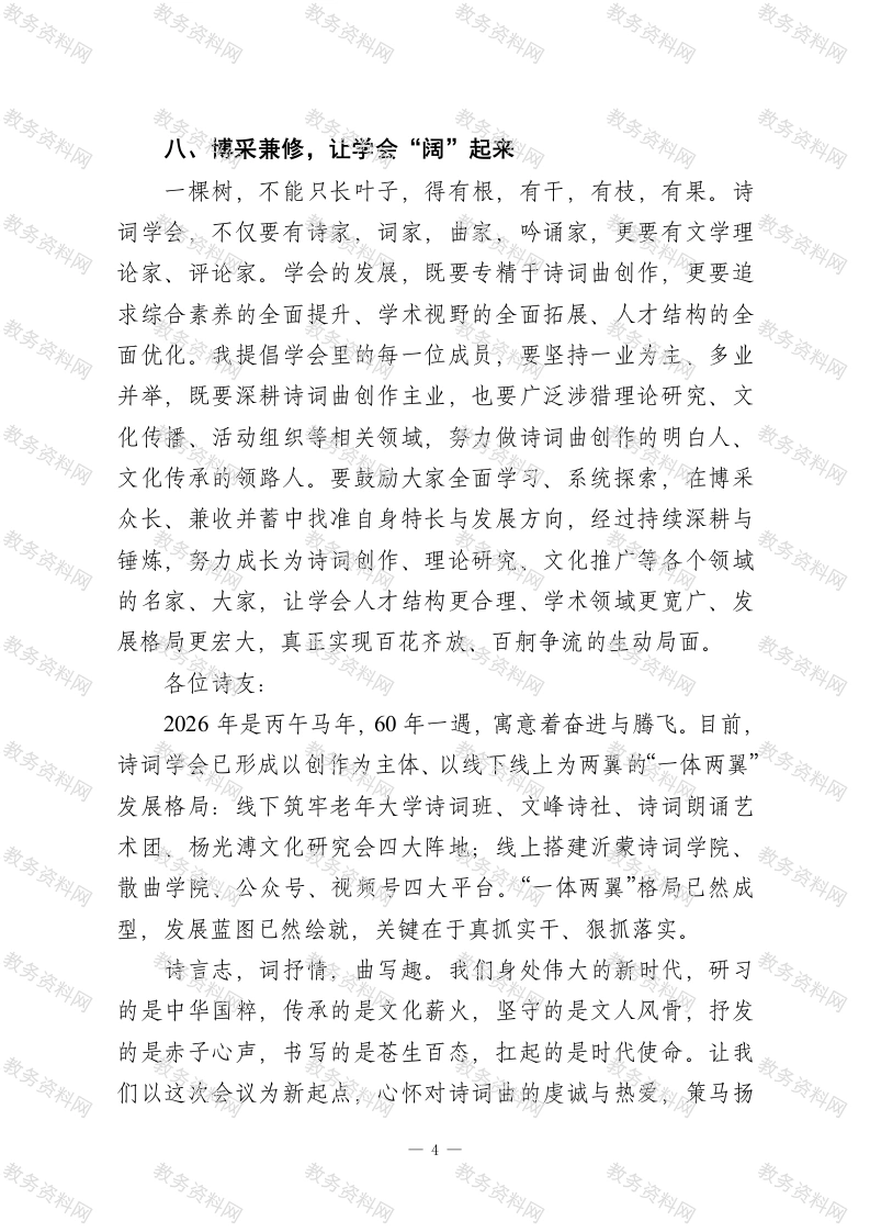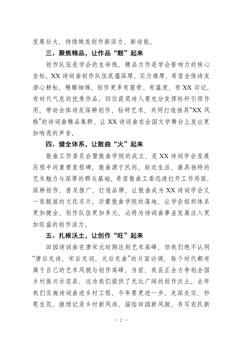 在XX诗词学会2026年工作会议上的讲话各位诗友:在这充满希望的春天里,我们齐聚一堂,共谋2026年的工作蓝图。刚才,我们圆满完成了各项议程,特别是各位领导的讲话,为今年的工作定下了基调、指明了方向。下面,我就做好今年的工作,讲几点意见,与大家共勉。一、永葆桂冠,让大树“长”起来十年前,在县委县政府的关怀下,在县政协的直接领导下,在诗词学会一班人的共同努力下,XX荣获“中华诗词之乡”称号。十年来,我们亲手栽下的这棵诗词青苗,在大家的精心浇灌下,已然长成参天大树、结出累累硕果。这是全体诗友的骄傲,更是学会至高的荣光。站在新的历史起点,我们既要守护好这份来之不易的荣誉、守护好这棵文化大树,更要深耕厚植、培根壮干,让它根深叶茂、四季常青,让“中华诗词之乡”这块金字招牌在新时代愈发璀璨闪亮。二、培根固本,让队伍“壮”起来诗词是文艺皇冠上的明珠。但是,我们也必须清醒地看到,当前诗词创作群体仍相对狭小。新的一年,我们要主动作为、广纳贤才,精心培育各年龄段诗词爱好者。今年省诗词学会将启动青年诗人培养计划,我们要借势发力、乘势而上,扎扎实实抓好青少年诗词创作队伍建设。依托老年大学诗词班、沂蒙诗词学院、散曲学院三大平台,构建“凝聚老年、带动中年、吸引青少年”的全年龄段人才培养格局,推动诗词曲创作队伍不断1