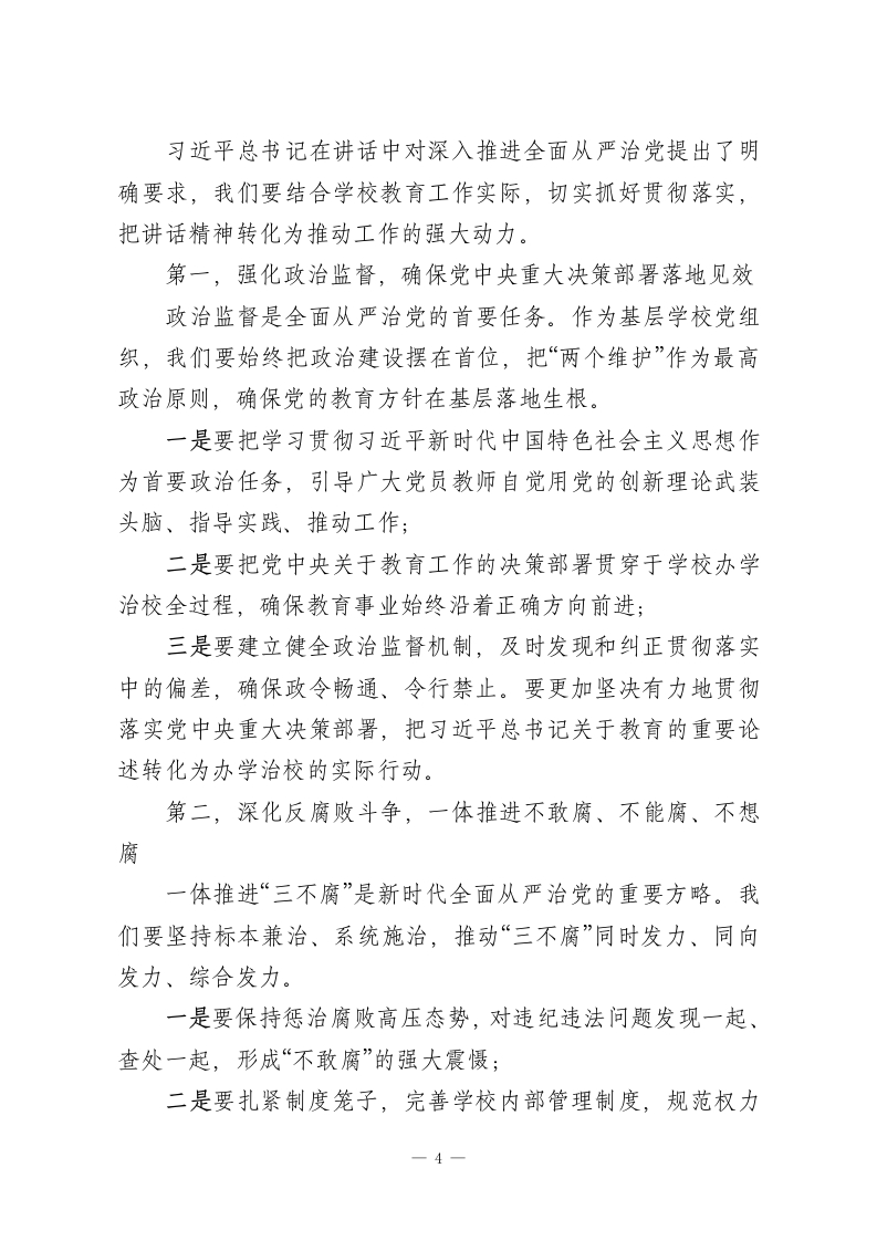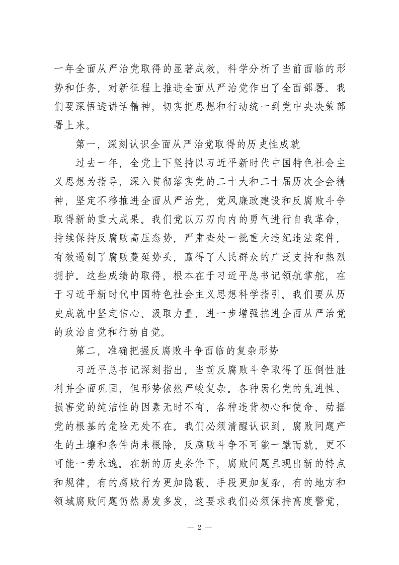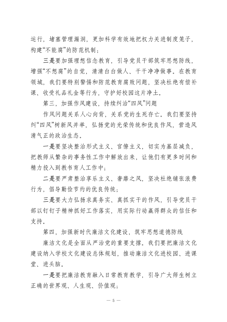 在XX市XX小学党支部2026年第一季度党课上的讲稿各位党员同志:大家好!今天,我们召开2026年第一季度党课活动,主题是“以永远在路上的坚韧和执着推进全面从严治党”,主要内容是学习习近平总书记在二十届中央纪委五次全会上的重要讲话精神。此次党课面向全体党员同志开展,旨在深入学习领会总书记重要讲话的精神实质和实践要求,进一步统一思想认识、强化责任担当,推动全面从严治党在学校基层落地生根、开花结果。今年1月12日至14日,二十届中央纪委五次全会在北京胜利召开。习近平总书记在会上发表重要讲话,深刻分析了当前反腐败斗争面临的复杂形势,对新征程上深入推进全面从严治党、党风廉政建设和反腐败斗争作出了战略部署,为我们在新时代新征程上坚定不移推进党的自我革命提供了根本遵循。2026年是“十五五”规划开局之年,也是教育强国建设的关键之年。在这一重要历史节点,深入学习贯彻总书记重要讲话精神,对于我们深刻把握全面从严治党新形势新任务,以高质量党建引领教育事业高质量发展,具有重大而深远的意义。下面,我从三个方面和大家交流学习体会。一、深刻领会讲话精神的核心要义,筑牢思想根基习近平总书记在二十届中央纪委五次全会上的重要讲话,高屋建瓴、视野宏阔、思想深邃、内涵丰富,系统总结了过去1