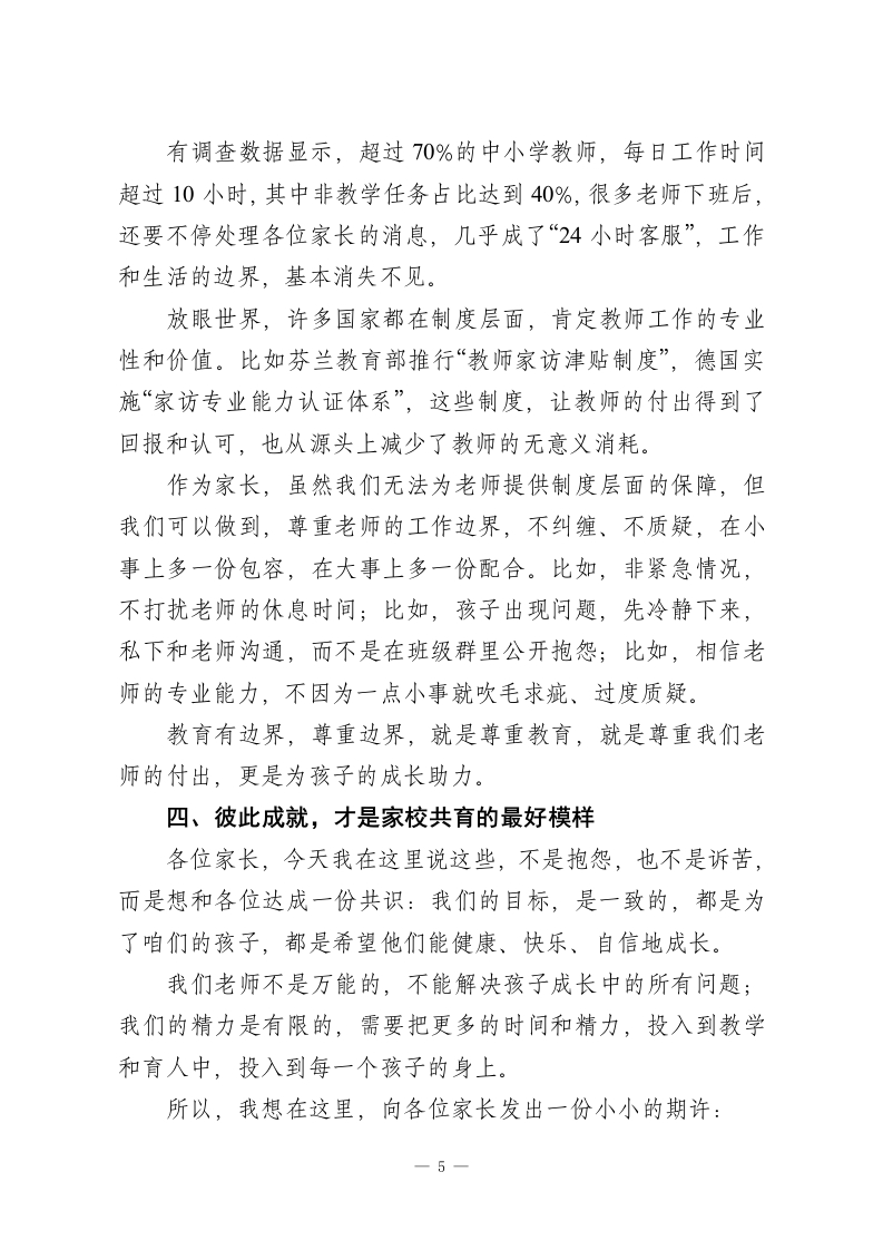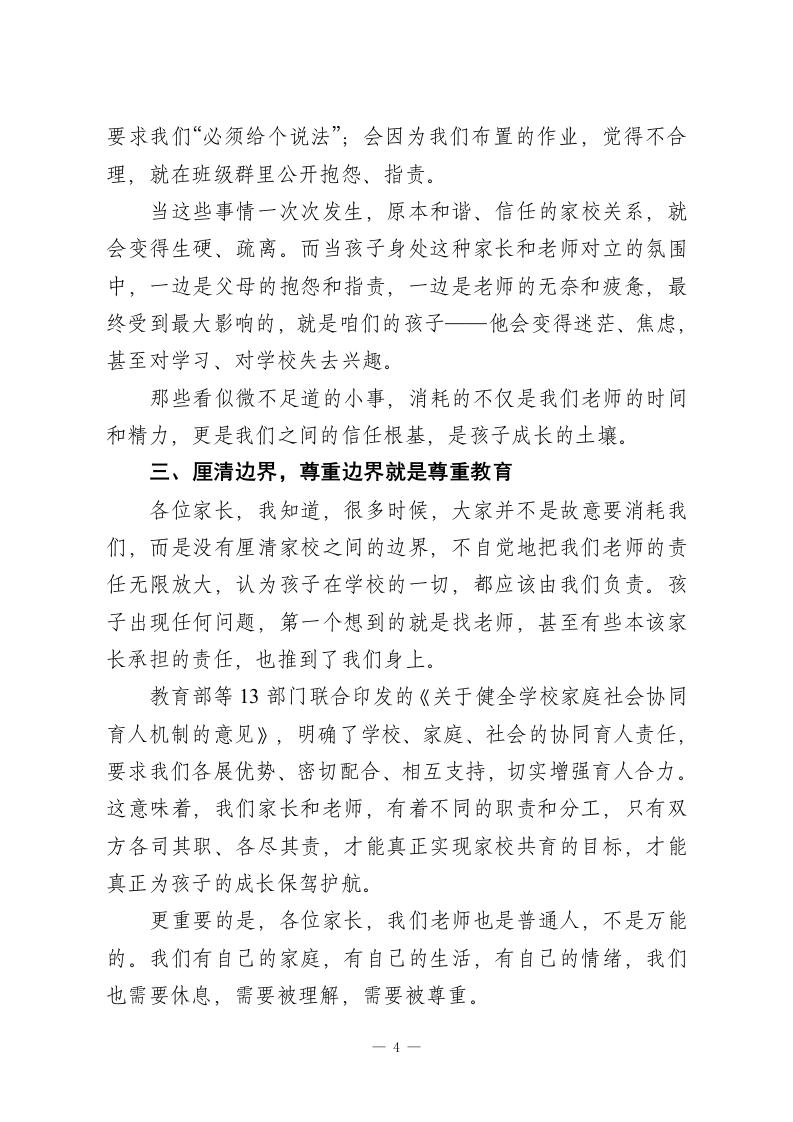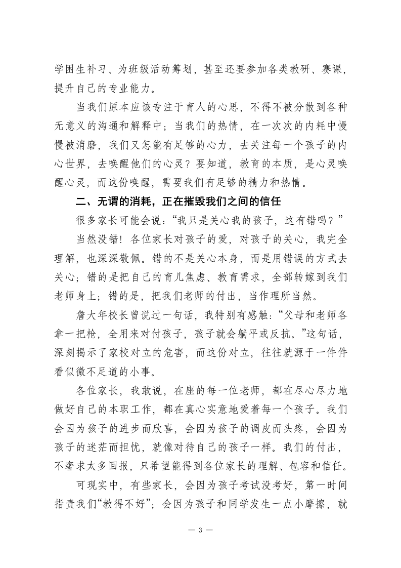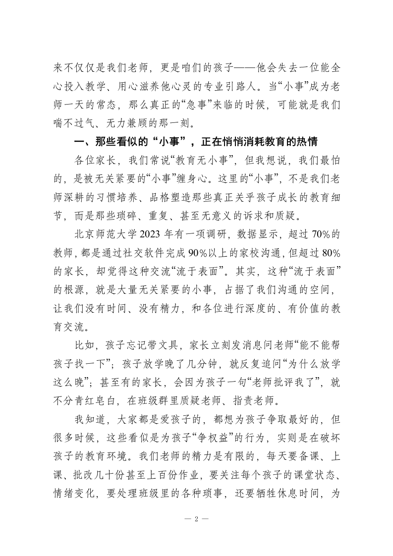 在家长会上老师发言:家长千万不要在小事上消耗老师尊敬的各位家长:大家晚上好!首先,特别感谢各位在百忙之中抽出时间,来参加这次家长会。作为孩子们的老师,我一直觉得,教育从来不是我们老师单方面的事,而是一场我们家校携手、彼此配合、共同奔赴的旅程。今天站在这里,我不想讲太多生硬的大道理,也不想罗列孩子们的成绩排名,就想和各位家长掏心窝子聊一聊一家长多一份包容,老师就多一份动力;家长多一份配合,老师就多一份信心;家长不消耗老师,老师才能给孩子更好的教育。这句话,不是一句口号,而是我们一线教师日复一日的真切感受。三十年前,家长和老师的沟通,一学期不过两次:开学家长会碰个面,说说孩子的新学期期许;期末家长会聚一聚,聊聊孩子的成长进步。简单、纯粹,却格外踏实。可现在,社交软件让我们的沟通变得前所未有的便捷,指尖轻轻一点,两秒就能敲出一句“老师,在吗?“老师,我家孩子今天怎么样?“老师,作业能不能少布置一点?”我知道,各位家长敲下这些字的时候,心里全是孩子,这份牵挂和重视,我完全理解。可大家不知道的是,当这些琐碎的诉求,一天又一天、一次又一次涌来,我们老师的时间和精力,就被一点点切割、消耗。而最终为这些“小事”买单的,从1