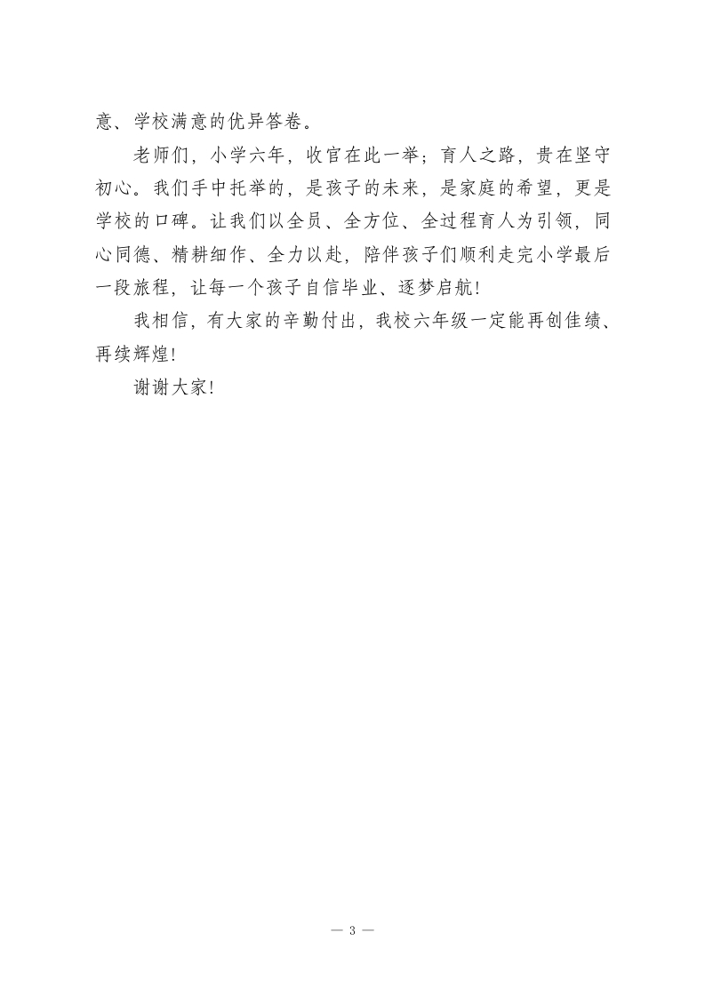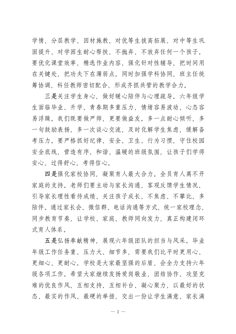 在六年级教师工作会上的讲话:凝心聚力精耕细作全力护航毕业季各位六年级的老师们:大家好!今天我们专题召开六年级教师工作会,核心只有一个:统一思想、压实责任、精准发力、协同攻坚,全力做好毕业年级教育教学与管理各项工作,为孩子们的小学时光画上圆满句号,为他们迈向初中打下坚实基础。六年级是小学阶段的收官之年、关键之年、冲刺之年,更是检验我们办学质量、落实全员、全方位、全过程育人的核心阵地。在座各位都是学校的骨干、家长信任的依靠、学生成长的引路人,责任重大,使命光荣。借此机会,我向全体六年级教师提几点希望与要求,与大家共勉。一是坚守育人初心,把三全育人落到毕业年级每一处。全员育人,要求我们科任教师、班主任、后勤管理全员上阵、人人有责,不做旁观者,不当局外人,每一位老师都要主动关心学生、关注学情、关爱成长;全方位育人,要把课堂教学、习惯养成、心理疏导、安全教育、品德教育融为一体,既抓成绩,更抓做人,既重知识,更重品行;全过程育人,要从早读、课堂、作业、辅导、午休、放学,直至家校沟通、毕业活动,环环相扣、步步紧跟,让教育无时不在、无处不在。二是聚焦教学质量,做到精准施策、精细备考。毕业年级教学,目标要清、重点要明、方法要实。各位老师要认真研读—1