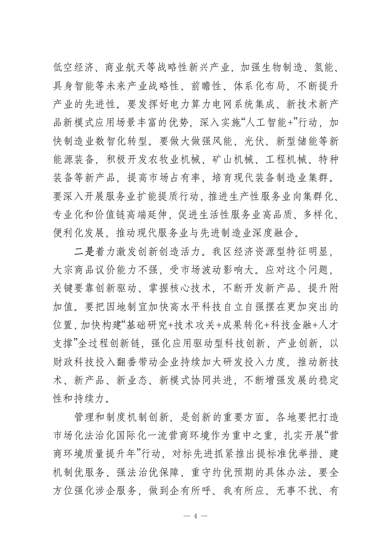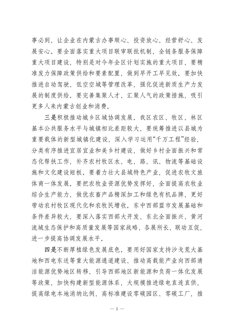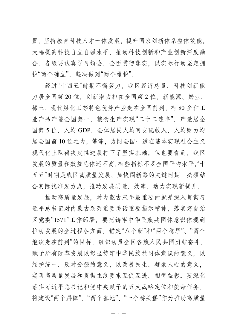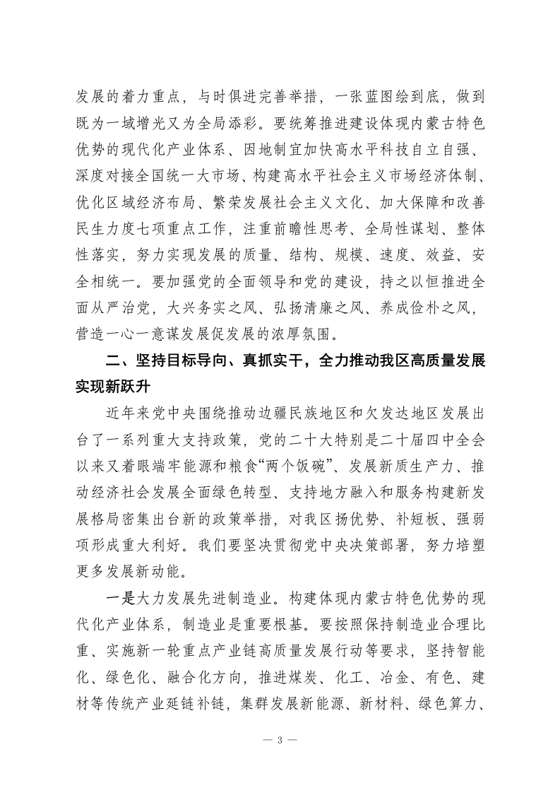 在全区推进高质量发展大会上的讲话我们以高质量发展为主题召开“XX第一会”、吹响奋战“十五五”开局之年的“集结号”,目的是动员全区上下深入贯彻党的二十大和二十届历次全会精神,认真落实中央经济工作会议部署,深入贯彻习近平总书记对内蒙古系列重要讲话重要指示精神和《国务院关于推动内蒙古高质量发展奋力书写中国式现代化新篇章的意见》,按照自治区党委“1571”工作部署,振奋精神、迅速行动,扎实做好经济社会发展各项工作,努力实现“十五五”发展开门红。一、深入学习贯彻习近平总书记重要论述,切实增强推动高质量发展的责任感紧迫感高质量发展是全面建设社会主义现代化国家的首要任务,是新时代的硬道理。党的二十届四中全会提出“十五五”时期继续以推动高质量发展为主题,并将“坚持高质量发展”作为必须遵循的六个原则之一、把“高质量发展取得显著成效”置于七项主要目标之首,进一步突出了高质量发展在中国式现代化建设全局中的重要地位。习近平总书记特别强调,要以新发展理念引领发展,加快培育新动能,促进经济结构优化升级,做优增量、盘活存量,保持质的有效提升和量的合理增长,推动经济持续健康发展和社会全面进步;要坚持把发展经济的着力点放在实体经济上,优化提升传统产业,培育壮大新兴产业和未来产业,促进服务业优质高效发展,构建以先进制造业为骨干的现代化产业体系;要把发展新质生产力摆在更加突出的战略位1