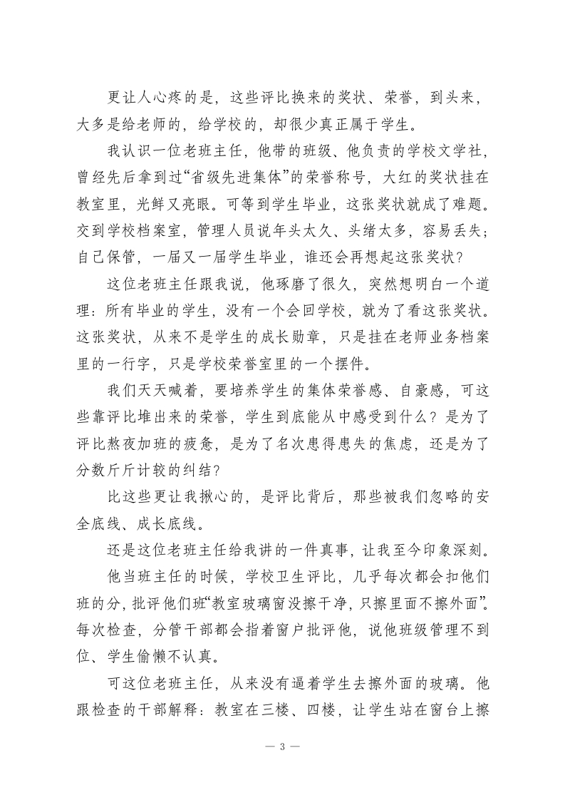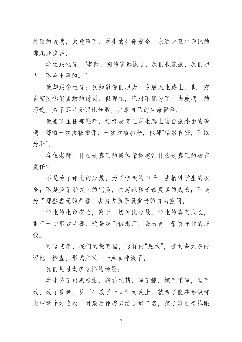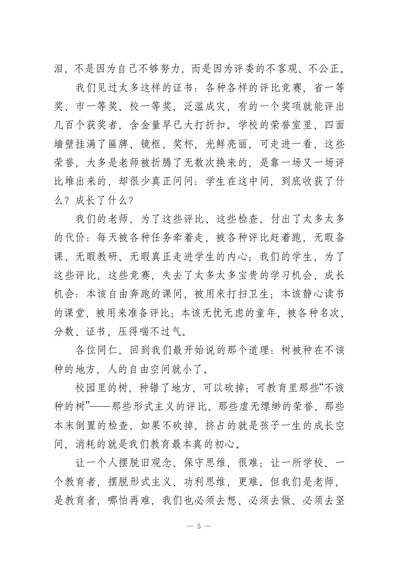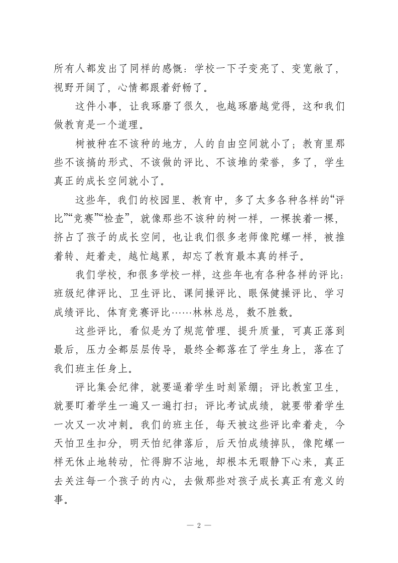 在全体教职工会议上校长讲话:少种不该种的树,多留成长的空间各位老师、各位同仁:大家好!最近和几位校长朋友交流,又想起前几年疫情期间,我们校园改造时发生的一件小事,至今想来,仍对我们的教育工作有很深的启发。当时因为学生居家上网课,学校趁着这段时间整修校园环境,专门请来了专业的校园规划设计师帮忙整体设计。这位设计师走遍了校园的每一个角落,看完之后,给我们提了一个让所有人都意外的建议:把校园中心位置的几十棵树,全部砍掉。当时我们很多人都不理解,甚至觉得这位专家的想法太离谱。这么多年来,我们一直都在强调校园要多绿化、多植树,“绿化好”早已成了校园建设的标配,砍树简直是违背常理,甚至是一种“罪过”。校园里的树长得枝繁叶茂,在我们眼里,这是校园美丽的标志,怎么能随便砍掉呢?可设计师的一句话,点醒了我们所有人。他说:你们的校园本身空间就不大,过度绿化,树都种在了不该种的地方,看似是美化环境,实则是挤占了学生最需要的活动空间。校园不是植物园,不是树越多越好,而是要给学生留出开阔、敞亮的活动场地,让孩子能跑、能跳、能舒展身心。我们将信将疑,最终还是按照设计师的建议,清理了校园中心的几十棵树。等到疫情结束,师生返校重新走进校园时,一1