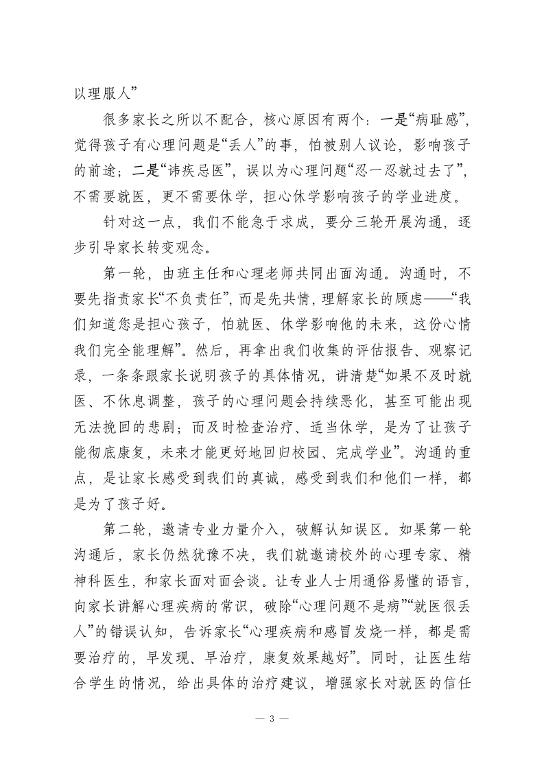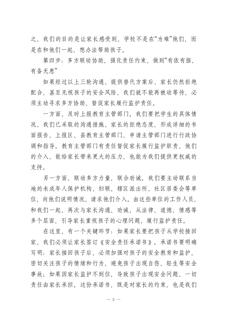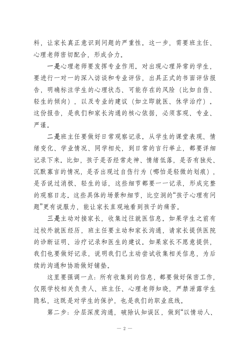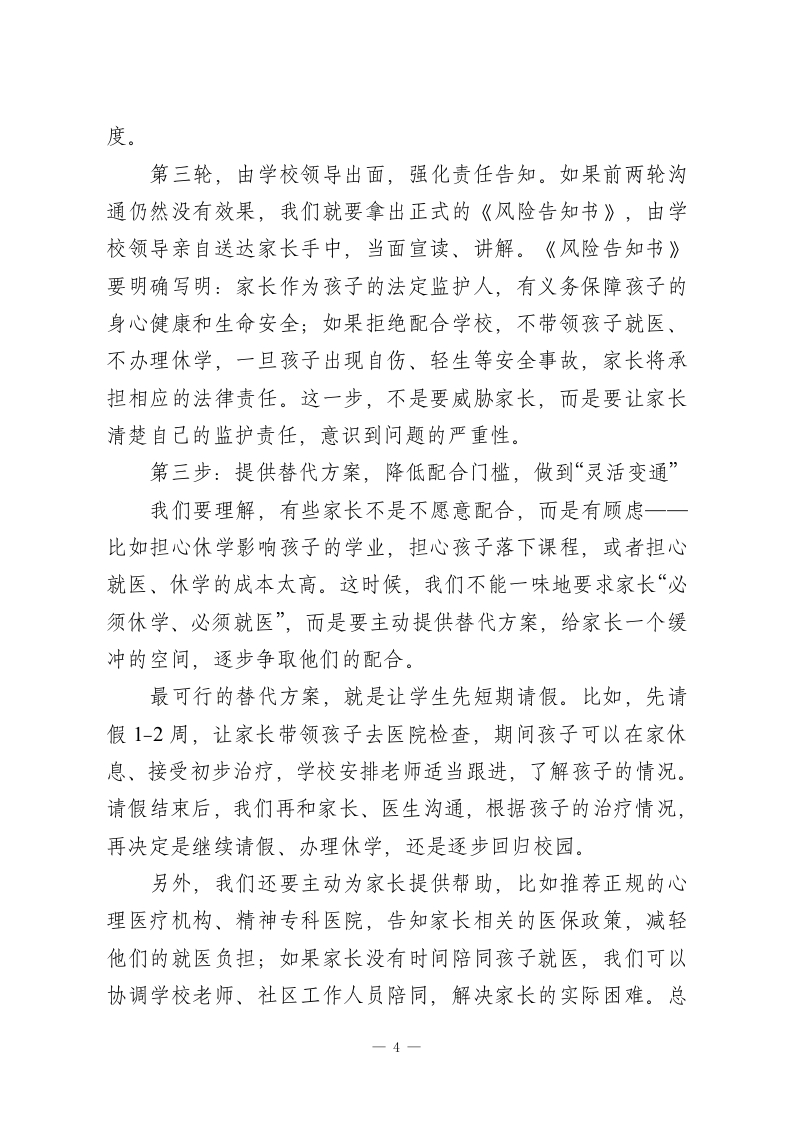 在全校教职工会议上校长发言:学生有严重的心理问题,家长不配合怎么办各位老师、各位同仁:大家晚上好!今天我们召开这次专题会议,重点探讨一个近期困扰着很多校长、很多班主任的迫切问题一一学生心理问题已经非常严重,有的孩子甚至出现自伤自残、流露轻生念头,但家长却始终拒绝带孩子去检查治疗,也不办理休学手续,无视孩子的安全与健康。作为教育工作者,我们看着孩子深陷痛苦,却因为没有强制权而束手无策,那种无力感,我感同身受。但大家要记住,我们没有强制家长的权力,不代表我们没有解决问题的办法。法律和相关规定,已经为我们指明了清晰、合法的处理路径。今天,我就结合咱们学校的实际,结合各地的实践经验,和大家详细说说,遇到这种情况,我们该怎么做、做什么,既守护好每一个孩子,也规避学校的办学风险。首先要明确一个核心原则:我们的一切行动,都要围绕“保护学生安全、促进学生健康”展开,既要坚定地履行教育责任,也要理解家长的顾虑,循序渐进、有理有据地推进,不激化矛盾,不推卸责任。具体来说,我们可以按照以下五个步骤,有序处理。第一步:全面收集信息,精准评估风险,做到“有凭有据”想要说服家长,空口无凭,必须拿出详实、有说服力的材-1