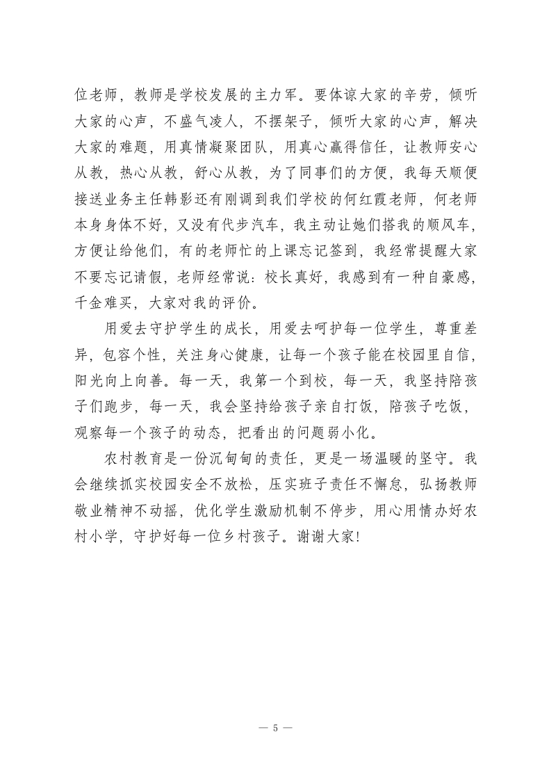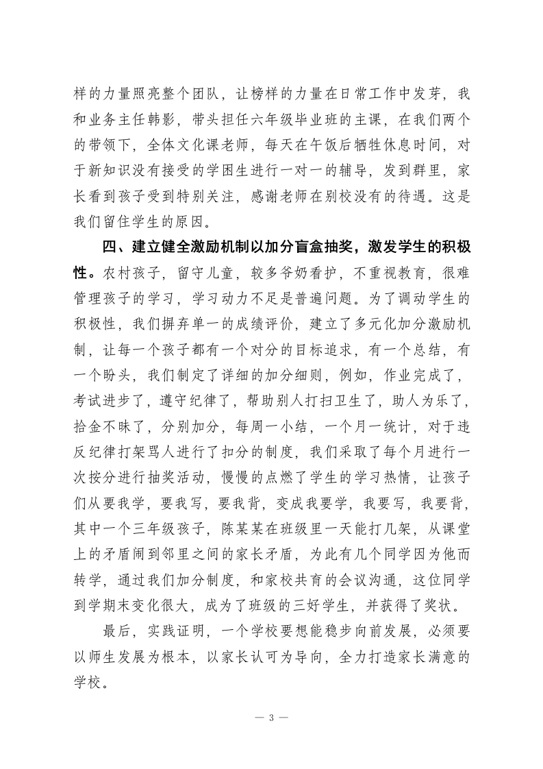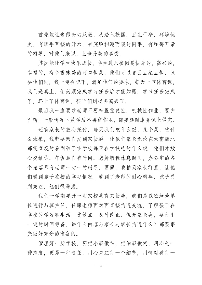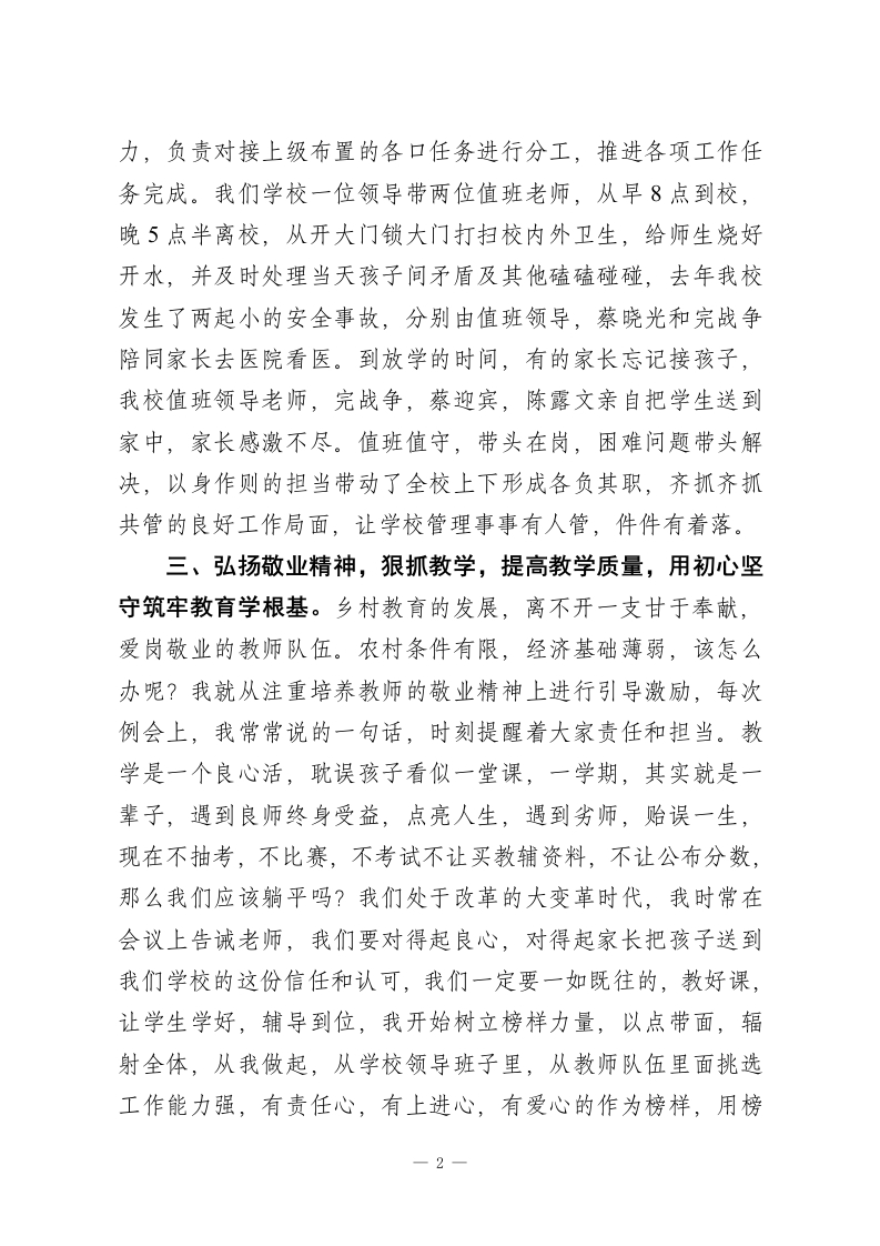 中心学校校长:在全镇“强管理促教学提质量”推进会上的讲话一一做一名凝聚人心、敬业乐群的好校长尊敬的各位领导,各位校长同仁:大家好!感谢领导给我这个机会,让我和大家坐在一起交流分享学校教学的心得与感悟。其实各位同仁管理学校大同小异,都有自己独特的管理方法和制度,今天我结合自己的学校管理方法和做法,给大家交流一下。学校管理就是关好门,管好人,求生存,狠抓核心目标,提高教学质量,管好一所学校,没有捷径可走关键在管理,核心在人心,唯有用心用情用爱把责任扛在肩上,把教师,把学生放在心上。现在我就围绕校园安全,班子分工,教师敬业,学生激励,狠抓教学,提高质量四个方面分享一下我们学校的做法。一、筑牢安全防线,把校园安全作为安全办学第一底线。从进学校大门的护学岗到封闭管理,课间值守,食堂卫生,领导带班,紧盯课间活动,重点开展防溺水安全,交通安全,防火,防电,防欺凌安全活动,开展主题班会,落实“1530”安全培训。二、明确班子分工,以责任落实撬动管理实效。领导班子是学校发展的核心动力,要做到分工明确,各负其责,协同努