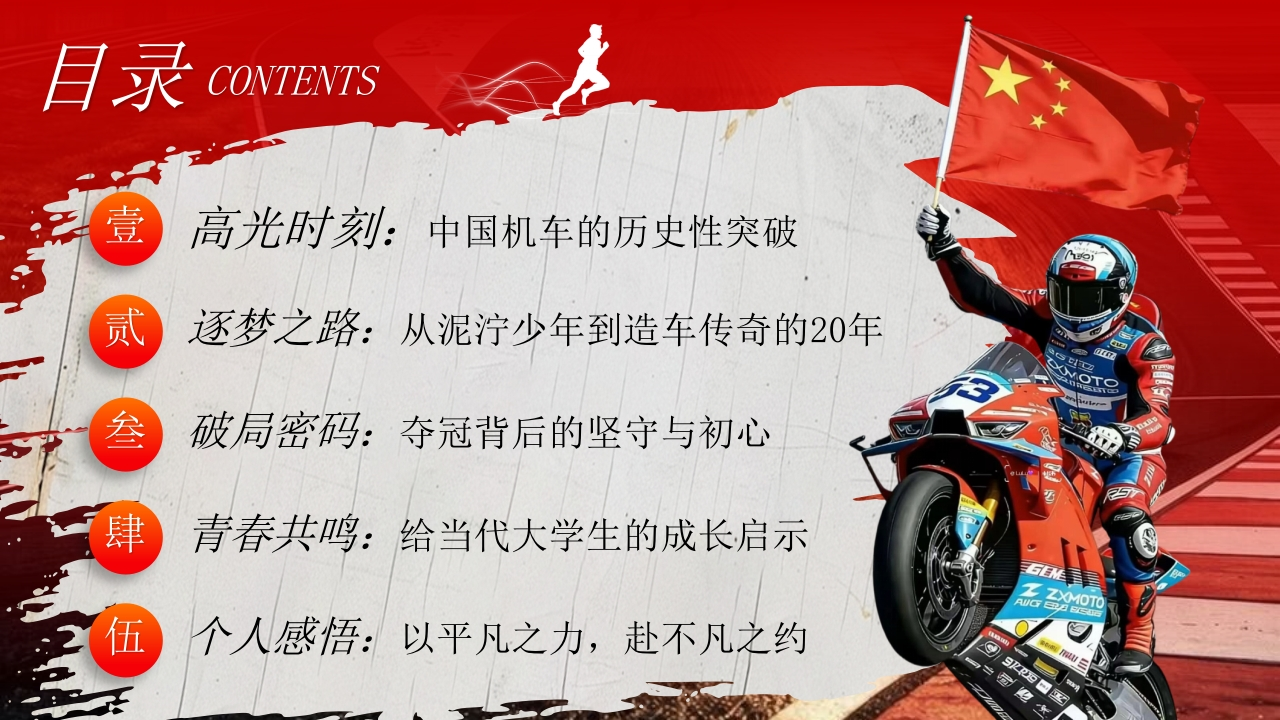 【通用】【励志教育】主题班会《有梦想就去追,平凡人也能造不凡——张雪机车世界夺冠的追梦启示》tangqi886小时前发布关注私信0.10GB26页0287 第1页 / 共26页 第2页 / 共26页 第3页 / 共26页 第4页 / 共26页 第5页 / 共26页 试读已结束,还剩21页,您可下载完整版后进行离线阅读 【通用】【励志教育】主题班会《有梦想就去追,平凡人也能造不凡——张雪机车世界夺冠的追梦启示》此内容为付费资源,请付费后查看¥9.9¥19.9VIP会员免费立即购买您当前未登录!建议登陆后购买,可保存购买订单付费资源© 版权声明本站是一个信息分享及获取的平台,不确保部分用户上传资料的来源及知识产权归属,资料由老师投稿,公开渠道整理,网友上传,如果侵犯到您的权益,请联系客服删除THE ENDPPT课件 文本预览 有梦想就去追平凡人也能造不凡张雪机车世界夺冠的青年追梦启示演讲人:XXX国日期:XX月XX223 查看更多 收起部分 喜欢就支持一下吧点赞7 分享QQ空间微博QQ好友海报分享复制链接收藏