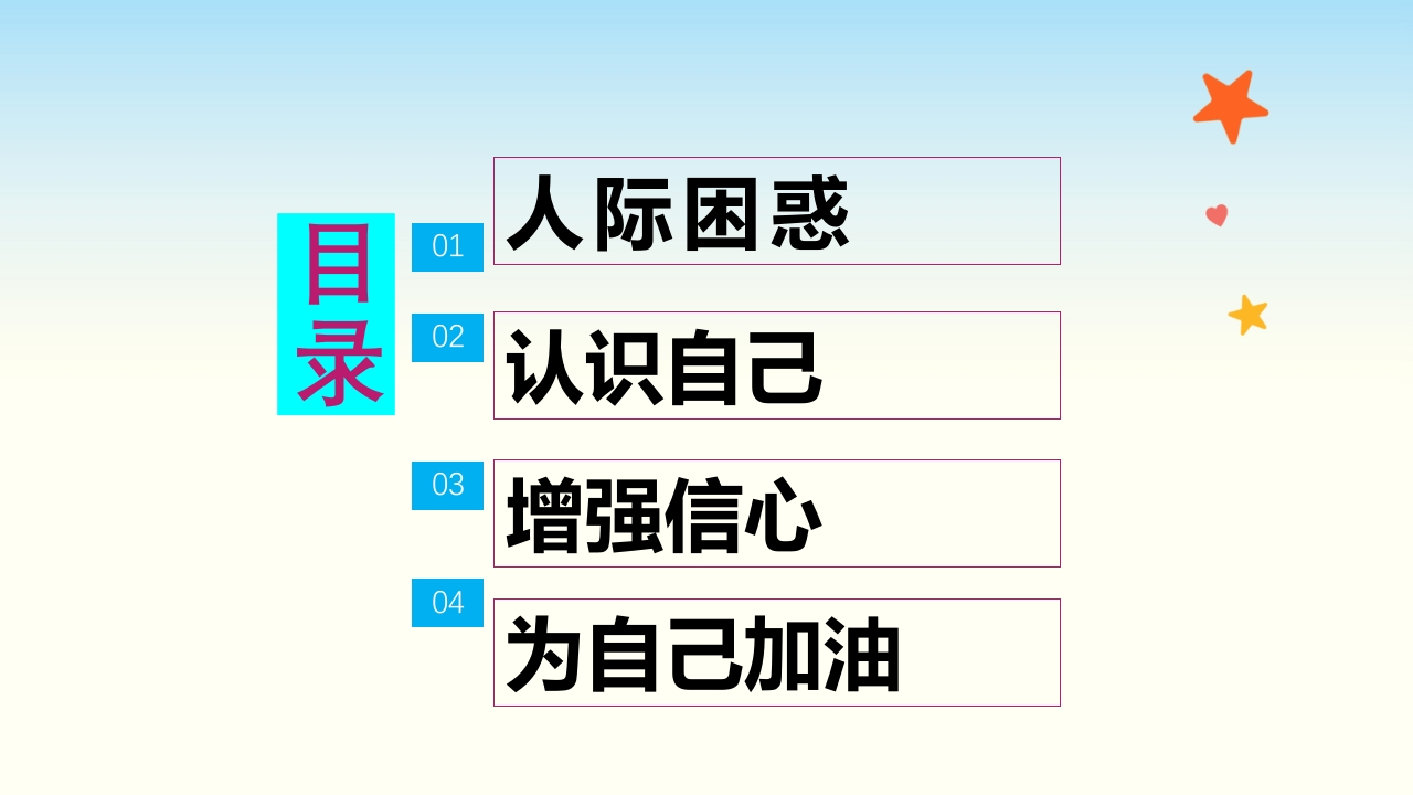 【通用】【自我肯定】教育主题班会:悦纳自我,从心开始tangqi885小时前发布关注私信61.11MB25页03910 第1页 / 共25页 第2页 / 共25页 第3页 / 共25页 第4页 / 共25页 第5页 / 共25页 试读已结束,还剩20页,您可下载完整版后进行离线阅读 【通用】【自我肯定】教育主题班会:悦纳自我,从心开始此内容为付费资源,请付费后查看¥9.9¥19.9VIP会员免费立即购买您当前未登录!建议登陆后购买,可保存购买订单付费资源© 版权声明本站是一个信息分享及获取的平台,不确保部分用户上传资料的来源及知识产权归属,资料由老师投稿,公开渠道整理,网友上传,如果侵犯到您的权益,请联系客服删除THE ENDPPT课件 文本预览 悦纳自我,从“心”开始人际困惑认识自己增强信心为自己加油主题班会 查看更多 收起部分 喜欢就支持一下吧点赞10 分享QQ空间微博QQ好友海报分享复制链接收藏