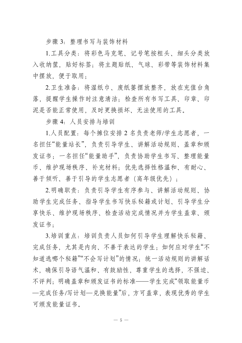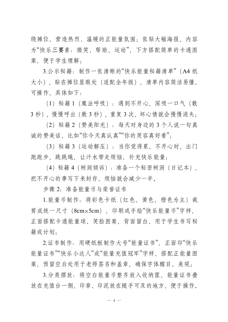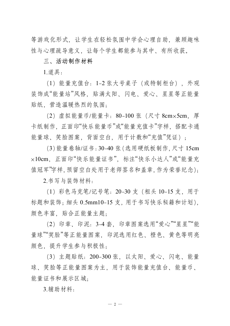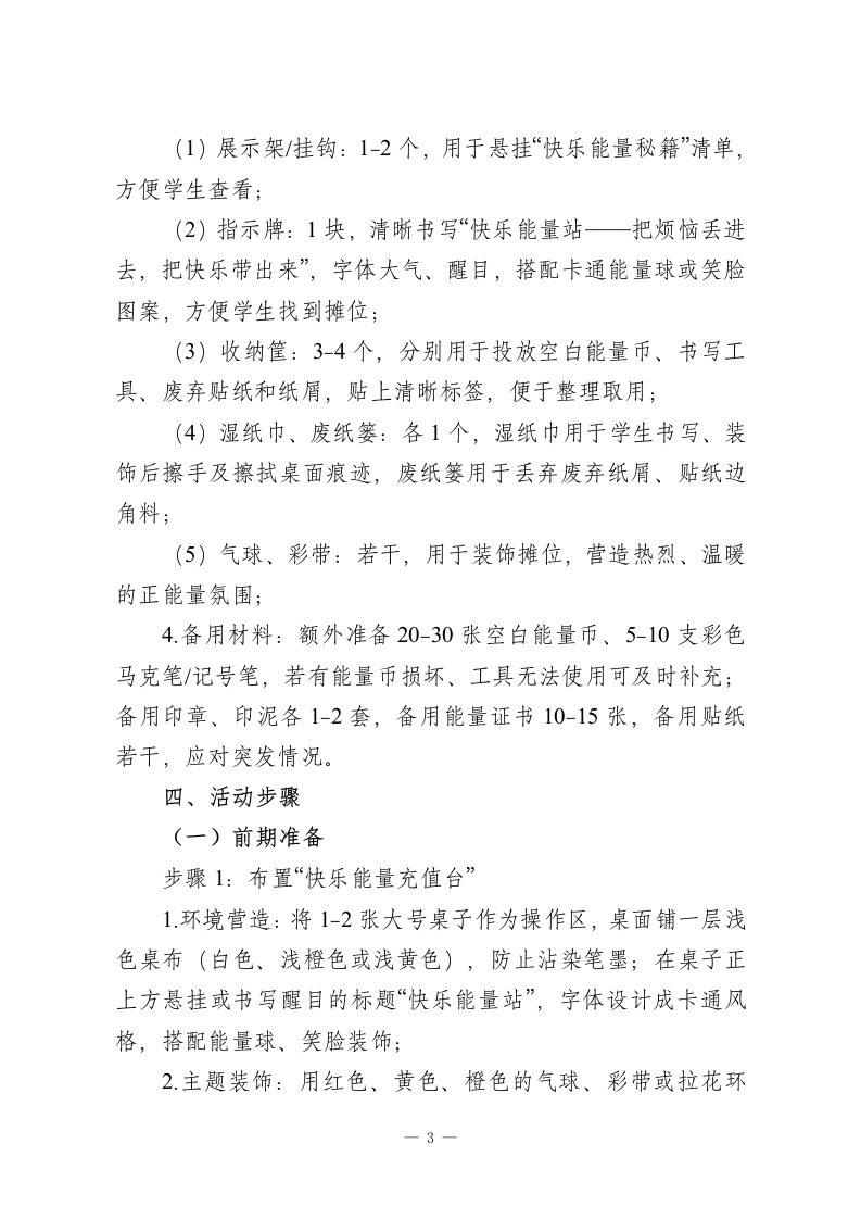 2026年学生心理游园活动一一快乐能量站活动名称活动目的备注心理游园活动通过动手操作与分享,帮一快乐能量站探索心灵传递快乐助学生掌握至少1-2个简快乐能量站单、可复制的“快乐能量秘能站籍”,学会为自己补充积极情绪,提升情绪调节能力。心理游园活动快乐能量站一、活动名称快乐能量站二、活动目的1.习得积极情绪维护法:通过动手操作与分享,帮助学生掌握至少1-2个简单、可复制的“快乐能量秘籍”,学会为自己补充积极情绪,提升情绪调节能力;2建立正向社交链接:通过分享与互助,传递温暖与能量,消除学生孤独感,提升同伴之间的支持感与归属感,培养友好相处的意识;3.培养情绪急救意识:引导学生在遇到不开心、压力大或身体疲惫时,能主动寻求帮助或进行自我调节,学会做自己的“情绪小医生”;4.适合1-6年级,操作简单、形式趣味,通过“充值”“兑换”