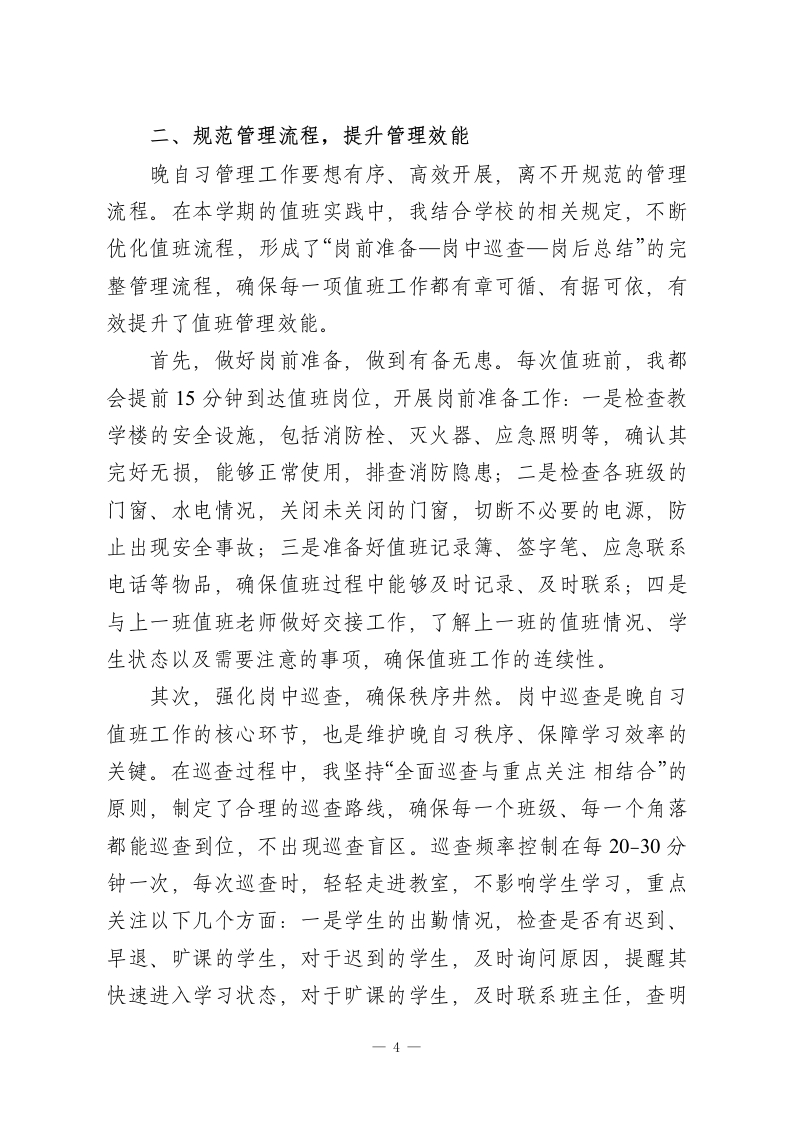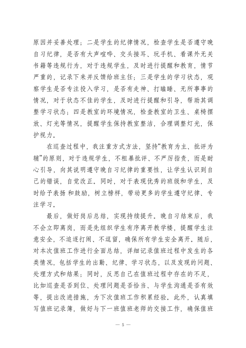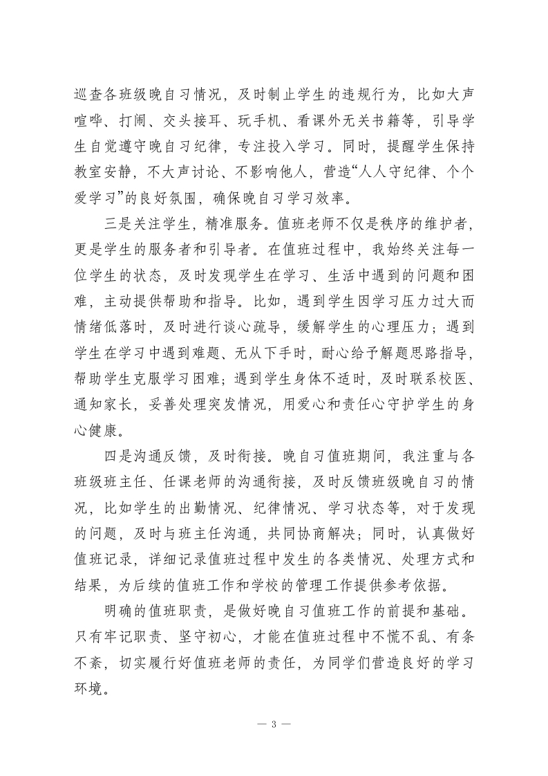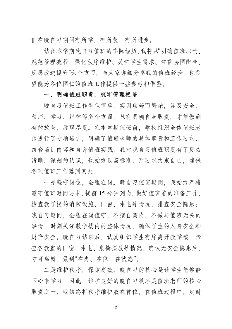 XX高中2026年春季学期“晚自习管理”值班老师经验分享尊敬的各位领导、各位同仁:大家晚上好!春山可望,奋进当时;灯火可亲,育人不息。转眼间,2026年春季学期已过半程,晚自习作为高中阶段学生查漏补缺、巩固提升、自主学习的重要时段,作为学校教育教学管理的重要组成部分,承载着衔接白天教学、培养学生自主学习能力、守护学生身心健康的重要使命。作为本学期参与晚自习值班的老师之一,我有幸全程参与学校晚自习的各项管理工作,在实践中探索方法、在反思中积累经验、在协作中提升能力。今天,非常荣幸能有这个机会,和各位同仁分享我在晚自习值班管理中的一些心得、做法与思考,也希望能与大家相互交流、取长补短,共同优化我校晚自习管理模式,提升晚自习学习效率,为同学们的成长成才保驾护航。高中阶段是学生学业压力较大、自主学习能力培养的关键时期,而晚自习则是学生自主安排学习、消化白天所学知识、弥补自身短板的黄金时间。相较于白天的课堂教学,晚自习更注重学生的自主性、自觉性,也更考验我们值班老师的管理能力、引导能力和责任担当。在本学期的晚自习值班过程中,我始终秉持“安全第一、秩序井然、注重实效、关爱学生”的原则,认真履行值班职责,积极探索科学有效的管理方法,努力为同学们营造一个安静、有序、高效、温馨的学习环境,助力同学1