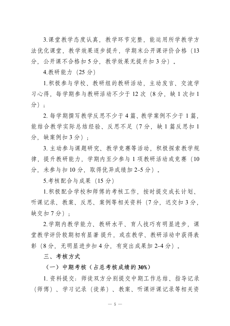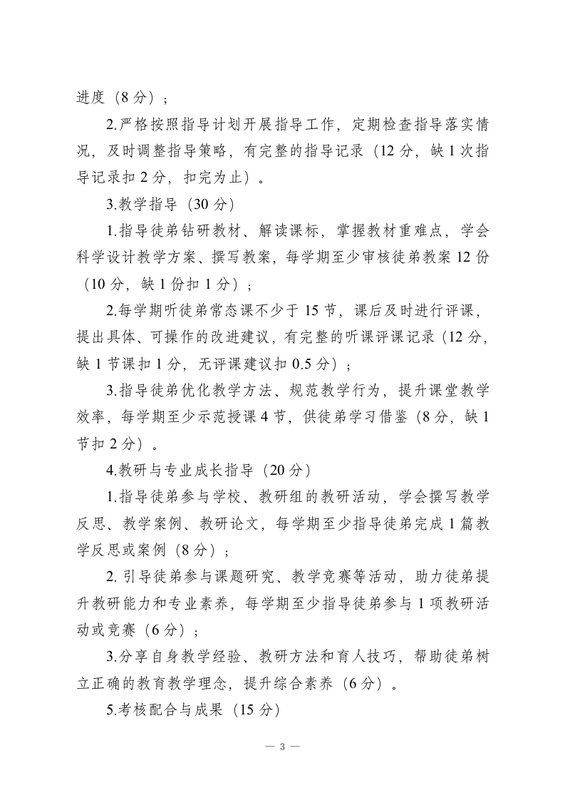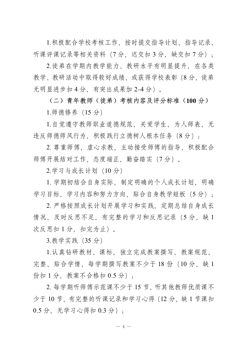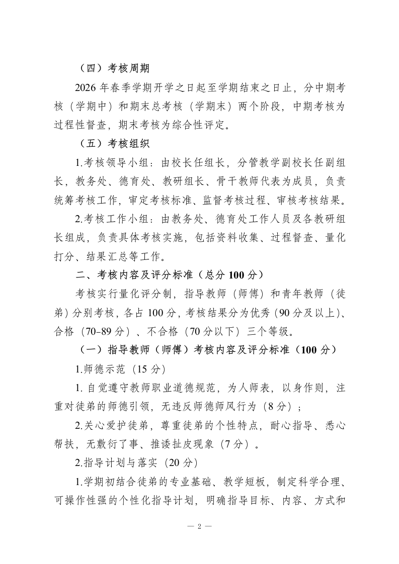 XX学校2026年春季学期青年教师师徒结对考核细则一、考核总则(一)考核目的为扎实推进2026年春季学期青年教师师徒结对工作,强化师徒结对的实效性,规范考核管理,充分发挥骨干教师的示范引领作用,促进青年教师快速成长,提升青年教师的教育教学能力、教研水平和师德修养,打造一支师德高尚、业务精湛、结构合理的教师队伍,结合学校实际,制定本考核细则。(二)考核对象本学期参与学校青年教师师徒结对工作的所有指导教师(师傅)和青年教师(徒弟)。(三)考核原则1.公平公正原则:考核标准统一、流程规范,考核过程公开透明,确保考核结果客观公正,不偏袒、不徇私。2.实事求是原则:以师徒结对工作实绩为依据,结合日常表现、资料提交、成果展示等情况,如实考核,不夸大、不虚构。3.注重实效原则:聚焦师徒结对核心目标,重点考核指导效果、徒弟成长进步情况,杜绝形式化考核。4.奖惩结合原则:考核结果与评优评先、绩效分配、职称晋升挂钩,对表现优秀的师徒子以表彰,对未达标者进行督促整改。一1