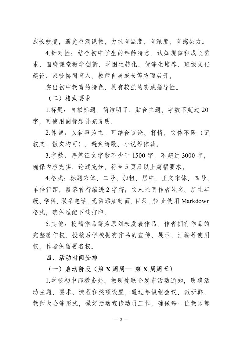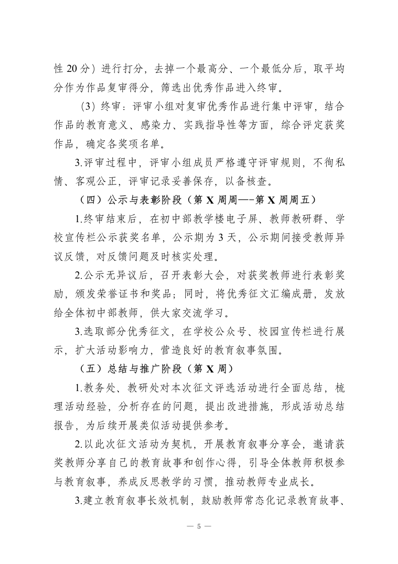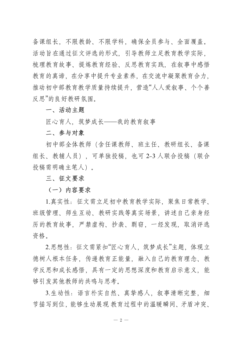 初中部教师教育叙事征文评选活动启动教育是一场温暖的修行,叙事是一段成长的回响。为深入贯彻落实立德树人根本任务,助力初中部教师专业成长,挖掘教育教学中的动人故事,凝聚教育智慧,传承教育初心,展现我校初中部教师潜心育人、爱岗敬业、乐于奉献的精神风貌,搭建教师交流学习、分享感悟的平台,让教育叙事成为教师反思教学、提升素养的重要载体,经学校研究决定,正式启动初中部教师教育叙事征文评选活动。现将活动相关事宜通知如下,希望全体初中部教师积极参与、踊跃投稿,用文字记录教育路上的温暖与感动、成长与收获。教育叙事是教师对教育教学实践的真实记录与深度反思,是教师专业成长的“催化剂”。初中阶段是学生世界观、人生观、价值观形成的关键时期,每一位初中教师在日常教学、班级管理、师生相处中,都有自己独特的教育经历和深刻的教育感悟一或许是一次耐心的引导,改变了学生的成长轨迹;或许是一次意外的触动,让自己对教育有了新的认知;或许是一段与学生的温暖相伴,成为职业生涯中最珍贵的回忆;或许是一次教学中的尝试与探索,收获了意想不到的成效。这些真实、鲜活、温暖的教育故事,既是教师教育智慧的结晶,也是学校教育事业发展的生动缩影,更是激励全体教师坚守教育初心、潜心立德树人的精神力量。本次初中部教师教育叙事征文评选活动,以“匠心育人,筑梦成长”为主题,面向初中部全体任课教师、班主任、教研组长、1