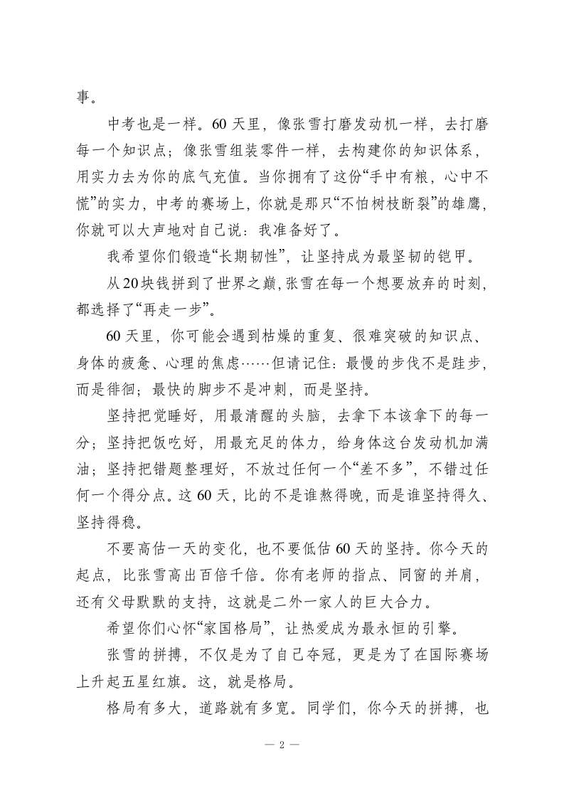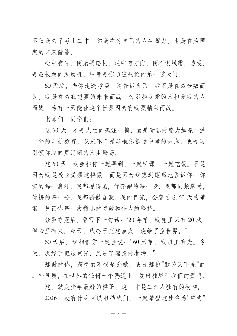 党总支书记、校长在2026届中考60天誓师大会上的致辞尊敬的刘扬书记、家长朋友、全体奔赴中考的将士们:有些时光,像马蹄踏过心田,清脆而滚烫。比如你初入二外校园的好奇,比如你每一次跑操的铿锵,比如填报志愿时你坚定地说“我一定能考上二中”。每时每刻,我都能感受到小马驹奔腾的力量。丙午马年的今天,距离中考整整60天。亲爱的孩子们,属于你扬鞭驰骋的时刻,到了!在这最该拼搏、最有干劲的时刻,让我们一起从一个刷屏全网的人身上汲取力量。张雪,这个从湖南大山里走出的少年,用20年的时间,把“穷光蛋”的身份,改写成了“身价十亿”的传奇,把“修车学徒”的标签,演变成了“世界冠军”的勋章。此刻,你手中的笔,就是你的赛车;你面前的试卷,就是你的赛道。只要我们磨砺实力、锻造韧性、心怀热爱,我们的六月,就势不可挡。我希望你们磨砺“硬核实力”,让底气成为最锋利的宝剑。19岁的张雪为了能被车队看见,骑着一辆破摩托,冒雨追了节目组100多公里。他说:“年轻时不拼,老了肯定后悔。拼了,输了,我也认!”凭什么?凭他修车多年练出的技术,凭他对摩托车的每一颗螺丝了如指掌。他的底气,从来不是运气,而是实打实的本一1