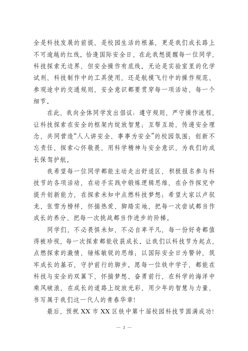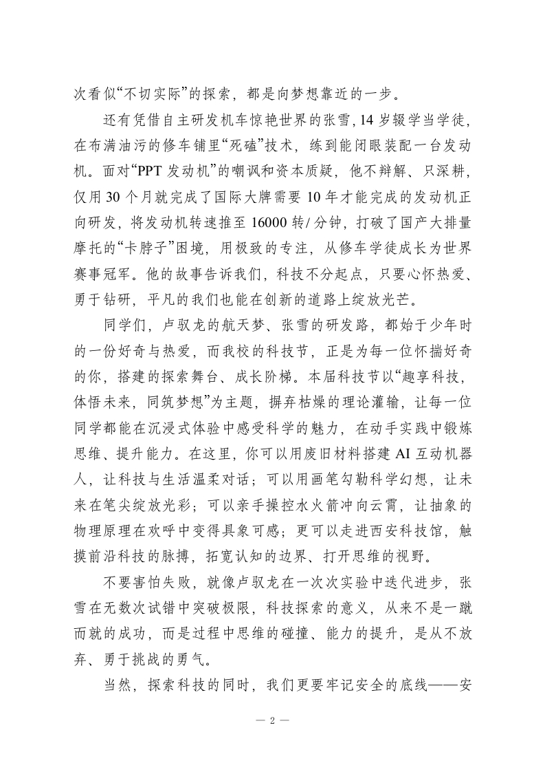 教务处主任在第七周升旗仪式上的讲话:科技筑梦未来,安全护航成长尊敬的各位老师、亲爱的同学们:大家早上好!4月15日,国际安全日如期而至,它像一声温柔而坚定的警钟,时刻提醒我们:安全是发展的基石,是幸福生活的底色,更是我们探索未知的底气;而再过一周,4月22日,我校第十届校园科技节即将盛大启幕,这将是一场点燃科学梦想、碰撞思维火花、展现少年风采的盛宴!科技与安全,如同成长路上的一双羽翼,相辅相成、缺一不可,载着我们少年的憧憬,飞向更高远的未来。科技从来不是遥不可及的星辰,而是我们触手可及的探索;创新也从来不是天才的专属,而是脚踏实地的积累。最近,有两位科技追梦人的事迹刷屏全网,他们用坚持与热爱,诠释了“少年有梦,当赴山海”的力量,更让我们看到,科技的种子,从来都在平凡的坚持中生根发芽。驭龙航天的创始人卢驭龙,从小就是个“科技迷”,14岁便开始研究火箭发动机,少年时的他,即便在实验中遭遇意外、身受重伤,脑海里牵挂的依然是“实验为何失败,下次如何成功”。十六年来,他拒绝盲从行业共识,放弃北京大学保送资格,带领5人小团队深耕低成本航天技术,用民用工业品替代宇航级部件,将火箭单位推力成本降至行业的五十分之一,成功发射“深圳先锋号”液体火箭。他用坚持告诉我们,热爱可抵万难,每一1