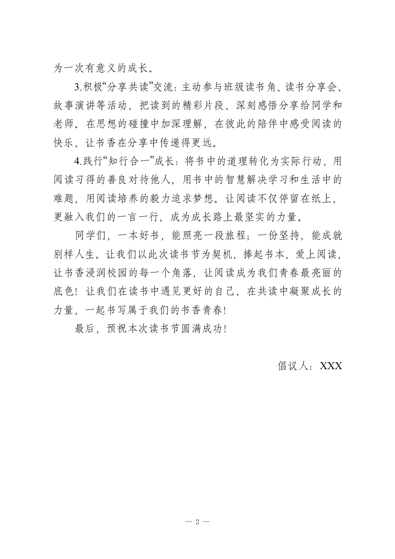 2026年“世界读书日”读书节启动仪式倡议书:“以书为友,共赴书香之约”尊敬的各位领导、老师,亲爱的同学们:大家好!春和景明,书香拂面。在这充满生机的美好时节,我校读书节正式拉开了帷幕!作为学生代表,我怀着无比激动的心情,向全体同学发出诚挚的倡议:让我们以书为友,以读为伴,共赴一场浸润心灵的书香之约!同学们,老师曾说,读书是跨越时空的对话,是与智者同行的旅程。当我们翻开《朝花夕拾》,能跟随鲁迅先生重温童年的纯粹与热烈;品读《海底两万里》,会跟随尼摩船长探索深海的神秘与壮阔;沉浸在《昆虫记》中,更能发现大自然里藏着的无数奇妙与惊喜。阅读,不仅能让我们在文字中开阔视野、增长学识,更能在浮躁的时光里沉淀心境,在迷茫的成长中找到方向。作为新时代的少年,我们既是知识的汲取者,更应是阅读的传播者。在此,我向全体同学发出四点倡议:1.养成“每日一读”的习惯:每天抽出30分钟,放下电子产品,走进书的世界。让晨读的朗朗书声唤醒朝阳,让睡前的静谧阅读陪伴星光,让阅读成为生活中不可或缺的一部分。2.精选“有益之书”品读:不仅认真研读课本知识,更要广泛涉猎文学经典、科普读物、历史传记等各类书籍。在好书的滋养中,塑造健全的人格,培养敏锐的思维,让每一次阅读都成1