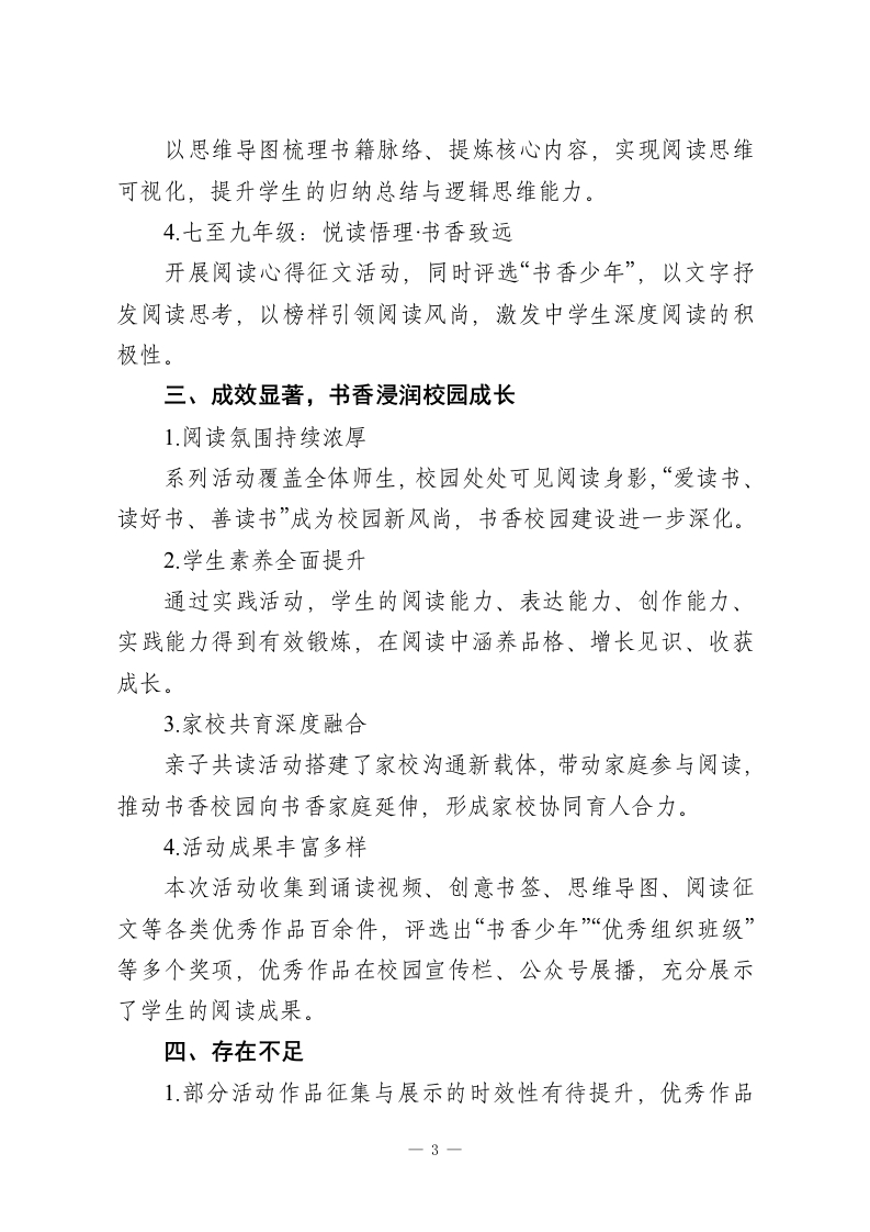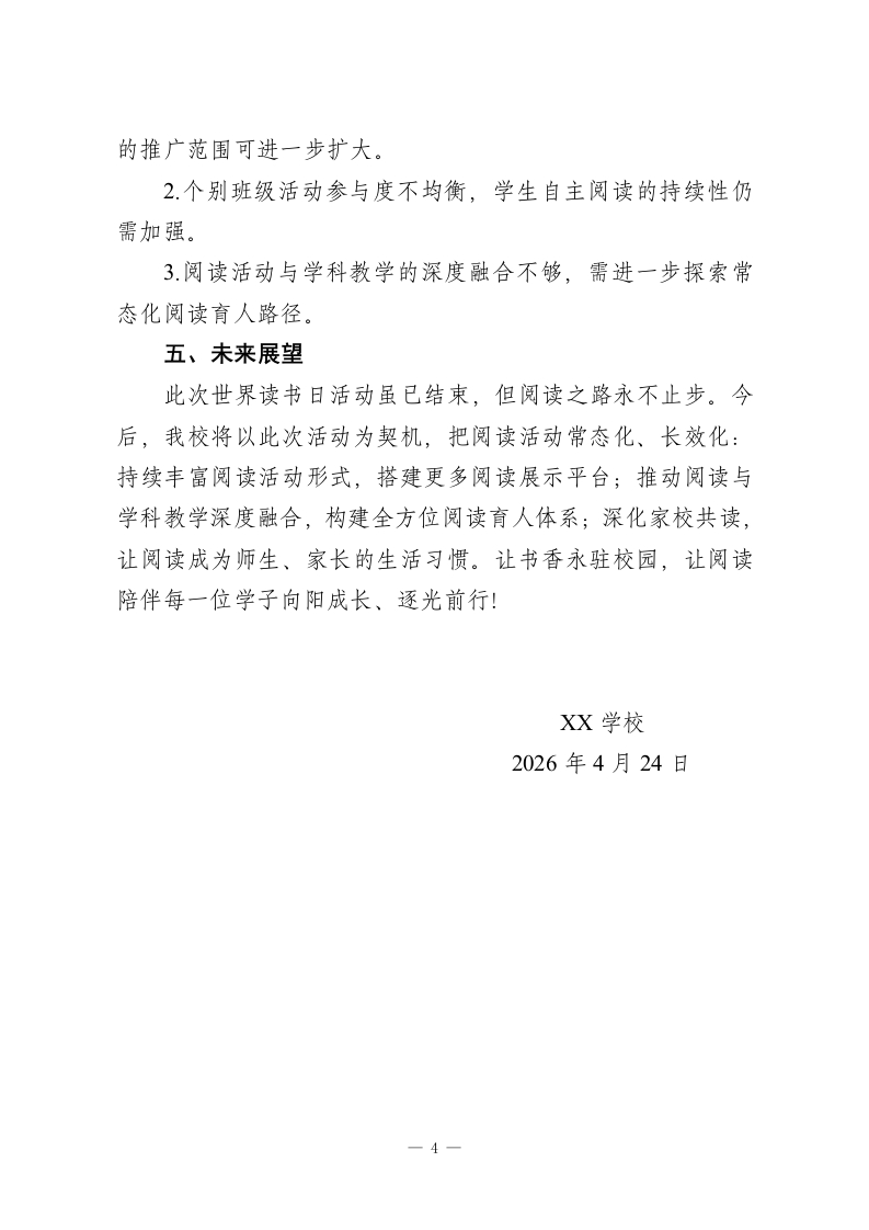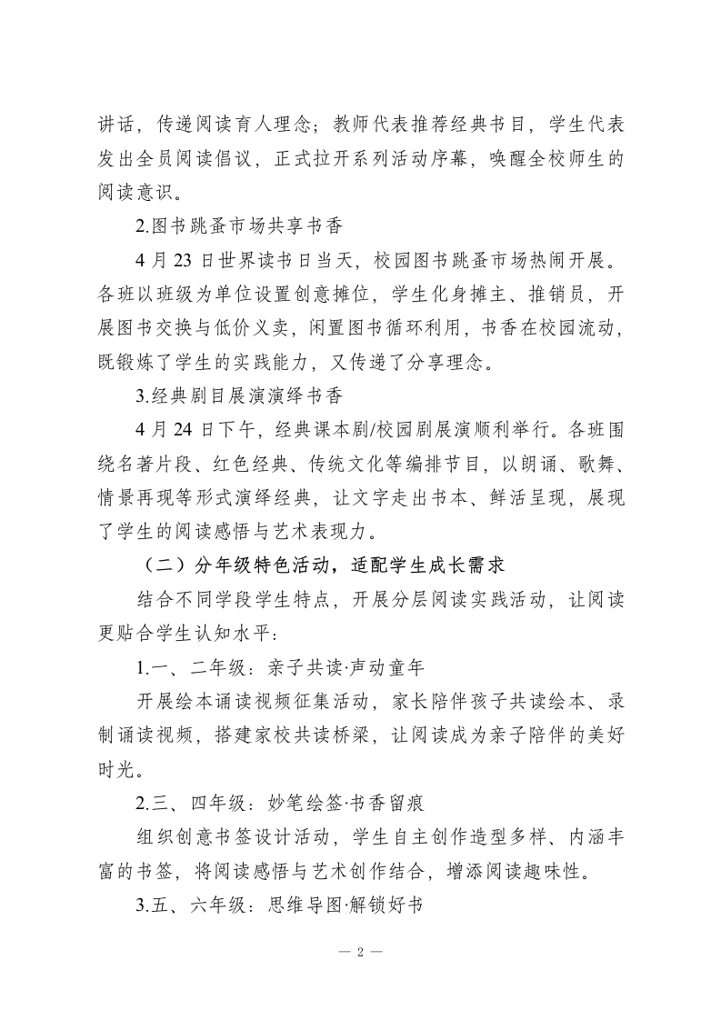 2026年XX学校世界读书日主题活动总结:“书海拾光,阅读‘悦’成长”为深入推进书香校园建设,引导全体师生养成良好阅读习惯,在第29个世界读书日来临之际,我校于4月20日一4月24日开展了“书海拾光,阅读‘悦'成长”主题系列阅读活动。本次活动面向全校1一9年级全体师生,以多元载体搭建阅读平台,以丰富形式激发阅读热情,取得了良好的育人效果。现将活动开展情况总结如下:一、周密部署,夯实活动组织基础为确保活动有序高效开展,学校高度重视、提前谋划,成立了以校长为组长,德育处、少先队、语文组及各班主任协同配合的活动工作小组,明确分工、压实责任。活动前制定详细方案,细化流程安排、材料收集、安全保障等各项工作;通过校园广播、宣传栏、班级群等渠道广泛宣传,营造“人人爱阅读、处处飘书香”的校园氛围;提前筹备证书、展板、活动道具等物资,为活动顺利开展提供全方位保障。二、多元开展,打造特色阅读盛宴本次活动兼顾整体性与层次性,分为学校统一活动与分年级特色活动两大板块,内容丰富、形式新颖,覆盖全体师生,让阅读真正融入校园生活。(一)校级统一活动,营造全员阅读氛围1.启动仪式点燃阅读热情4月20日升旗仪式上,读书节正式启动。校长作读书动员-1-