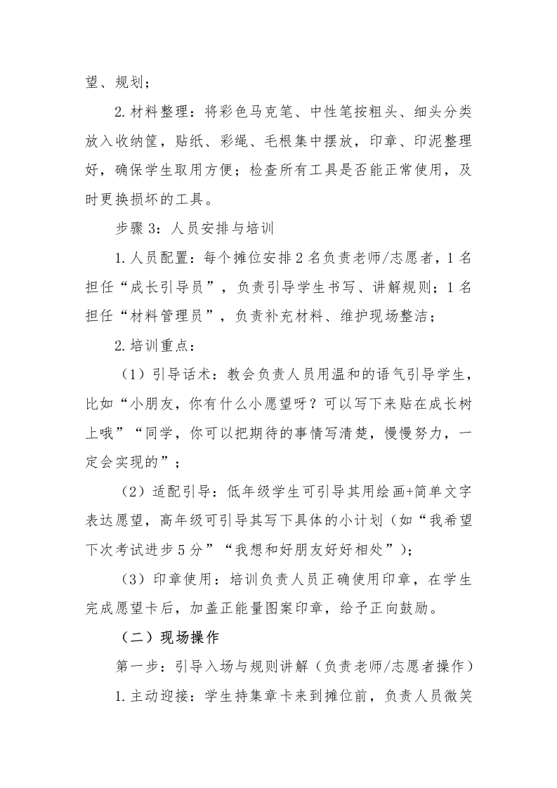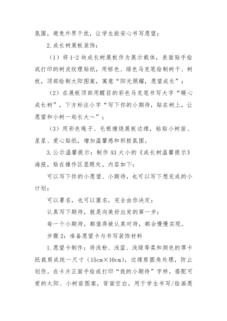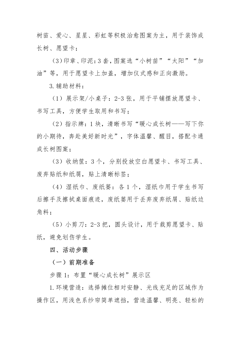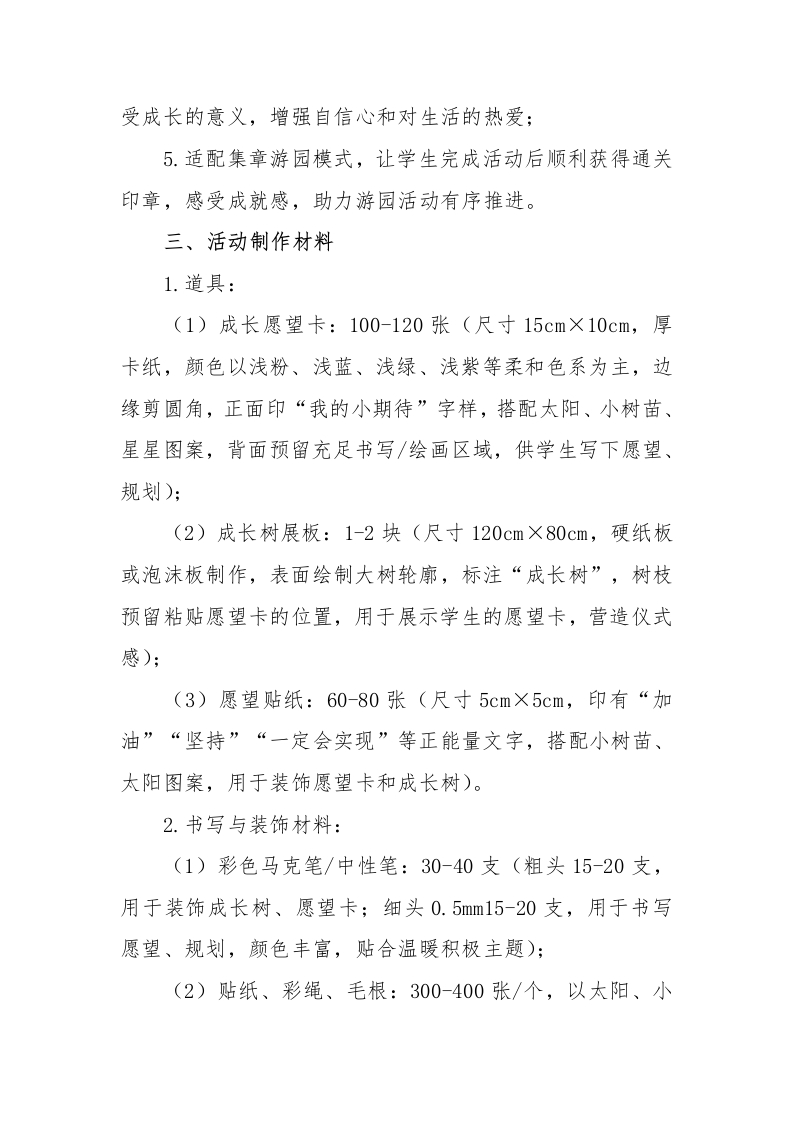 2026年学生心理游园活动暖心成长树活动名称活动目的备注心理游园活动一让学生在书写、绘画过程一暖心成长树心灵成长·温暖同行中,释放情绪、表达心声,暖心成长树体会“期待美好、追逐美好”的快乐,增强积极心理暗示。心理游园活动一一暖心成长树一、活动名称暖心成长树一一写下小期待,共赴新美好二、活动目标1.引导学生梳理内心期待,学会规划自己的小目标,将模糊的“愿望”转化为具体可实现的小计划,培养目标意识;2.让学生在书写、绘画过程中,释放情绪、表达心声,体会“期待美好、追逐美好”的快乐,增强积极心理暗示:3.培养学生的表达能力、动手能力,低年级侧重绘画表达,高年级侧重文字书写,兼顾趣味性与实用性:4.营造积极向上、温暖治愈的氛围,让学生在互动中感