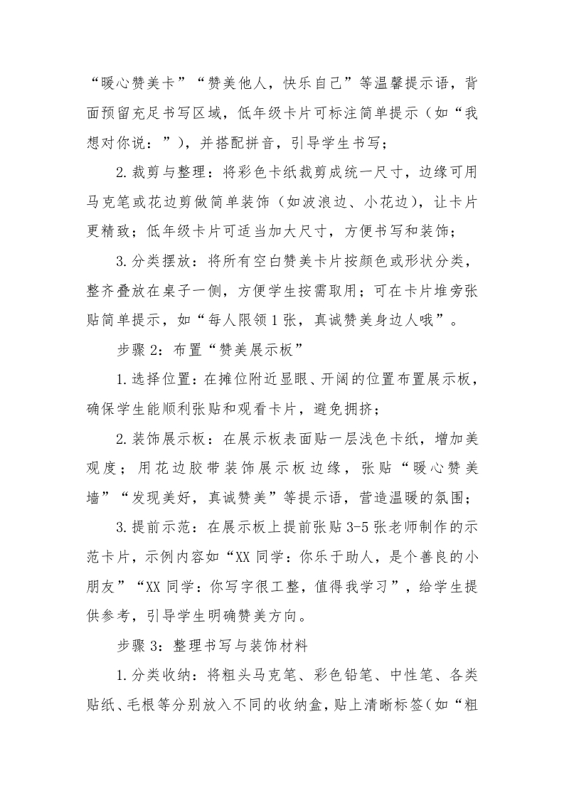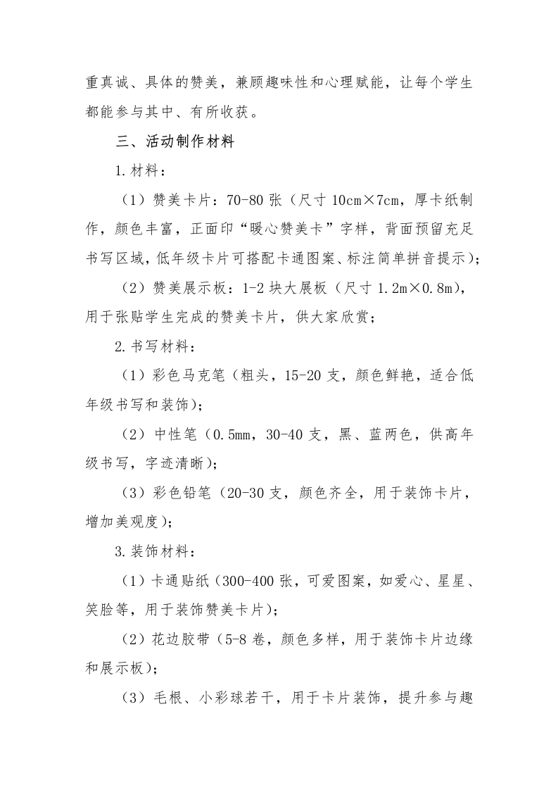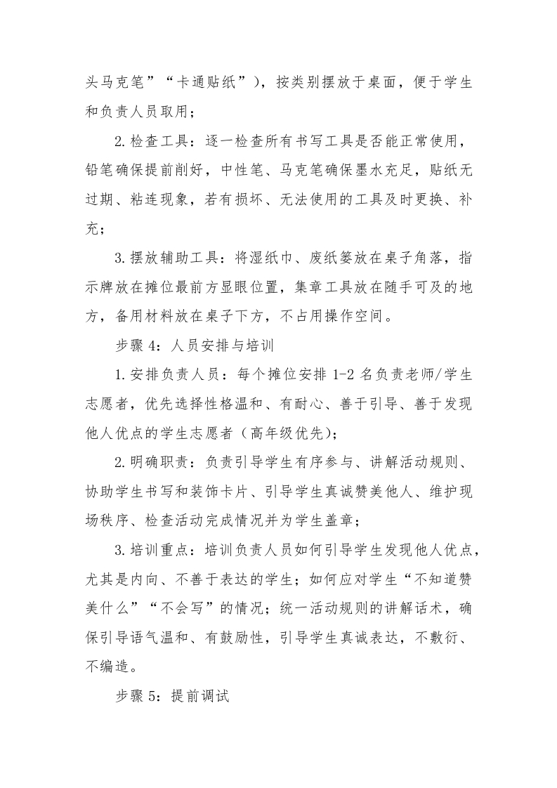 2026年学生心理游园活动暖心赞美驿站活动名称活动目的备注心理游园活动一暖心赞美驿站引导学生学会发现他人的、用温暖话西传速善意●优点,学会真诚赞美他人,暖心赞美驿站领取6小礼物(○完成互动可领取定制徽章培养观察力和同理心,提升人际交往能力。心理游园活动—一暖心赞美驿站一、活动名称暖心赞美驿站二、活动目的1.引导学生学会发现他人的优点,学会真诚赞美他人,培养观察力和同理心,提升人际交往能力;2.让学生在被赞美中感受温暖与认可,在赞美他人中收获快乐,增强自信心和归属感:3.营造友好、包容、互助的集体氛围,减少同学间的隔阂,促进良好同伴关系的建立:4.适合1-6年级,低年级侧重简单赞美表达,高年级侧