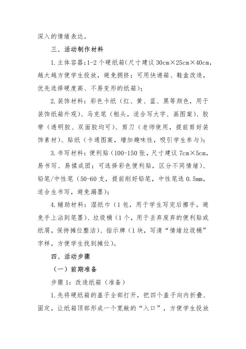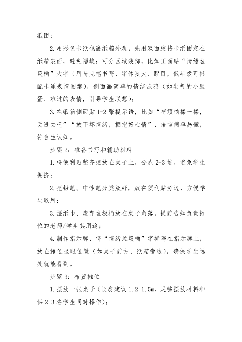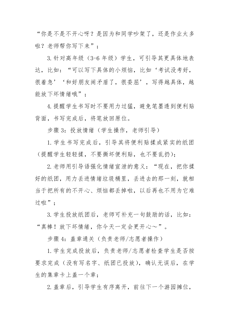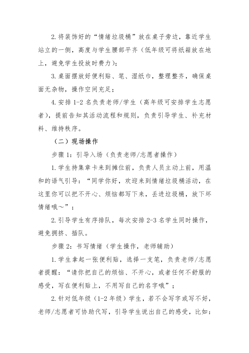 2026年学生心理游园活动情绪垃圾桶活动名称活动目的备注帮助学生释放内心的负面心理游园活动情绪垃圾桶情绪((如烦恼、委屈、生气、情绪垃圾桶压力等),引导学生学会合理宣泄情绪,避免负面情绪堆积。心理游园活动一一情绪垃圾桶一、活动名称情绪垃圾桶二、活动目的1.帮助学生释放内心的负面情绪(如烦恼、委屈、生气、压力等),引导学生学会合理宣泄情绪,避免负面情绪堆积:2.让学生明白“负面情绪是可以被放下的”,培养积极乐观的心态,减少情绪内耗:3.营造安全、包容的心理氛围,让学生敢于表达自己的真实感受,增强心理安全感;4.适合1-6年级,低年级可简化操作,高年级可引导更