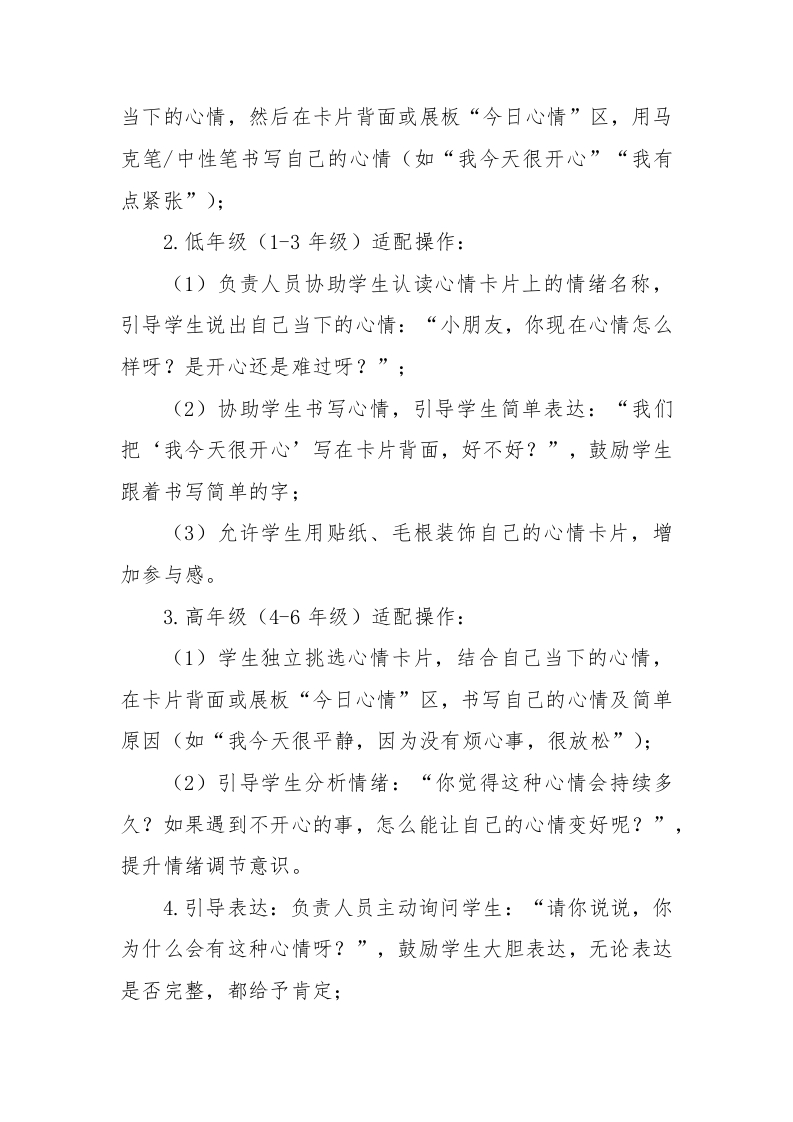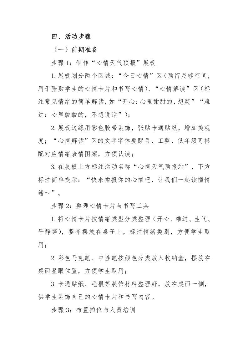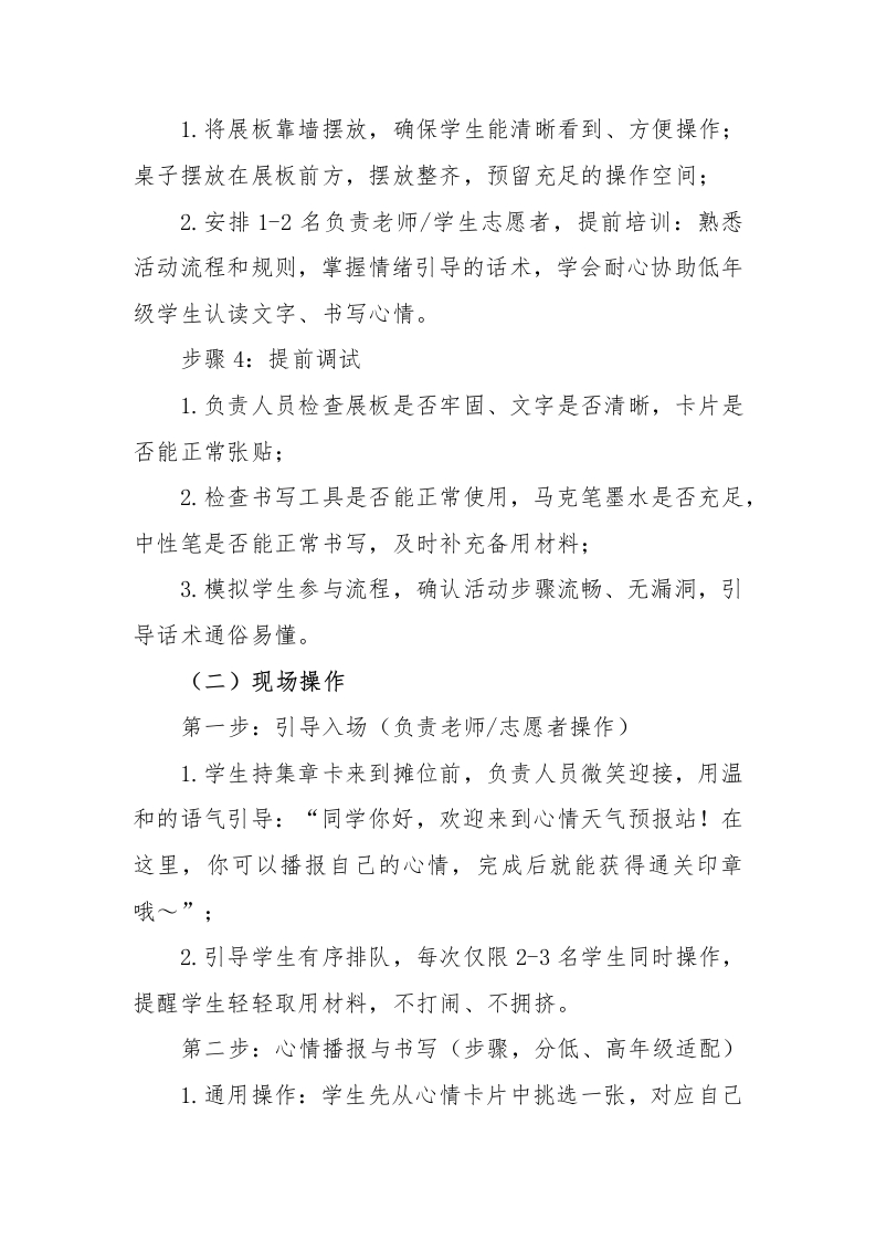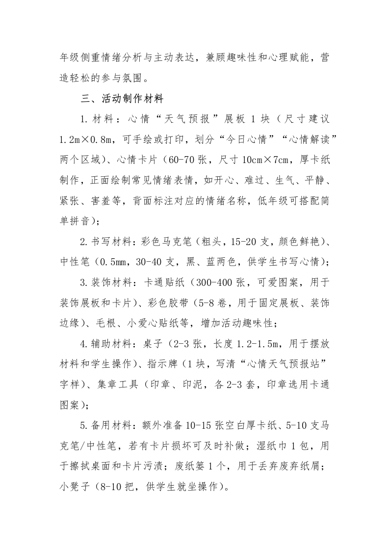 2026年学生心理游园活动心情天气预报站活动名称活动目的备注心理游园汽活云动一一心情天气好预报站记录心情·分享快乐引导学生觉察自己当下的情绪状态,学会用简单的语心情天气预报站言描述自己的心情,提升情绪觉察和表达能力。心情留言板情绪调节小技巧心理游园活动—一心情天气预报站一、活动名称心情天气预报站二、活动目的1.引导学生觉察自己当下的情绪状态,学会用简单的语言描述自己的心情,提升情绪觉察和表达能力:2.帮助学生了解不同情绪的特点,知道情绪没有好坏之分,学会接纳自己的所有情绪:3.培养学生的观察力和表达力,鼓励学生大胆说出自己的心情,减少情绪压抑;4.适合1-6年级,低年级侧重情绪识别与简单表达,高