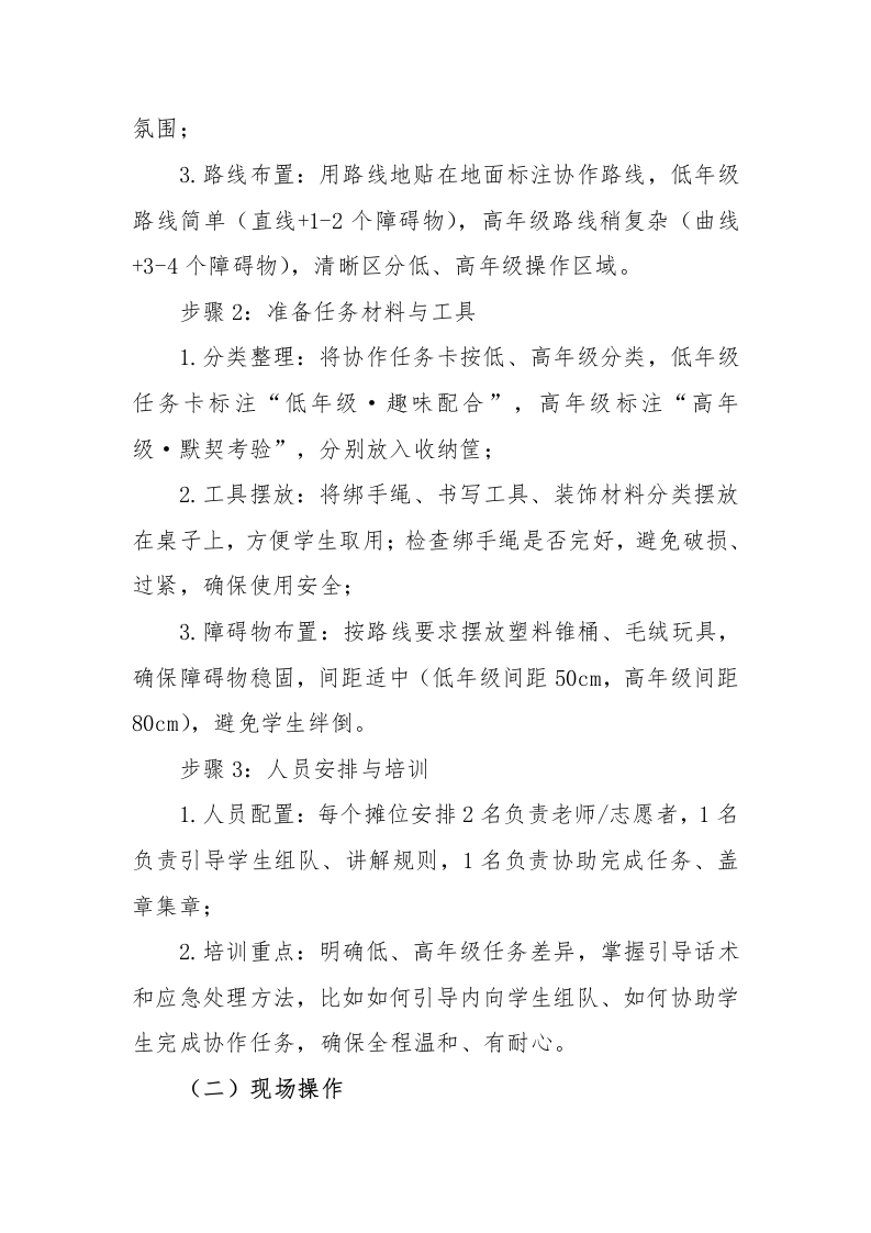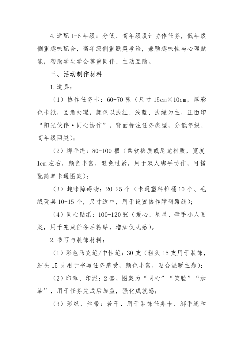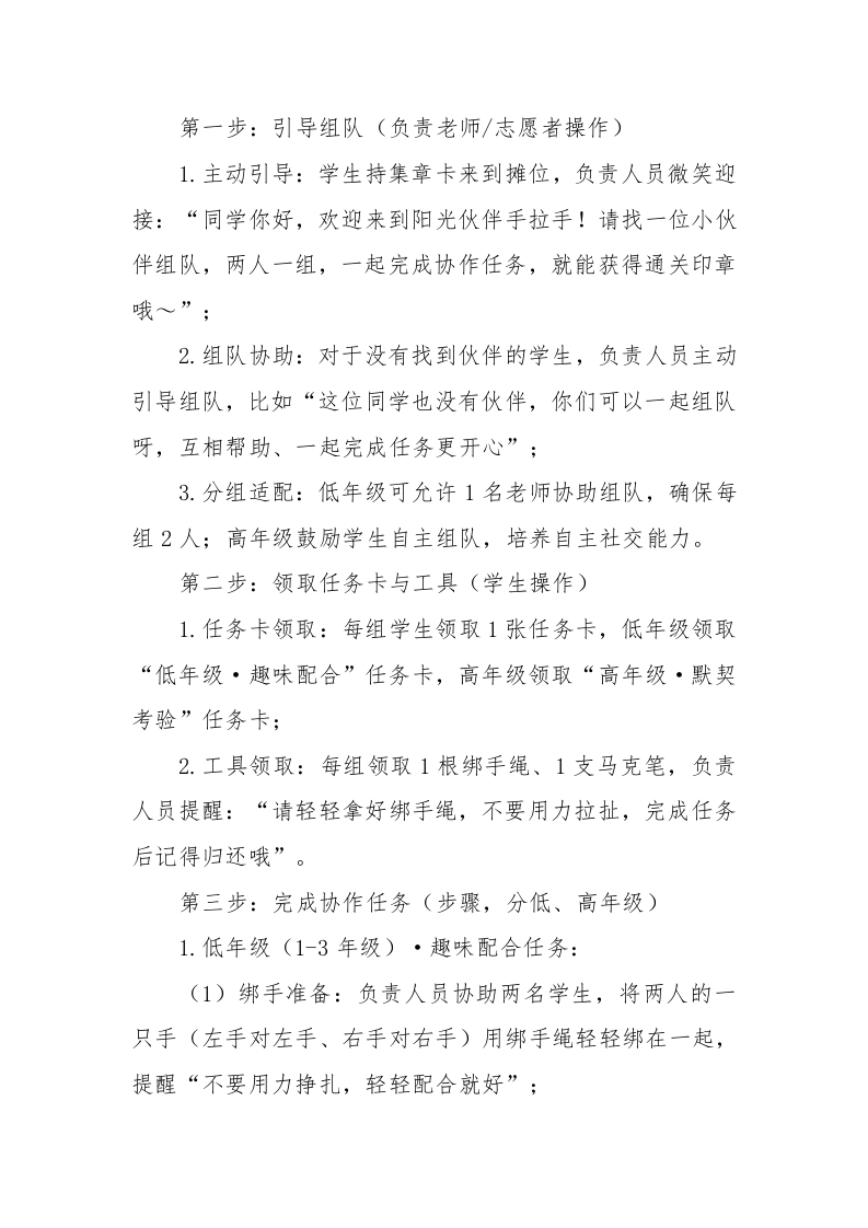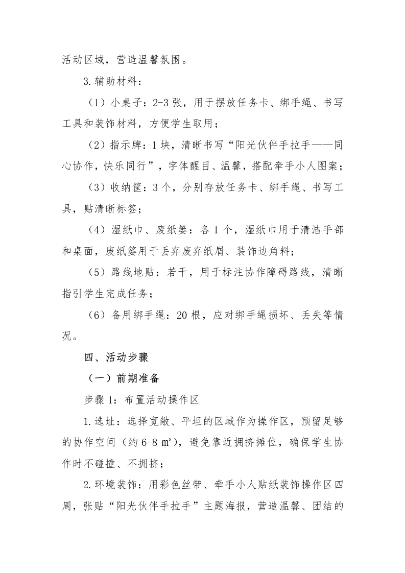 2026年学生心理游园活动阳光伙伴手拉手活动名称活动目的备注通过双人/小组协作完成任心理游园活动之阳光伙伴手拉手务,锻炼学生的沟通表达能阳光伙伴手拉手力和团队协作能力,学会倾听同伴的想法、配合同伴的行动。心理游园活动一一阳光伙伴手拉手一、活动名称阳光伙伴手拉手二、活动目的1.培养同伴互助意识:引导学生学会主动结交朋友、帮助同伴,建立良好的同伴关系,体会互助带来的温暖与快乐:2.提升协作与沟通能力:通过双人/小组协作完成任务,锻炼学生的沟通表达能力和团队协作能力,学会倾听同伴的想法、配合同伴的行动:3.增强集体归属感:让学生在协作中感受集体的力量,明白“团结就是力量”,提升集体荣誉感和归属感: