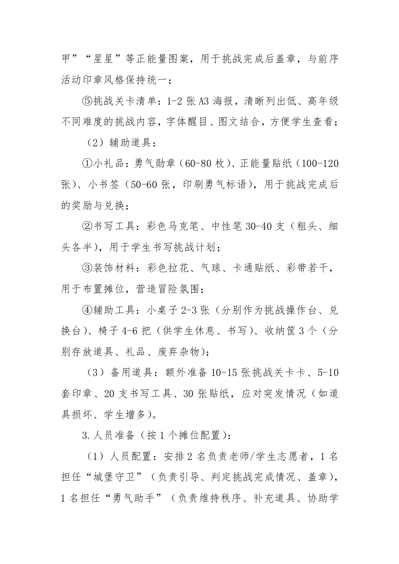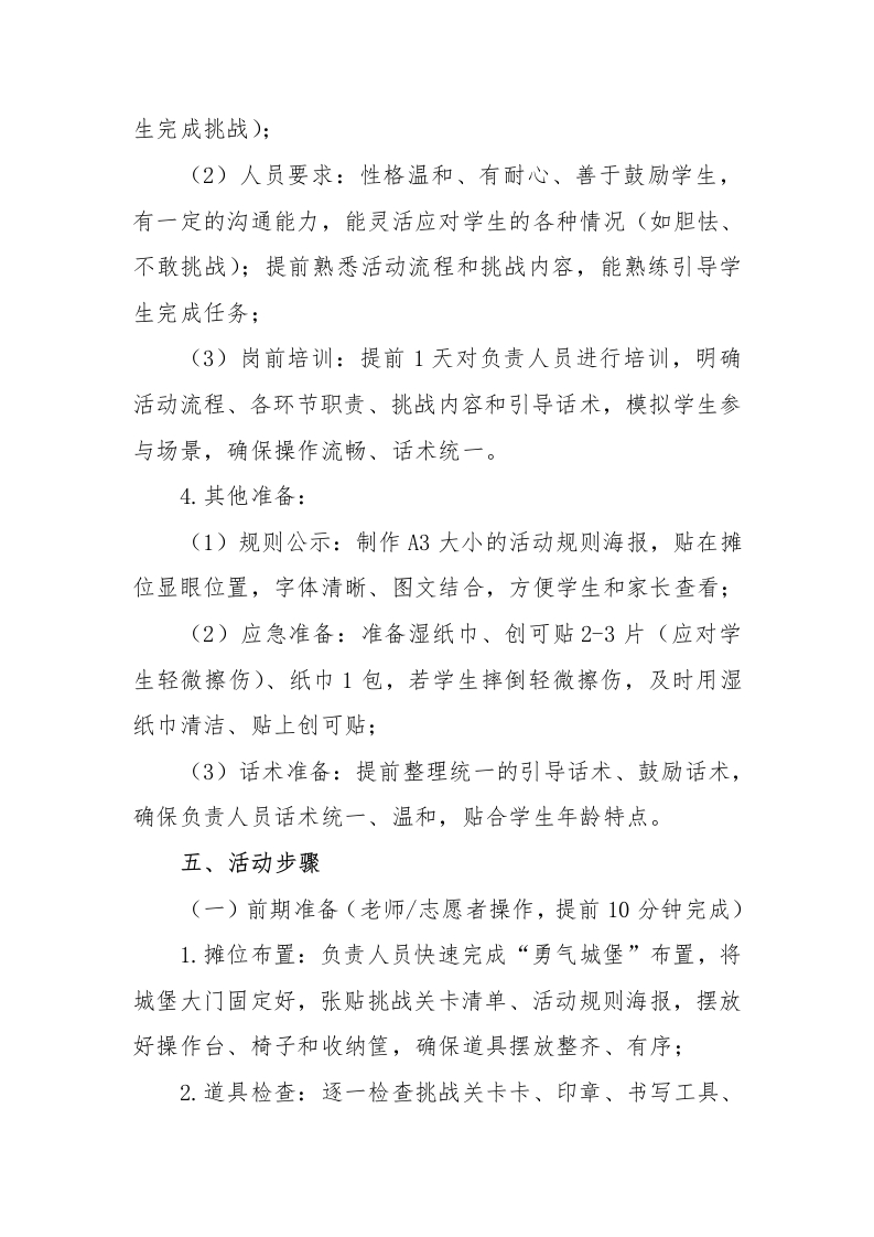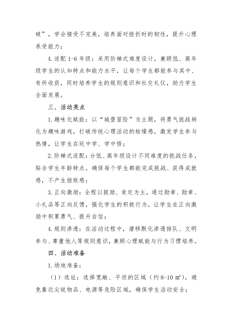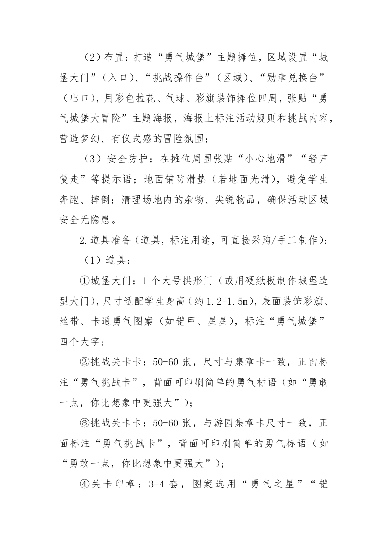 2026年学生心理游园活动勇气城堡大冒险活动名称活动目的备注通过游戏化挑战,帮助学生*勇气城堡大冒险*尝试平时不敢做的事,直面心理游园活动勇气城堡大冒险内心的胆怯,逐步克服畏难、害羞等负面情绪,培养直面挑战的勇气。活动时间:闲末900-17:00心理游园活动—一勇气城堡大冒险一、活动名称勇气城堡大冒险二、活动目的1.破除畏难情绪:通过游戏化挑战,帮助学生尝试平时不敢做的事,直面内心的胆怯,逐步克服畏难、害羞等负面情绪,培养直面挑战的勇气;2.提升自信品质:让学生在完成挑战的过程中获得成就感,建立“我可以做到”的自我认知,增强自信心和自我认同感;3.锻炼抗压与韧性:在轻松氛围中体验“小挑战、小突