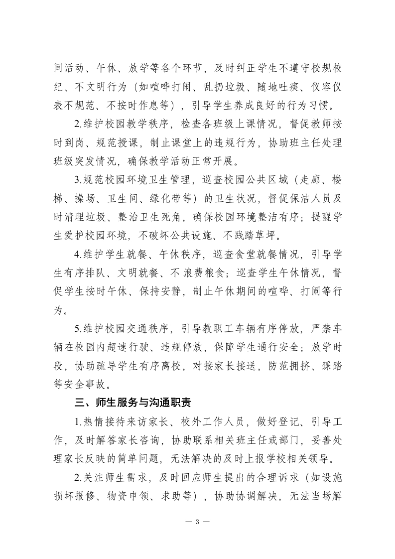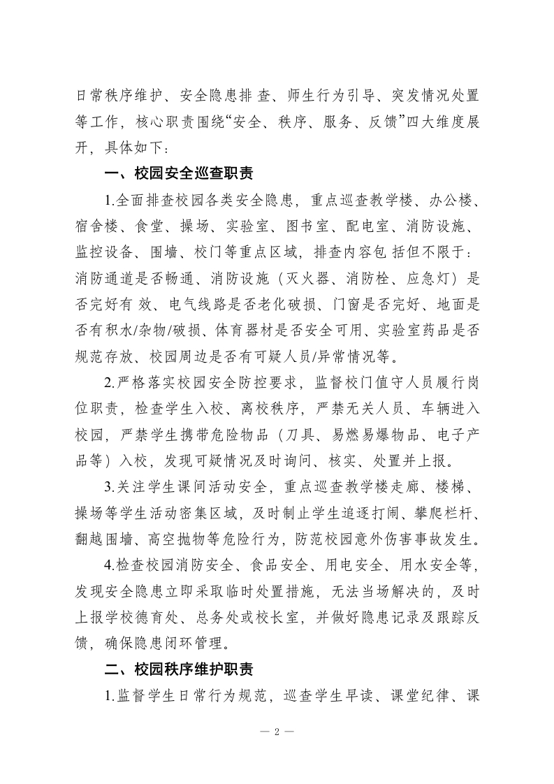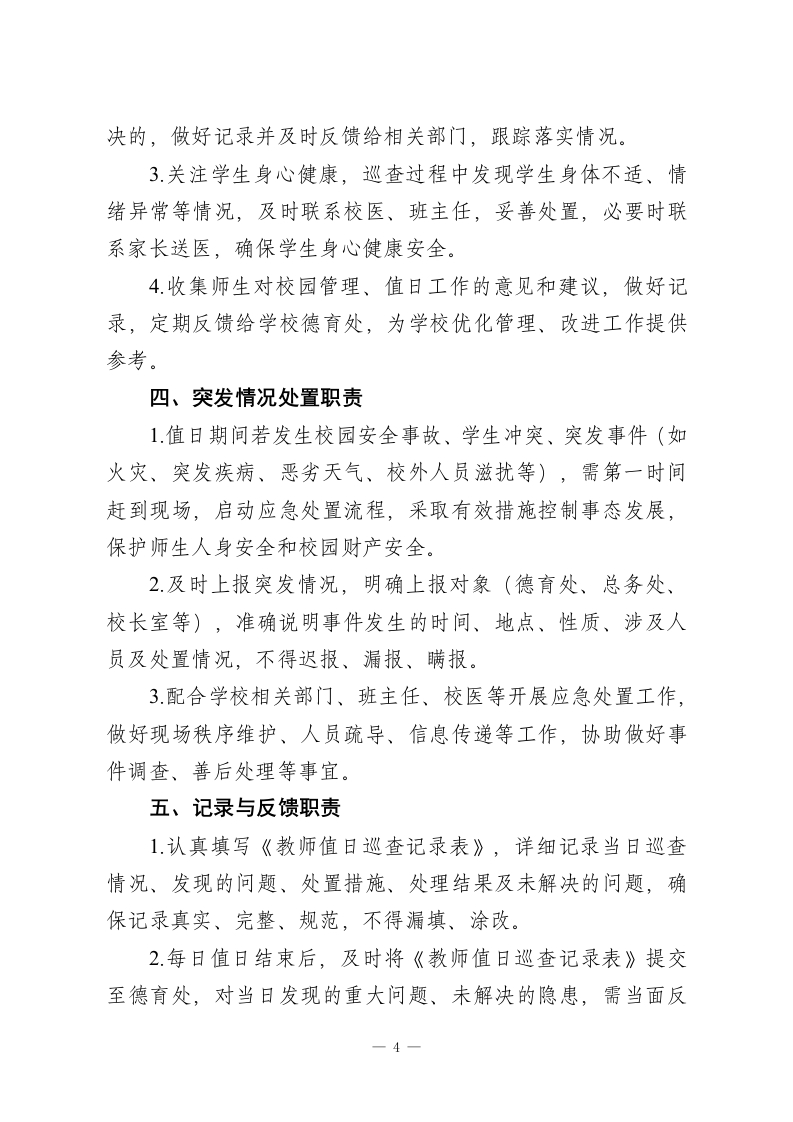 XX初中2026年春季学期“教师值日”职责及巡查记录表为进一步规范校园管理,强化校园安全防线,维护正常的教育教学秩序,营造安全、文明、有序的校园环境,明确教师值日工作责任,规范值日巡查流程,确保各项值日工作落到实处,结合我校初中阶段学生特点及2026年春季学期校园管理工作实际,特制定本“教师值日”职责及巡查记录表。本手册适用于我校2026年春季学期所有参与值日工作的教师,涵盖值日教师核心职责、具体工作内容、巡查规范、纪律要求、应急处置及标准化巡查记录表,旨在明确工作标准、规范操作流程、强化责任落实,推动值日工作常态化、规范化、精细化开展,切实保障全体师生人身安全、校园财产安全,助力学校教育教学工作平稳有序推进。教师值日工作是校园管理的重要组成部分,是衔接学校各部门、保障校园日常运转的关键环节,更是值日教师履行育人职责、守护校园安全的重要体现。每位值日教师需提高思想认识,牢记岗位职责,以高度负责的态度、严谨细致的作风,认真履行值日职责,全面开展校园巡查,及时排查安全隐患、处理突发情况、规范校园秩序,切实做到守土有责、守土尽责,共同筑牢校园安全屏障,为全体师生营造安全、和谐、文明的学习和工作环境。第一章教师值日核心职责值日教师作为当日校园管理的直接责任人,全面负责校园1