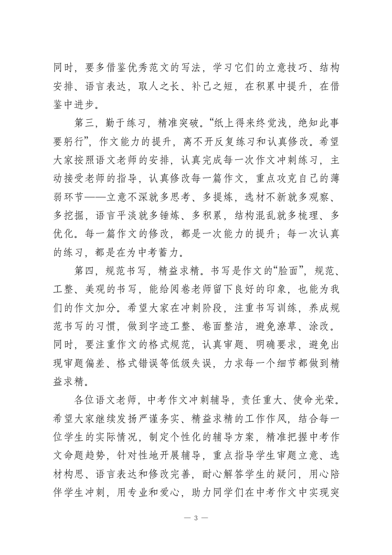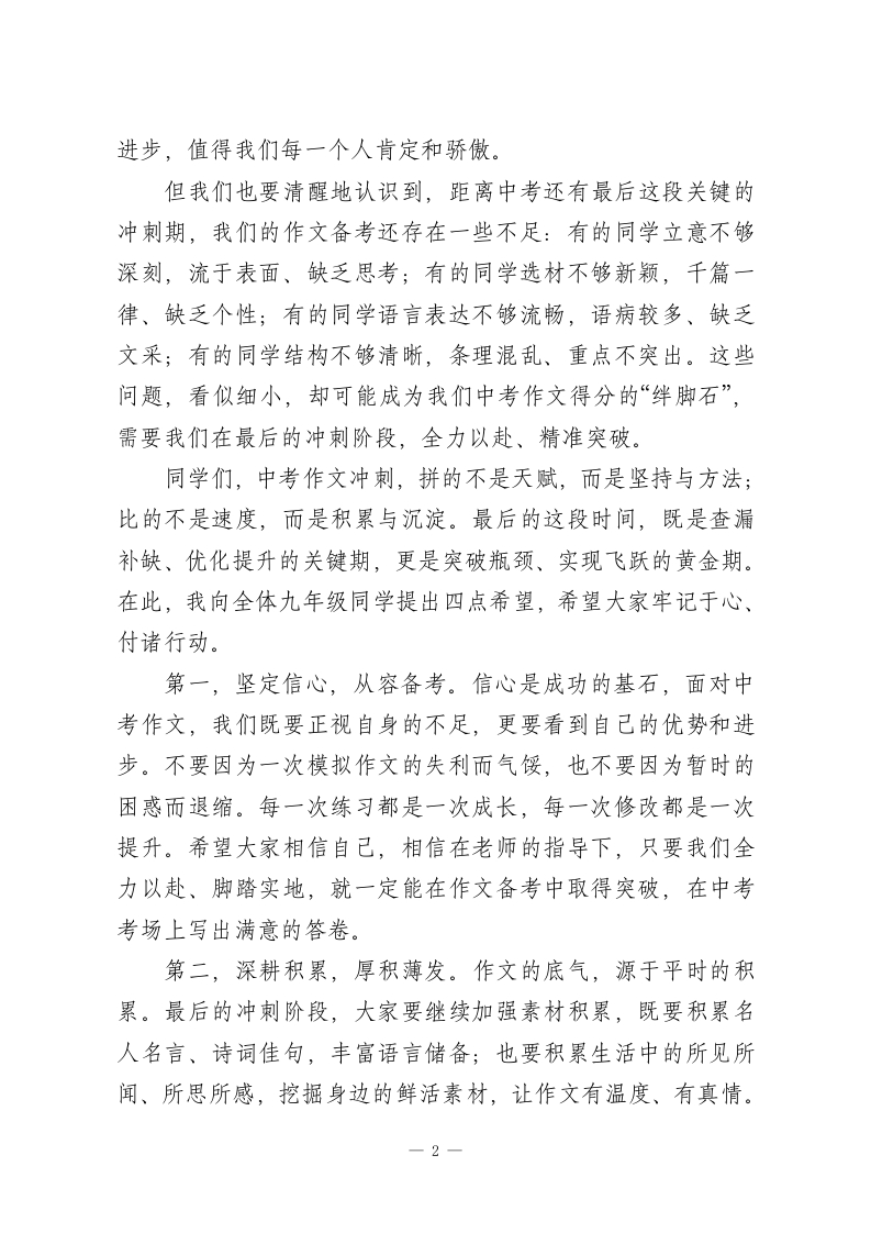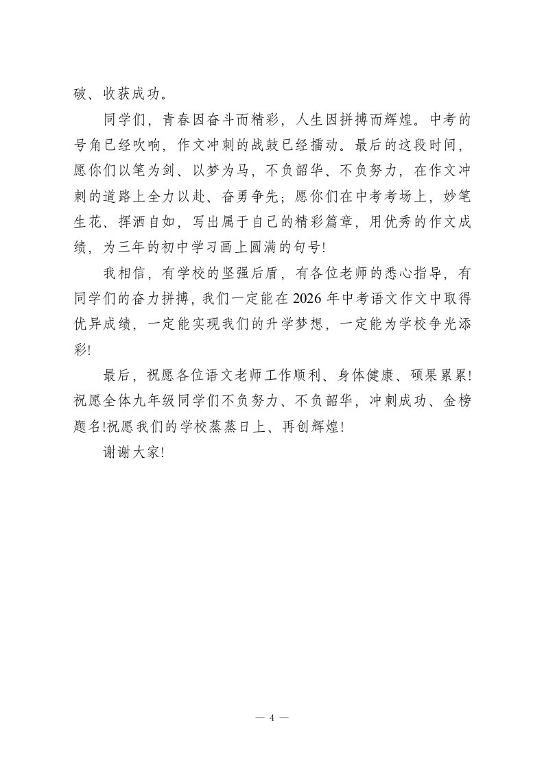 XX初中2026年中考语文作文冲刺辅导动员会校长讲话尊敬的各位老师、亲爱的九年级同学们:大家下午好!春潮涌动,奋进正酣;中考在即,逐梦前行。今天,我们齐聚一堂,隆重召开XX初中2026年中考语文作文冲刺辅导动员会。再过XX天,同学们就要奔赴中考考场,书写青春的答卷,而语文作文,作为中考语文的“半壁江山”,既是语言素养的集中体现,更是情感表达、思维品质的综合展现,直接关系到我们中考语文的成败,关系到我们的升学梦想能否顺利实现。在此,我谨代表学校全体领导班子,向辛勤耕耘在教学一线、全力备战中考作文辅导的全体语文教师,致以最诚挚的问候和最衷心的感谢!向即将踏上作文冲刺之路、奋力拼搏的九年级全体同学们,致以最殷切的期望和最美好的祝福!同学们,语文作文是中考的“重头戏”,一篇优秀的作文,不仅能为我们的语文成绩加分,更能展现我们三年来的积累与沉淀、思考与成长。回顾三年来的语文学习,你们从识字断句、片段练习,到完整作文、立意升华,每一次提笔、每一次修改,都凝聚着你们的汗水与努力,也离不开各位语文老师的悉心指导与耐心陪伴。在过往的模拟考试中,我们看到了很多同学的进步:有的同学摆脱了立意肤浅的困境,学会了深度思考;有的同学突破了语言平淡的瓶颈,写出了文采斐然的段落;有的同学克服了选材陈旧的问题,学会了从生活中捕捉灵感。这些1