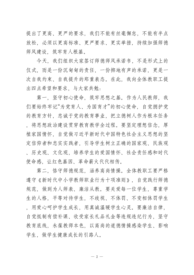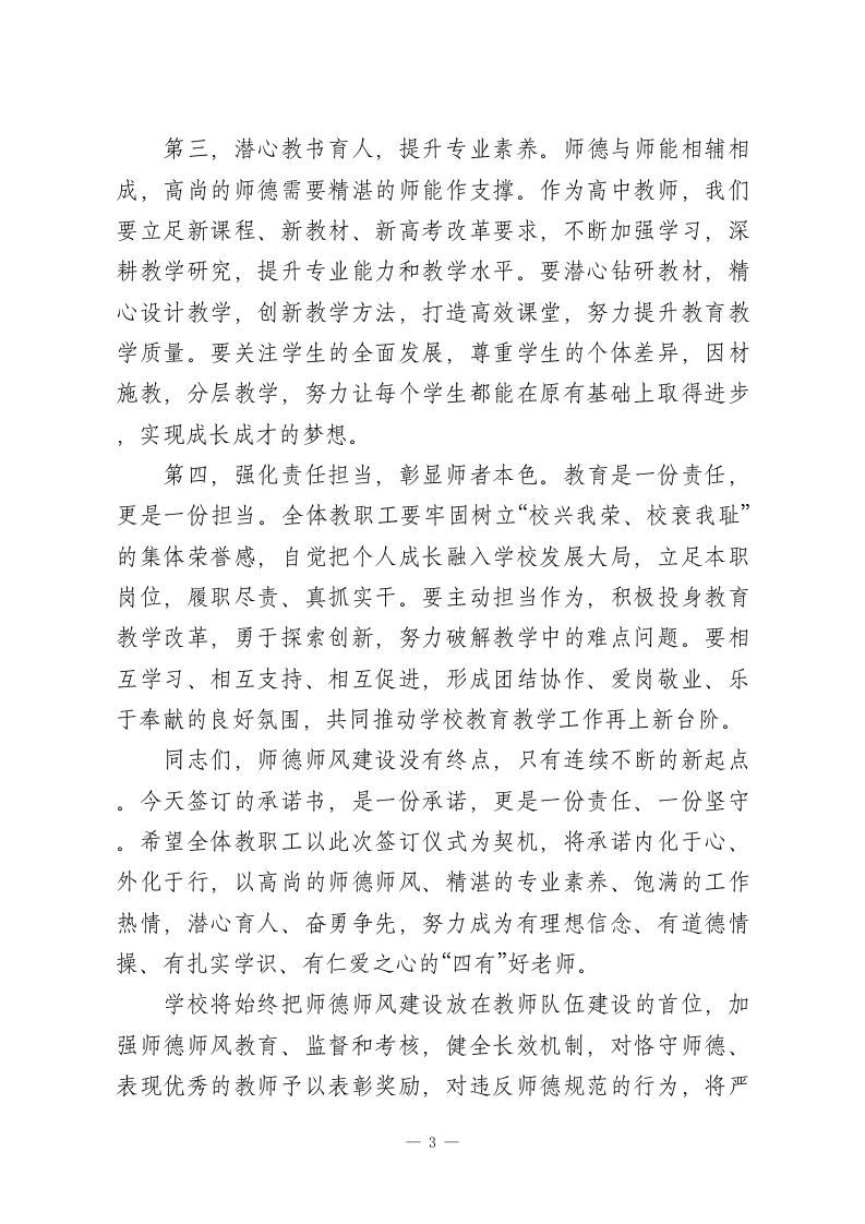 XX高中2026年春季学期师德师风承诺书签订仪式校长讲话尊敬的各位老师、同志们:大家上午好!春山可望,师者先行;德润桃李,薪火相传。今天,我们齐聚一堂,隆重举行XX高中2026年春季学期师德师风承诺书签订仪式。这既是一次庄严的承诺,更是一次深刻的思想洗礼、一次坚定的责任践行。在此,我谨代表学校领导班子,向辛勤耕耘在教育教学一线、默默奉献的全体教职工,致以最崇高的敬意和最诚挚的问候!师德师风是教育工作者的立身之本、育人之基,是学校办学质量的灵魂所在,更是新时代高中教育高质量发展的根本保障。作为高中教育工作者,我们肩负着培养担当民族复兴大任时代新人的神圣使命,肩负着为党育人、为国育才的重大责任。高中阶段是学生世界观、人生观、价值观形成的关键时期,我们的一言一行、一举一动,都将深刻影响学生的成长轨迹,都将关乎教育的温度与高度。过去一年,我校全体教职工坚守教育初心,恪守师德规范,立足本职岗位,潜心教书育人,用爱心、耐心、责任心诠释着人民教师的使命与担当,涌现出一大批师德高尚、业务精湛、深受学生喜爱的优秀教师,为学校的发展奠定了坚实基础,也赢得了社会各界和广大家长的充分认可。但我们也要清醒地认识到,师德师风建设永远在路上,新时代对教师的师德素养1