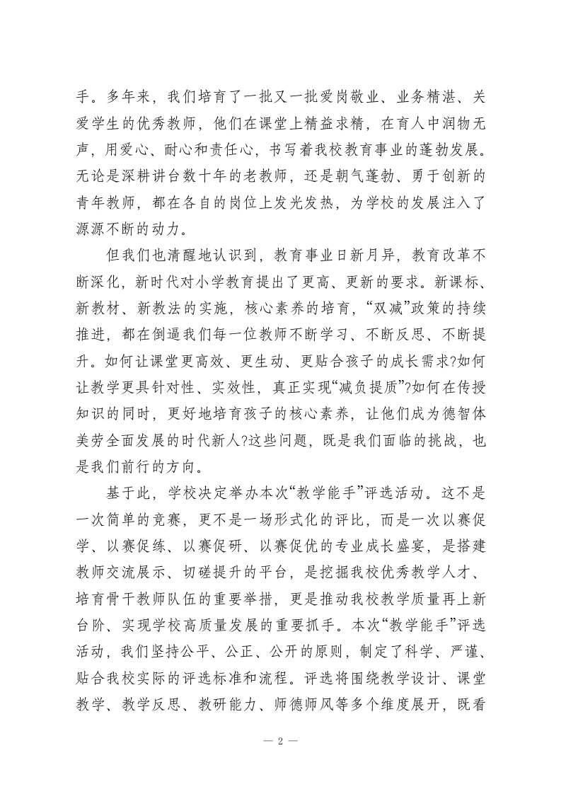 XX小学2026年春季学期“教学能手”评选活动启动会校长致辩尊敬的各位老师、亲爱的同事们:大家上午好!春回大地,万象更新;杏坛逐梦,薪火相传。在这充满生机与希望的季节里,我们怀着无比喜悦与期待的心情,齐聚一堂,隆重举行XX小学2026年春季学期“教学能手”评选活动启动会。首先,我谨代表学校党支部、校委会,向本次启动会的顺利召开表示热烈的祝贺!向踊跃报名、积极参与本次评选活动的每一位老师,致以最诚挚的敬意!向长期以来默默耕耘在教学一线、深耕课堂、潜心育人的全体教职工,表达最衷心的感谢!教育是一棵树摇动另一棵树,一朵云推动另一朵云,一个灵魂唤醒另一个灵魂。而教师,正是这棵树、这朵云、这个灵魂的承载者与传递者。作为小学教育工作者,我们肩负着启蒙心智、塑造品格、培育新人的神圣使命,我们的每一堂课、每一次交流、每一个举动,都可能成为孩子成长路上的一束光,影响他们的一生。小学阶段是孩子世界观、人生观、价值观形成的关键时期,是知识积累、习惯养成、能力提升的基础阶段,而高质量的教学,正是夯实这一基础、点亮孩子未来的核心力量。办学以来,我校始终坚持“立德树人”的根本任务,坚守“以生为本、以教为基、以质为魂”的办学理念,把教学质量作为学校发展的生命线,把教师专业成长作为提升教学质量的核心抓1