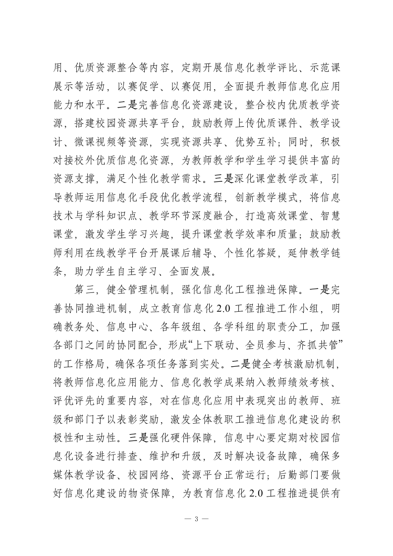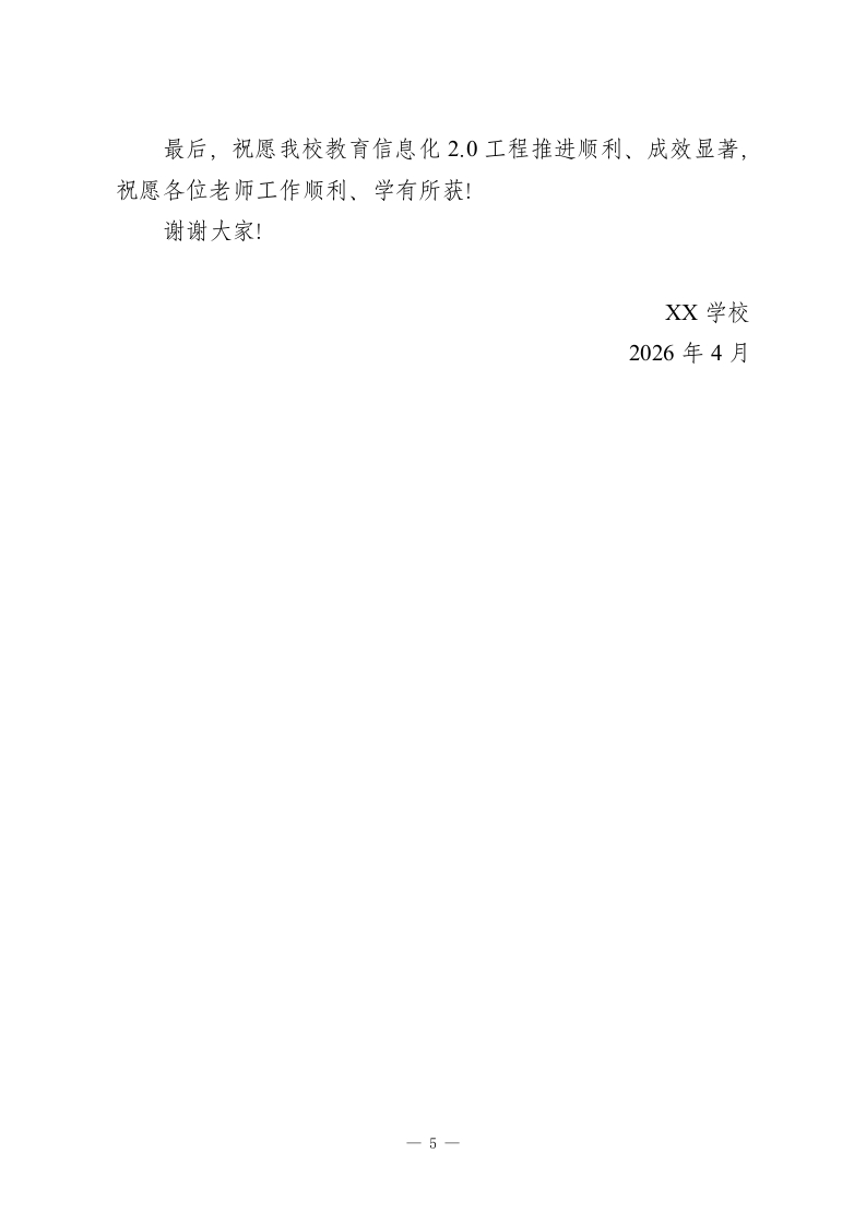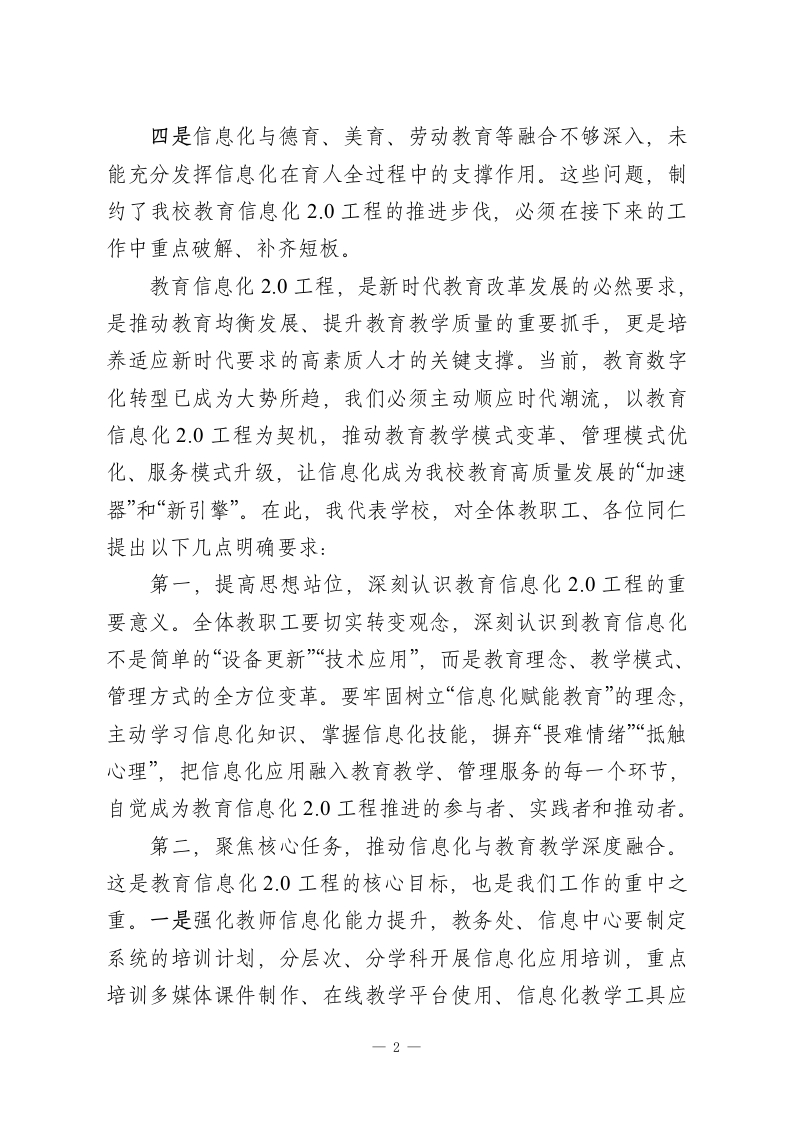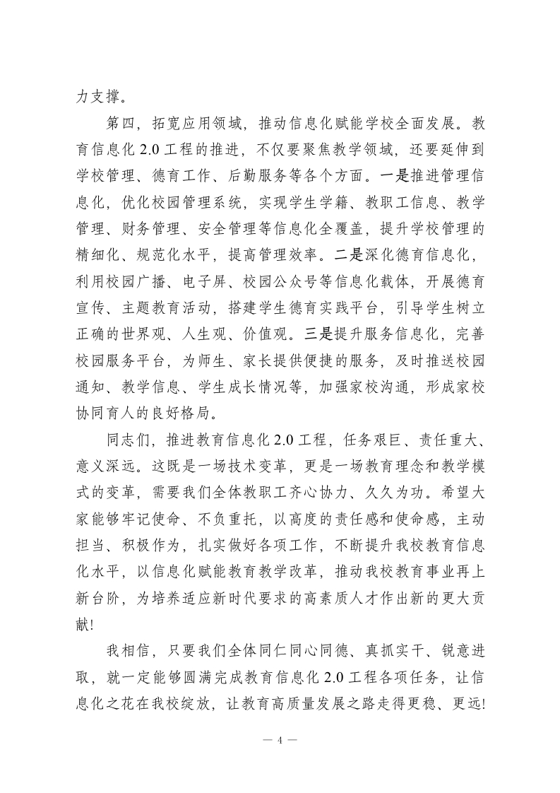 XX学校2026年4月教育信息化2.0工程推进会校长讲话各位老师、各位同仁,同志们:大家下午好!今天,我们召开本次教育信息化2.0工程推进会,主要任务是深入贯彻落实国家、省、市关于教育信息化发展的各项部署要求,全面总结我校教育信息化2.0工程前期推进情况,分析当前存在的问题与不足,明确下一阶段工作目标、重点任务和具体要求,进一步统一思想、凝聚共识、压实责任,推动我校教育信息化2.0工程高质量推进,以信息化赋能教育教学改革,助力学校教育高质量发展。近年来,我校高度重视教育信息化建设,逐步完善信息化硬件设施,推进多媒体教学设备全覆盖,开展教师信息化应用培训,引导教师运用信息化手段优化课堂教学,在教育信息化1.0向2.0转型的过程中取得了阶段性成效。但我们也要清醒地认识到,与教育信息化2.0工程的要求相比,与兄弟学校的先进经验相比,我们还存在一些差距和不足:一是部分教师信息化应用能力有待提升,对信息化工具、资源的运用不够熟练,难以将信息技术与学科教学深度融合;二是信息化资源建设不够完善,优质资源储备不足、共享不畅,难以满足个性化教学和学生自主学习的需求;三是信息化管理机制不够健全,各部门协同推进力度不足,信息化应用的考核与激励机制不够完善;1