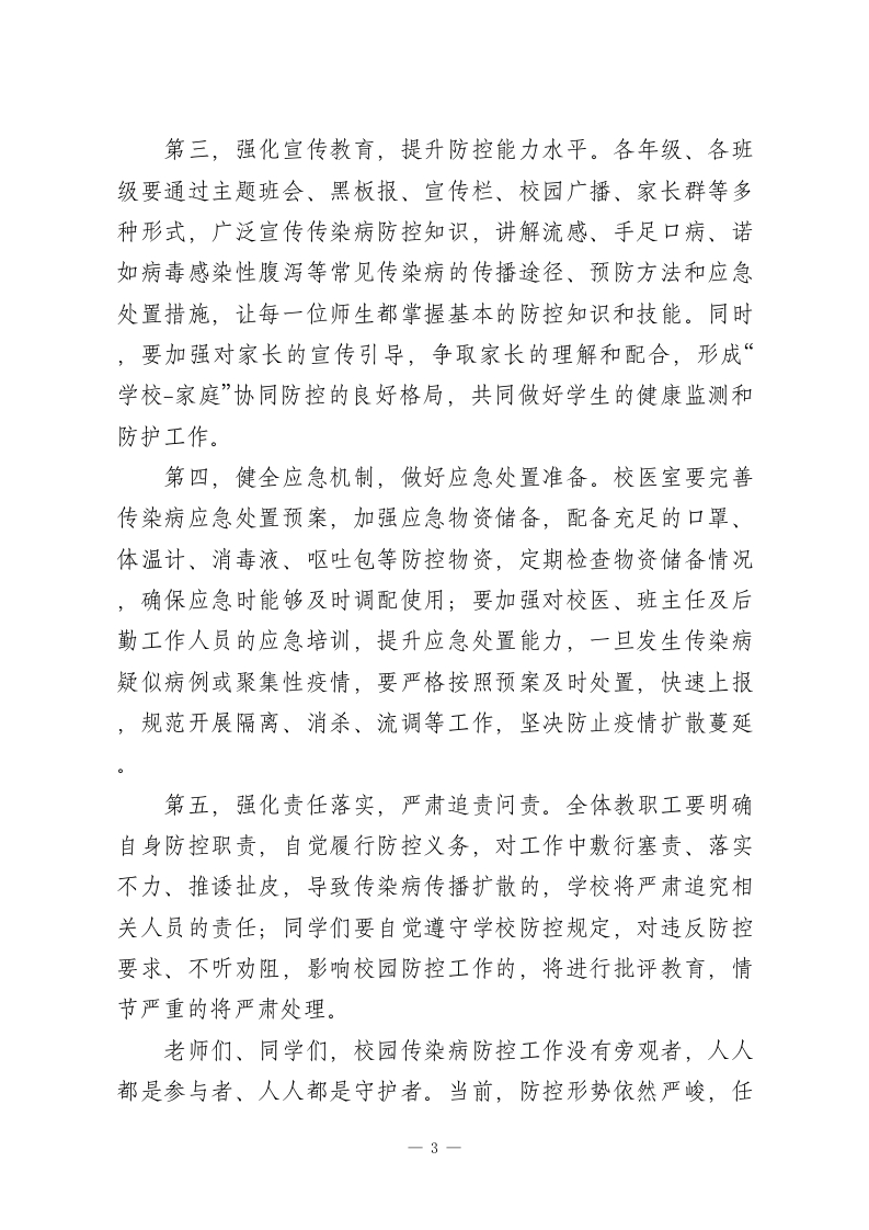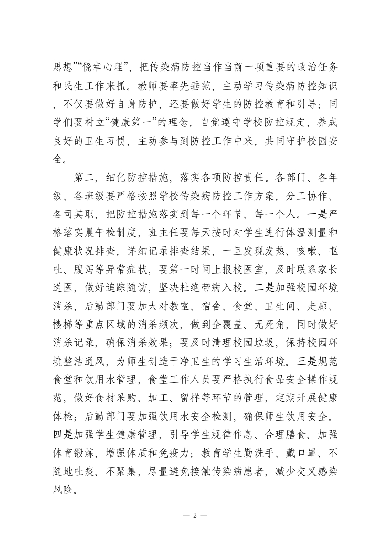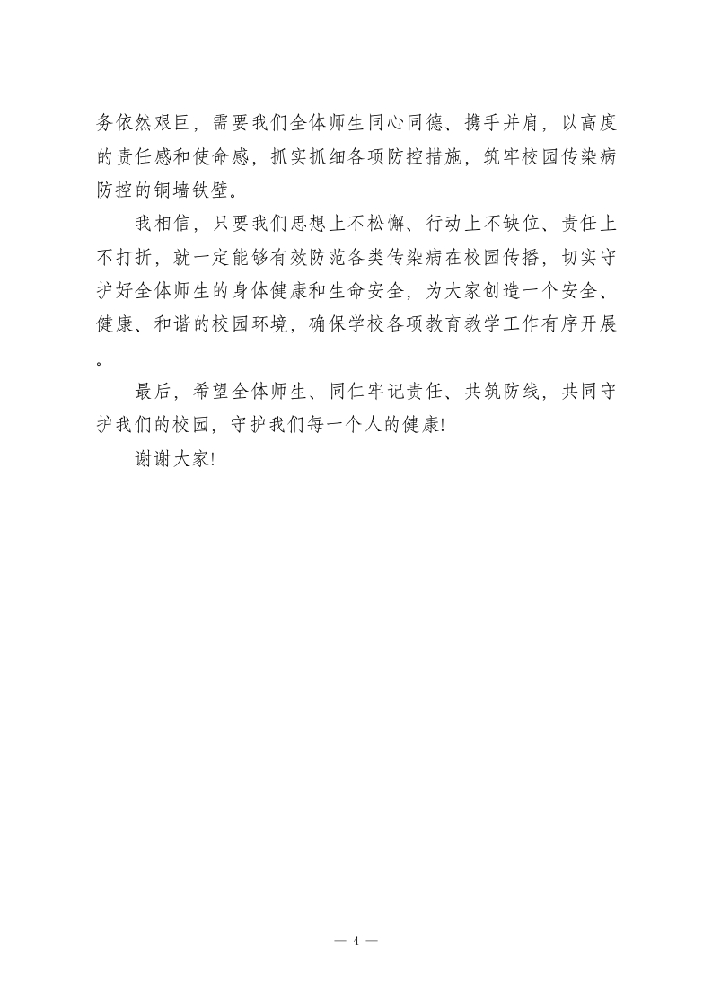 XX学校2026年4月校园传染病防控工作专题校长讲话各位老师、各位同学,各位后勤、安保同仁:大家上午好!春末夏初,气温回升、降水增多,正是流感、手足口病、诺如病毒感染性腹泻等各类传染病的高发期。校园是人员高度密集的场所,一旦发生传染病传播,不仅会影响师生的身体健康和正常学习生活,更会牵动每一个家庭的心,关乎学校的稳定发展。今天,我们专门召开这次校园传染病防控工作专题会议,就是要统一思想、提高认识、明确责任、细化措施,筑牢校园传染病防控安全防线,为全体师生的健康保驾护航。当前,周边地区已出现多起校园传染病散发案例,给我们敲响了警钟。结合我校实际,虽然前期我们已开展了一系列防控工作,取得了一定成效,但对照传染病防控的严格要求,仍存在一些薄弱环节:部分师生防控意识不强,个人卫生习惯有待改善;个别班级晨午检记录不够细致,异常情况上报不够及时;校园环境消杀的覆盖面和频次仍需加强;后勤保障的防控物资储备和管理还需进一步规范。这些问题,必须引起我们全体人员的高度重视,立即整改、补齐短板。在此,我代表学校,对全体师生、同仁提出以下几点明确要求,希望大家严格落实、坚决执行:第一,提高思想站位,筑牢防控思想防线。全体师生要深刻认识到校园传染病防控工作的重要性和紧迫性,摒弃“麻痹1