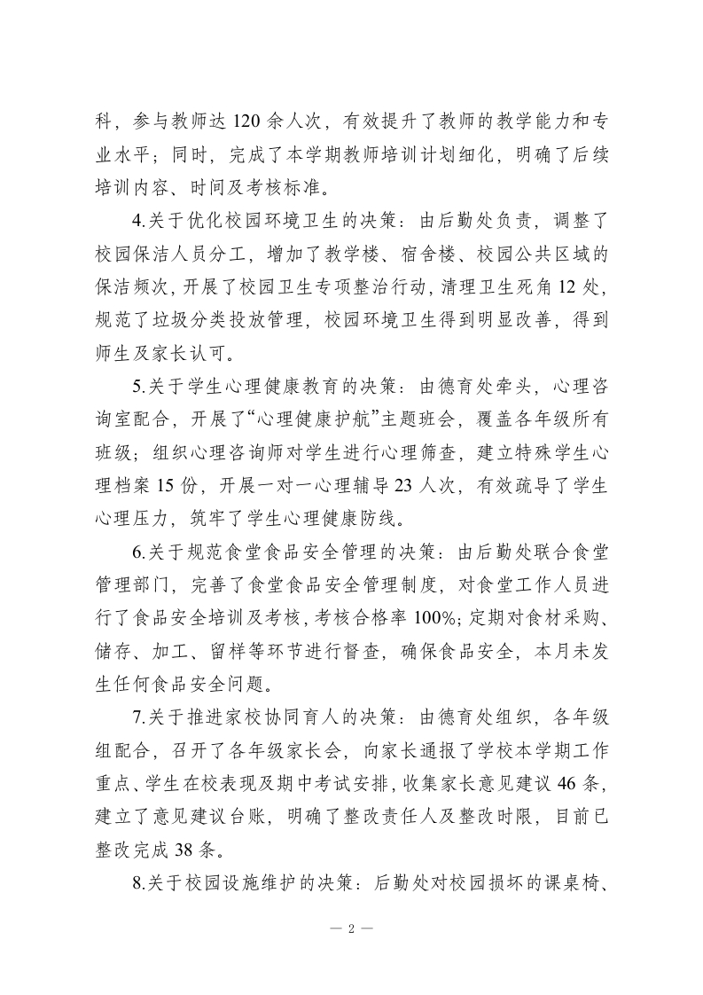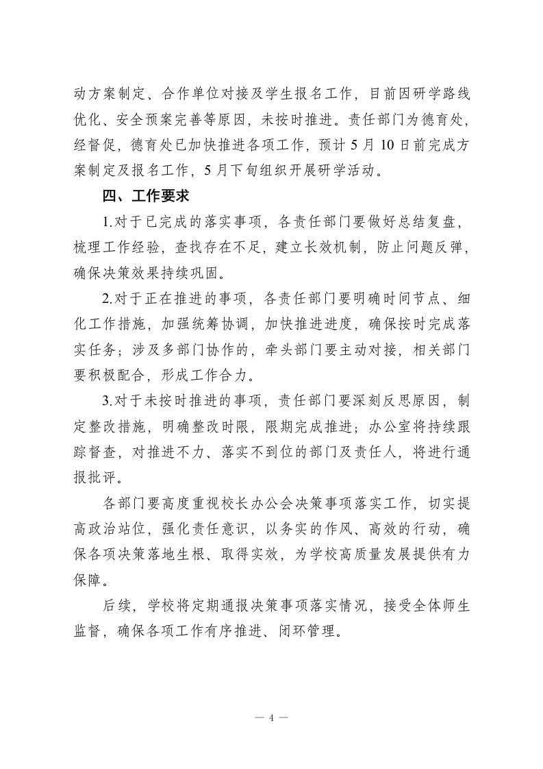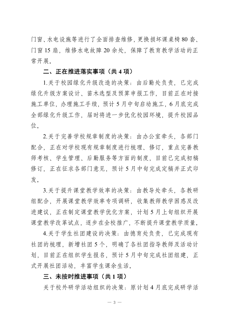 XX学校2026年4月校长办公会决策事项落实情况通报各部门、各年级组、各教研组:2026年4月,学校召开校长办公会,围绕学校教育教学、安全管理、校园建设、师资队伍建设等重点工作,研究确定了一系列决策事项。为确保各项决策落地见效、闭环管理,现将本月决策事项落实情况通报如下:一、已完成落实事项(共8项)1.关于2026年春学期期中考试组织工作的决策:由教导处牵头,各年级组、教研组配合,已完成各学科试卷命题、审核、印刷工作,明确了考试时间安排、考场布置、监考职责及阅卷标准,制定了应急预案,确保期中考试平稳有序开展,目前已顺利完成考试组织工作,正在推进阅卷及成绩分析。2.关于校园安全隐患排查整治的决策:由安全办牵头,联合后勤处、各年级组,对校园教学楼、宿舍楼、食堂、实验室、消防设施、电气线路等进行全面排查,共排查出安全隐患6处,其中消防器材过期、楼梯间杂物堆放等4处隐患已全部整改完毕,剩余2处设施维修隐患已联系施工单位,完成维修方案制定,将于5月5日前整改到位(此处为阶段性完成,后续将持续跟进闭环)。3.关于提升教师专业素养的决策:由教师发展中心组织,开展了2026年春学期第二次校本教研活动,邀请校外专家开展专题讲座2场,组织各学科公开课、示范课8节,覆盖全部学一1