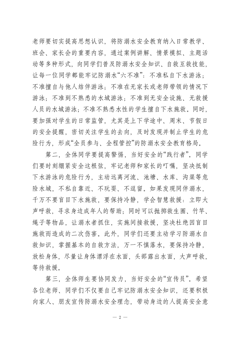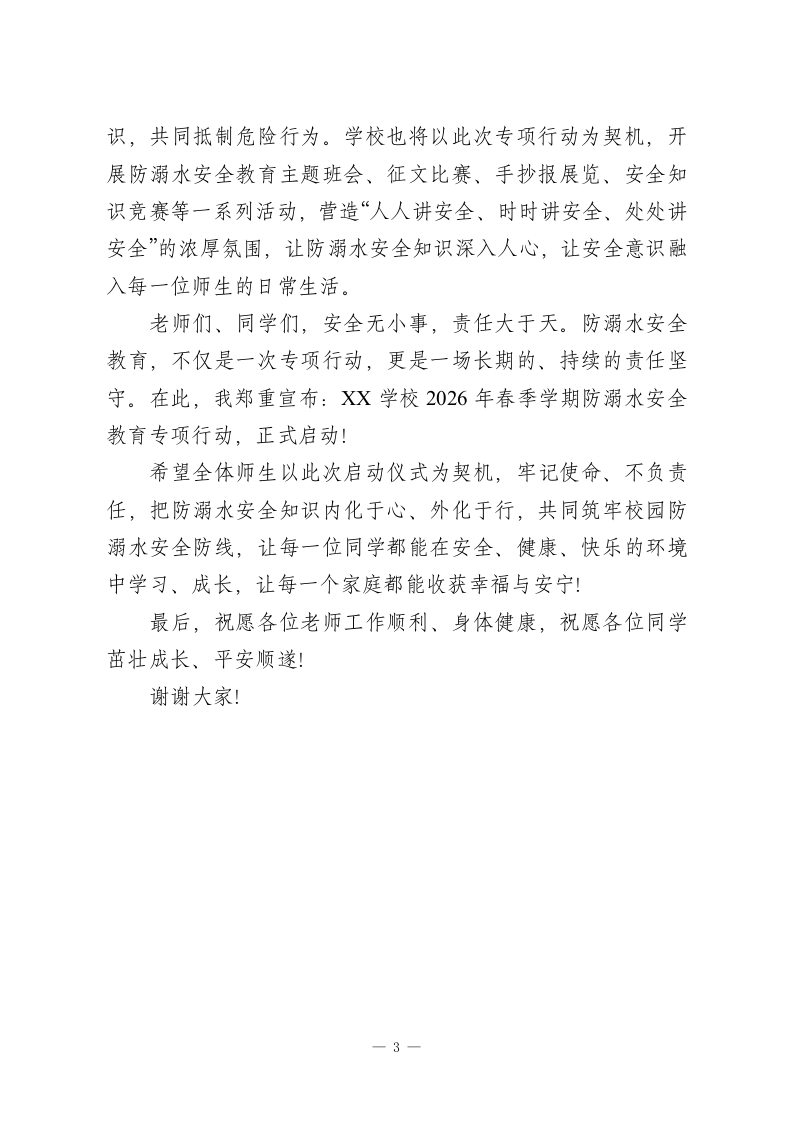 XX学校2026年春季学期防溺水安全教育专项行动启动仪式校长讲话尊敬的各位老师、亲爱的同学们:大家上午好!春回大地,万物复苏,在这充满生机与希望的季节里,我们开启了2026年春季学期的崭新征程。与此同时,气温回升、降水增多,溺水事故也进入了高发、易发期,防溺水安全成为当前校园安全工作的重中之重。今天,我们齐聚在这里,隆重举行XX学校2026年春季学期防溺水安全教育专项行动启动仪式,目的就是进一步提高全体师生的防溺水安全意识,明确责任、强化措施,筑牢校园防溺水安全防线,守护每一位同学的生命安全。生命至上,安全第一。同学们,生命只有一次,它承载着父母的期盼、老师的关爱,更承载着你们自已的美好未来。近年来,全国各地中小学生溺水事故时有发生,一个个鲜活的生命消逝在水中,一个个幸福的家庭破碎,这些惨痛的教训,时刻警醒着我们:防溺水安全无小事,容不得丝毫麻痹大意,容不得半点侥幸心理。作为学校,守护每一位同学的生命安全,是我们义不容辞的责任;作为老师,普及防溺水安全知识,是我们不可推卸的使命;作为同学们,学会自我保护,远离危险水域,是对自已、对家庭最基本的负责。在此,我向全体师生提出三点明确要求:第一,全体老师要牢记责任,当好安全的“守护者”。各位1