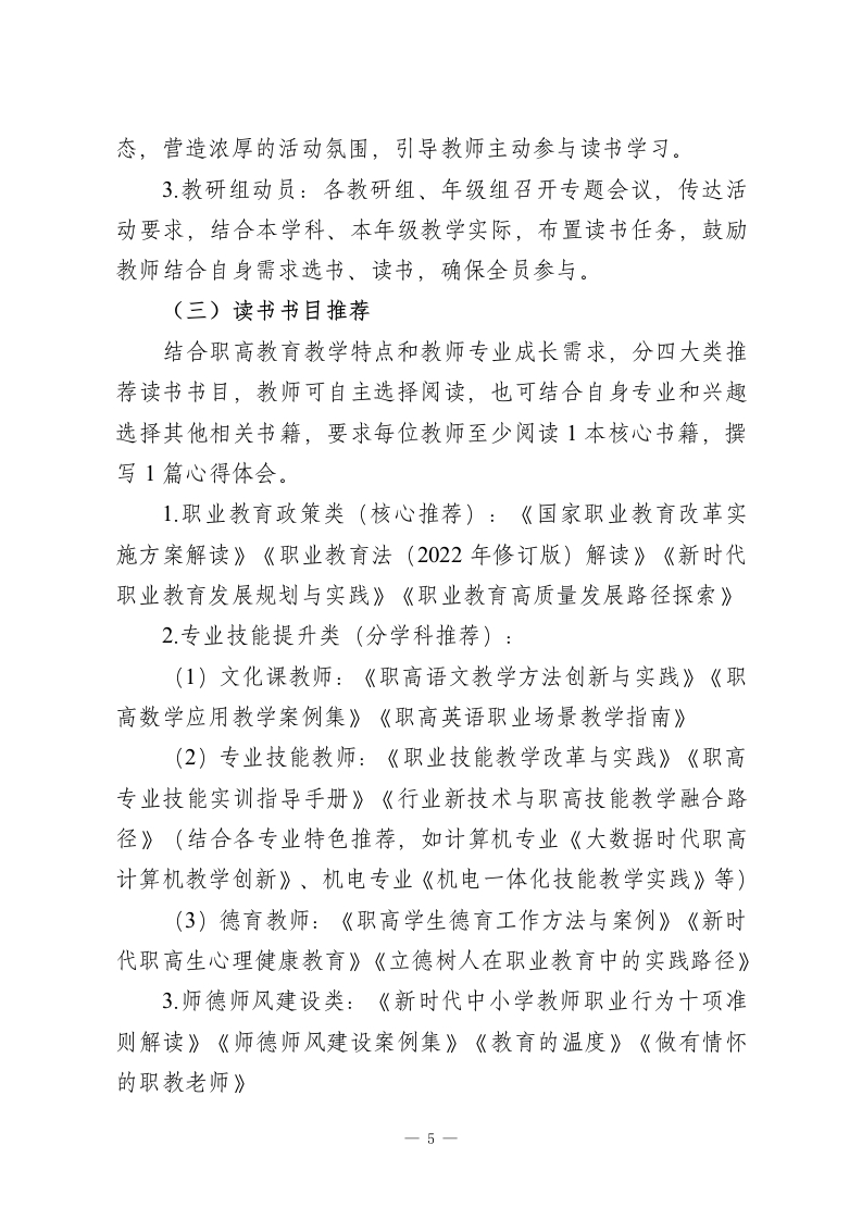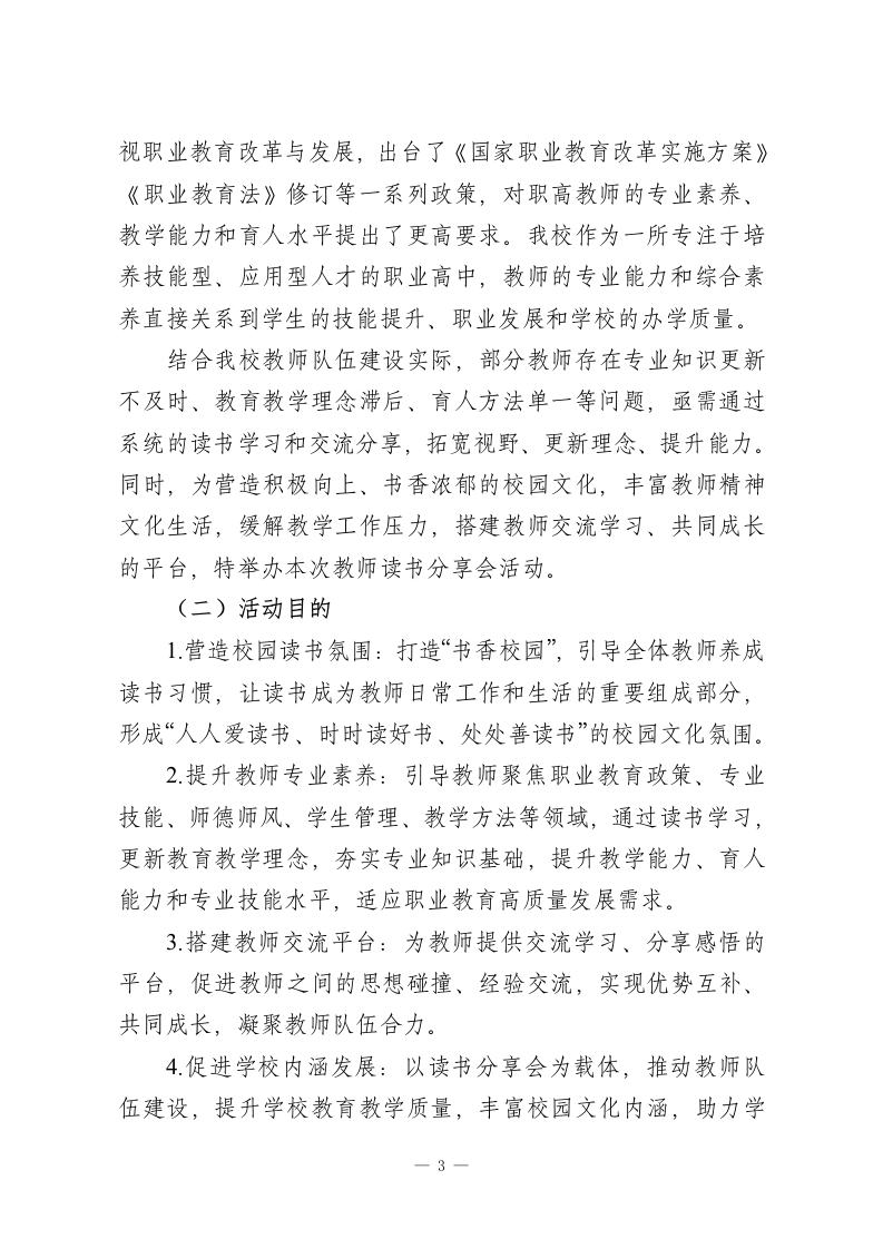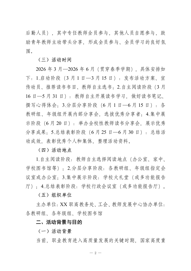 XX职高2026年春季学期教师读书分享会活动方案为深入推进我校教师队伍建设,营造良好的校园读书氛围,引导全体教师养成爱读书、读好书、善读书的良好习惯,提升教师的专业素养、文化底蕴和教育教学能力,落实职业教育高质量发展要求,促进教师专业成长与学校教育教学工作深度融合,结合我校2026年春季学期工作安排,特制定本次教师读书分享会活动方案。本方案立足职高教育特色,结合我校教师教学实际和职业教育发展趋势,明确活动主题、流程、要求和保障措施,确保读书分享会活动有序开展、取得实效,助力打造一支师德高尚、业务精湛、充满活力的高素质职高教师队伍,为我校职业教育内涵发展注入新的动力。一、活动基本信息(一)活动主题读专业之书,育职教之人;以书香润初心,以笃行担使命解读:本次读书分享会以“专业成长”为核心,紧扣职高教育教学特点,引导教师聚焦职业教育政策、专业技能提升、师德师风建设、学生管理等相关书籍,通过读书学习、交流分享,夯实专业基础、提升育人能力,坚守教育初心,践行职教使命,助力学生成长成才和学校高质量发展。(二)活动对象XX职高全体教职工(含专任教师、行政人员、教辅人员、一1