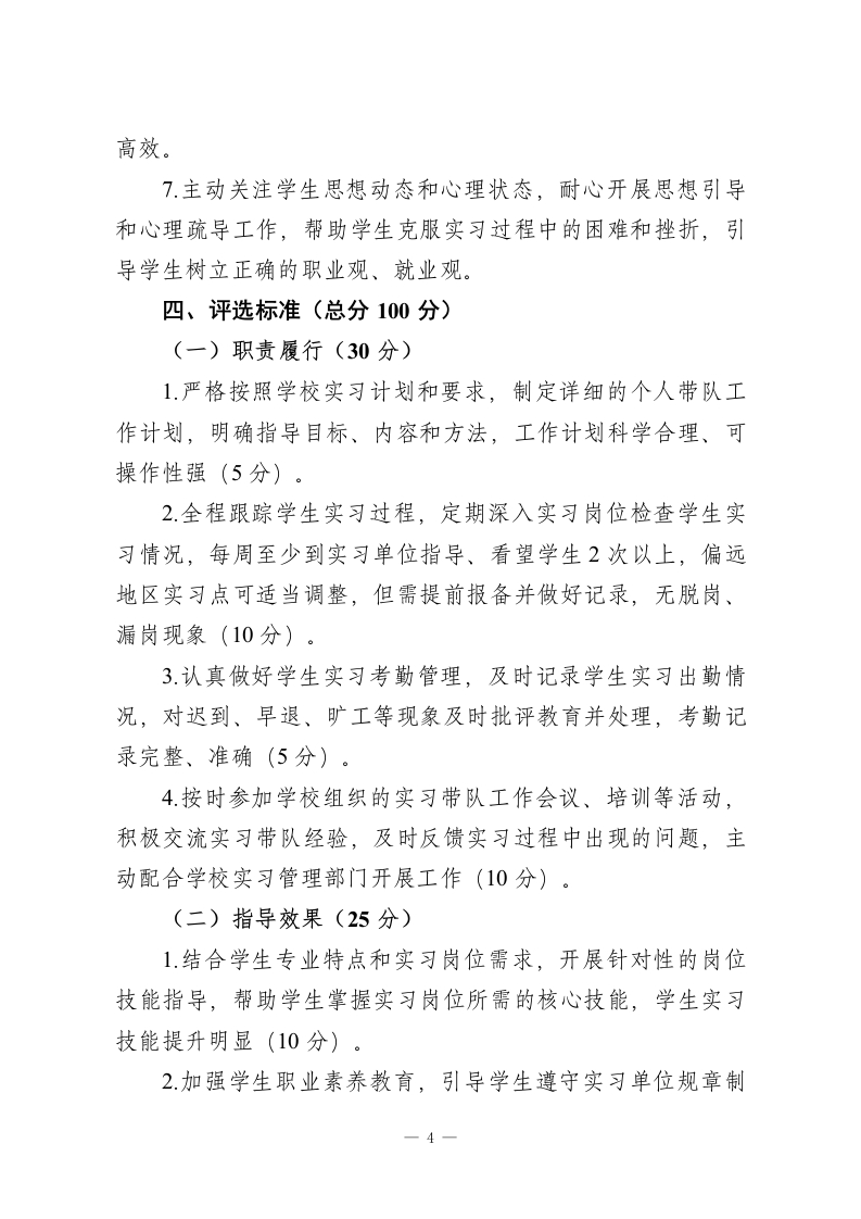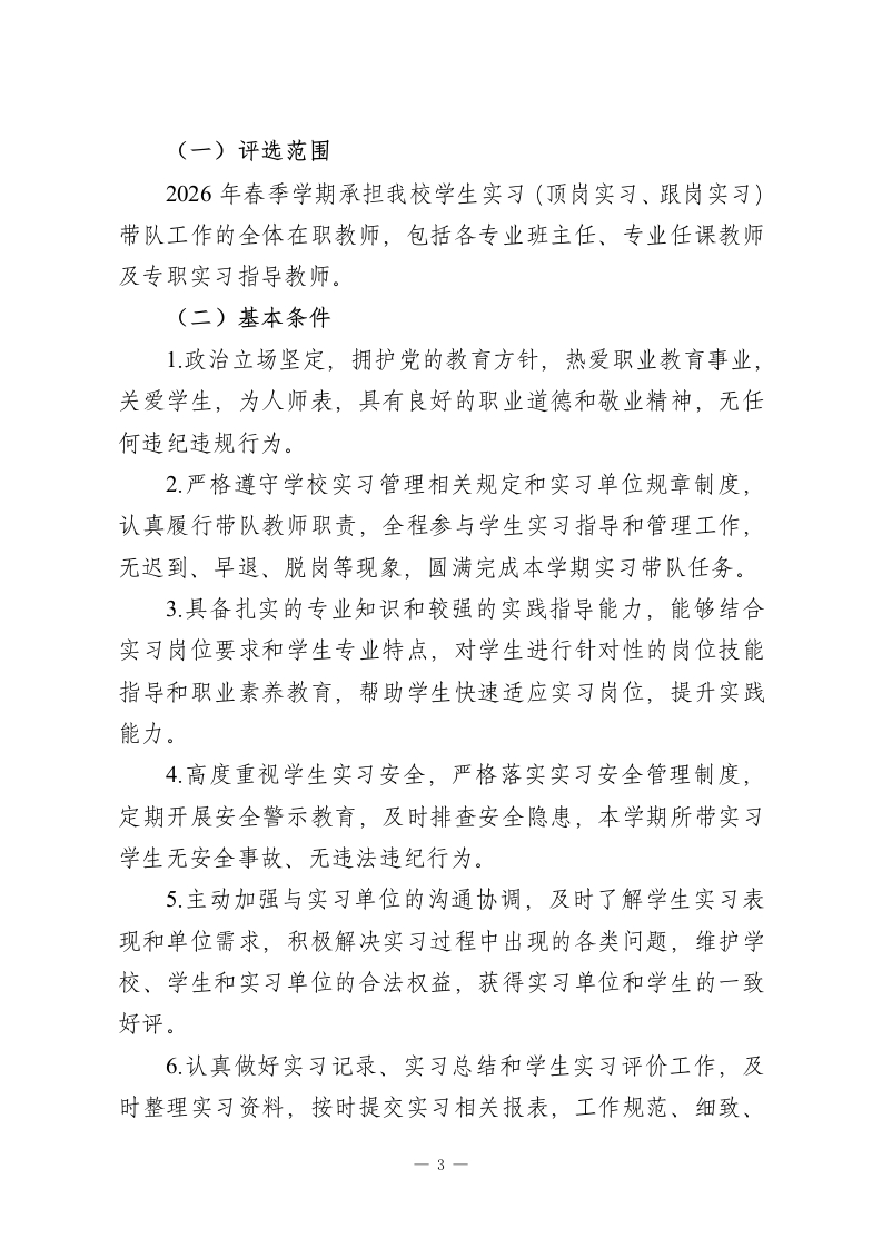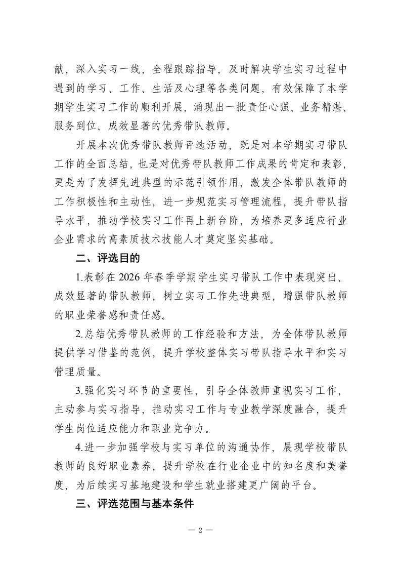 XX职高2026年春季学期学生实习优秀带队教师为深入贯彻职业教育“以就业为导向、以能力为本位”的办学理念,强化学生实习实践环节管理,充分发挥带队教师在学生实习过程中的指导、管理和服务作用,表彰先进、树立典型,激励全体带队教师履职尽责、锐意进取,不断提升学生实习质量和人才培养水平,经学校研究决定,开展2026年春季学期学生实习优秀带队教师评选活动。本材料详细明确评选相关要求、流程及表彰事宜,同时对优秀带队教师的职责、事迹及典型案例进行全面梳理,为评选工作开展和优秀教师表彰提供规范依据。一、评选背景与意义2026年春季学期,XX职高严格按照国家、省、市关于职业学校学生实习管理的相关规定,结合学校各专业人才培养方案,有序组织各年级、各专业学生开展顶岗实习、跟岗实习工作。本学期共安排实习学生XX名,涉及会计电算化、计算机应用、机电一体化、幼儿保育、汽车运用与维修、电子商务等XX个专业,对接实习单位XX家,派遣带队教师XX名。学生实习是职业教育人才培养的关键环节,是衔接校园学习与岗位实践的重要桥梁,而带队教师作为学生实习期间的直接管理者、指导者和服务者,肩负着保障学生实习安全、指导学生岗位技能、引导学生职业素养、协调实习单位关系的重要职责。在本学期实习工作中,全体带队教师恪尽职守、默默奉—1