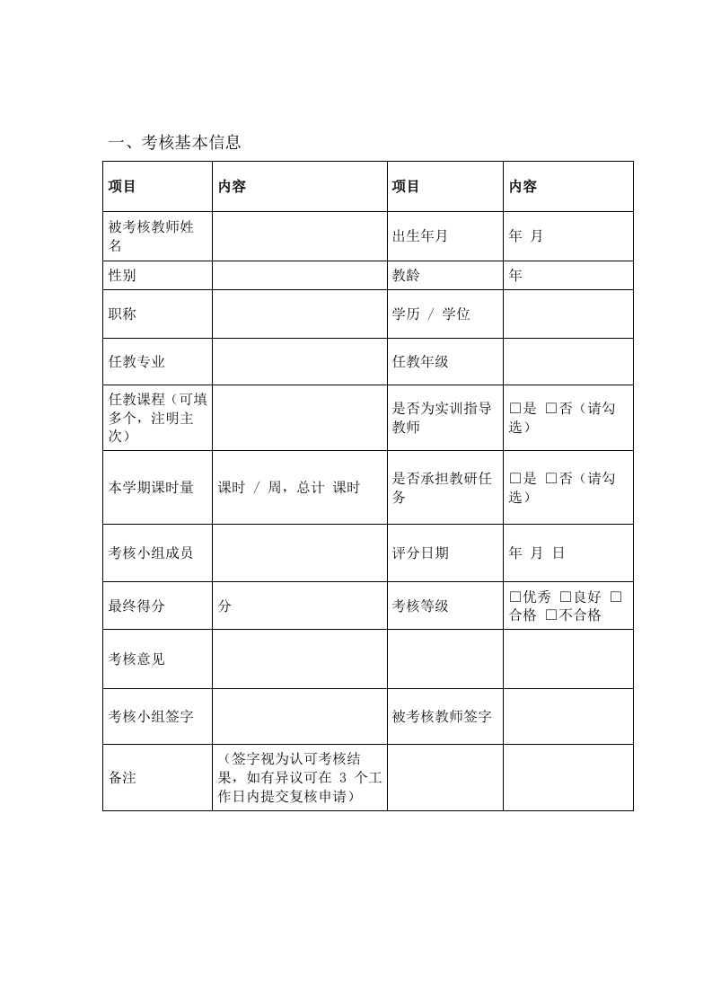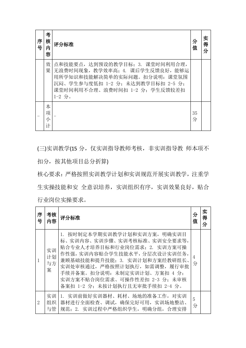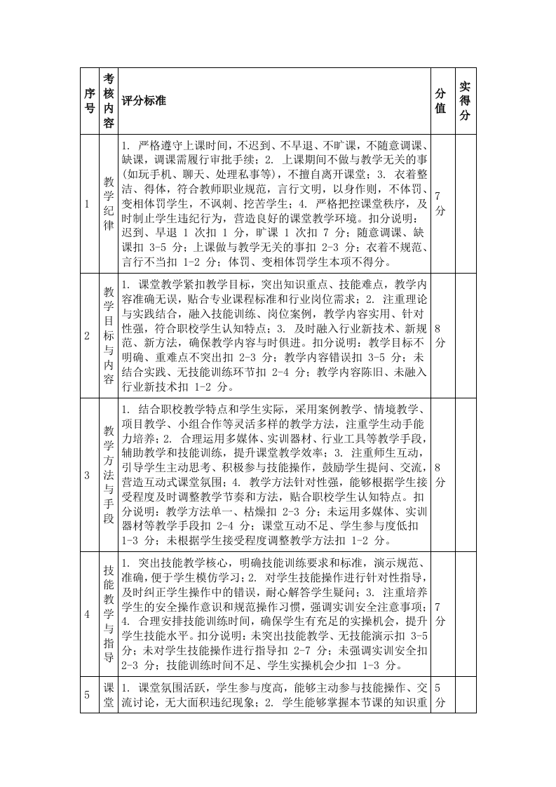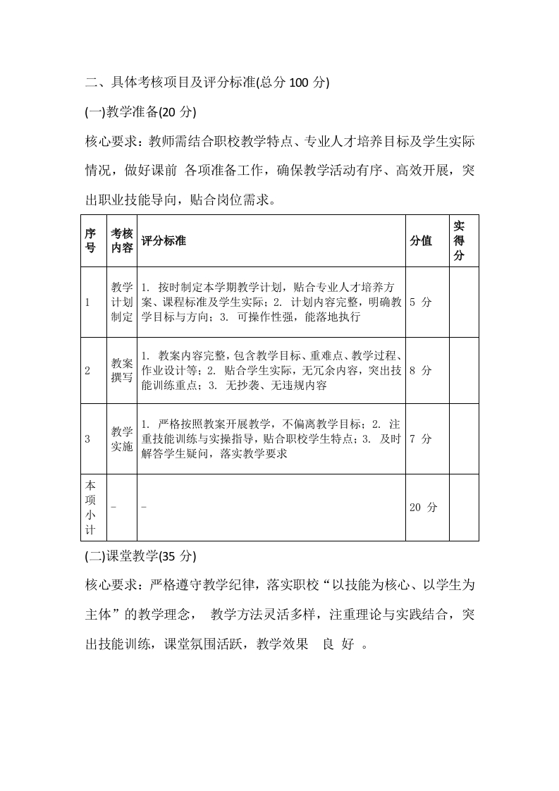 X职校2026年春季学期教师教学常规考核评分表考核学期:2026年春季学期X月X日考核时间:2026年X月X日一2026考核单位(盖章):Xx职业技术学校教务处考核负责人:xX说明:1.本次考核对象为我校2026年春季学期全体在岗专任教师、实训指导教师,考核结果将作为教师评优评先、职称晋升、绩效工资发放的重要依据;2.考核实行百分制,总分100分,其中教学准备20分、课堂教学35分、实训教学(仅实训指导教师)15分、作业与辅导15分、教学反思与教研10分、师德师风5分:3.考核等级分为优秀(90分及以上)、良好(80-89分以、合格(60-79分)、不合格(60分以下):4.各考核项目需结合教师实际工作情况,实事求是评分,严禁弄虚作假,每一项评分需附具体评分说明:5.本评分表一式三份,教务处、考核小组、被考核教师各留存一份,作为后续工作参考。