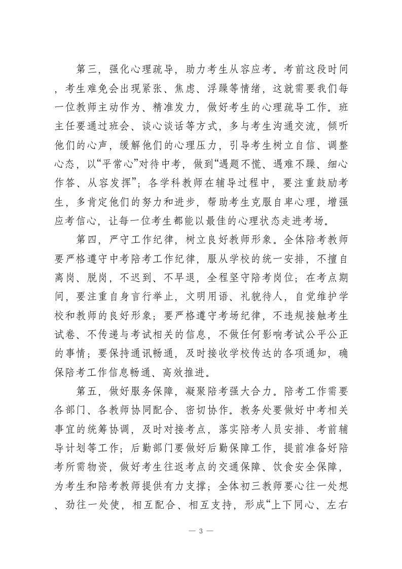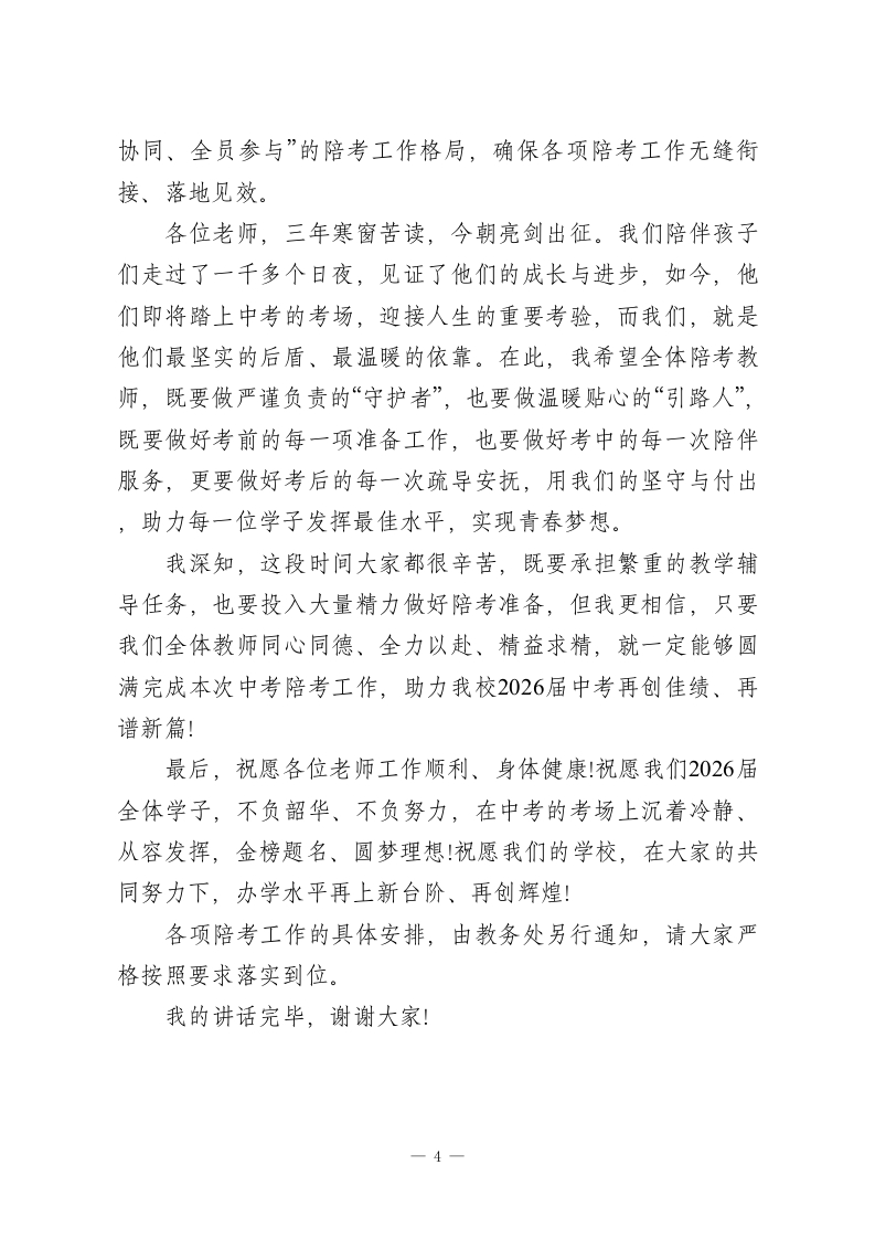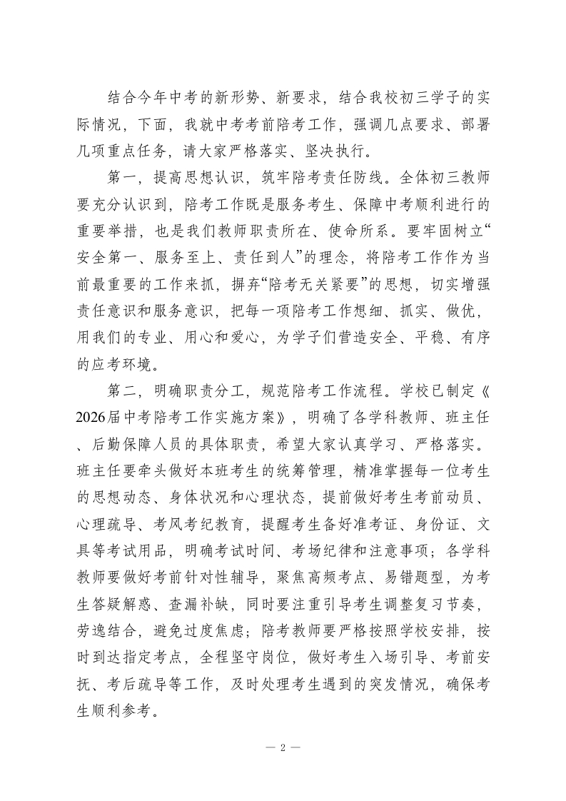 XX中学2026届中考考前教师陪考工作部署会校长讲话各位老师:大家下午好」时维初夏,逐梦正酣;中考在即,使命在肩。今天,我们齐聚一堂,召开2026届中考考前教师陪考工作部署会,主要任务是统一思想、明确职责、细化举措,全面部署中考陪考各项工作,凝聚全体初三教师的合力,为我校2026届学子保驾护航,助力他们以最佳状态迎战中考、决胜考场。首先,我代表学校领导班子,向辛勤耕耘在初三教学一线、默默付出的全体教师,致以最诚挚的感谢和最崇高的敬意!感谢大家三年来的坚守与奉献,感谢大家在冲刺阶段的全力以赴、并肩作战!中考,是孩子们人生中第一次重要的选拔性考试,关乎每一位学子的青春梦想,关乎每一个家庭的殷切期盼,更关乎我们学校的办学声誉和发展未来。陪考工作,不是简单的“到场陪伴”,而是责任的传递、信心的支撑、温暖的守护,更是我们落实立德树人根本任务、彰显教育温度的重要体现。每一位陪考教师,都是学子们考场外最坚实的后盾,是他们从容应考的底气所在。当前,中考已进入最后的冲刺倒计时,陪考工作任务艰巨、责任重大,希望全体教师提高政治站位,深刻认识陪考工作的重要意义,以高度的责任感、严谨的工作作风、饱满的工作热情,全力以赴做好各项陪考工作。一1