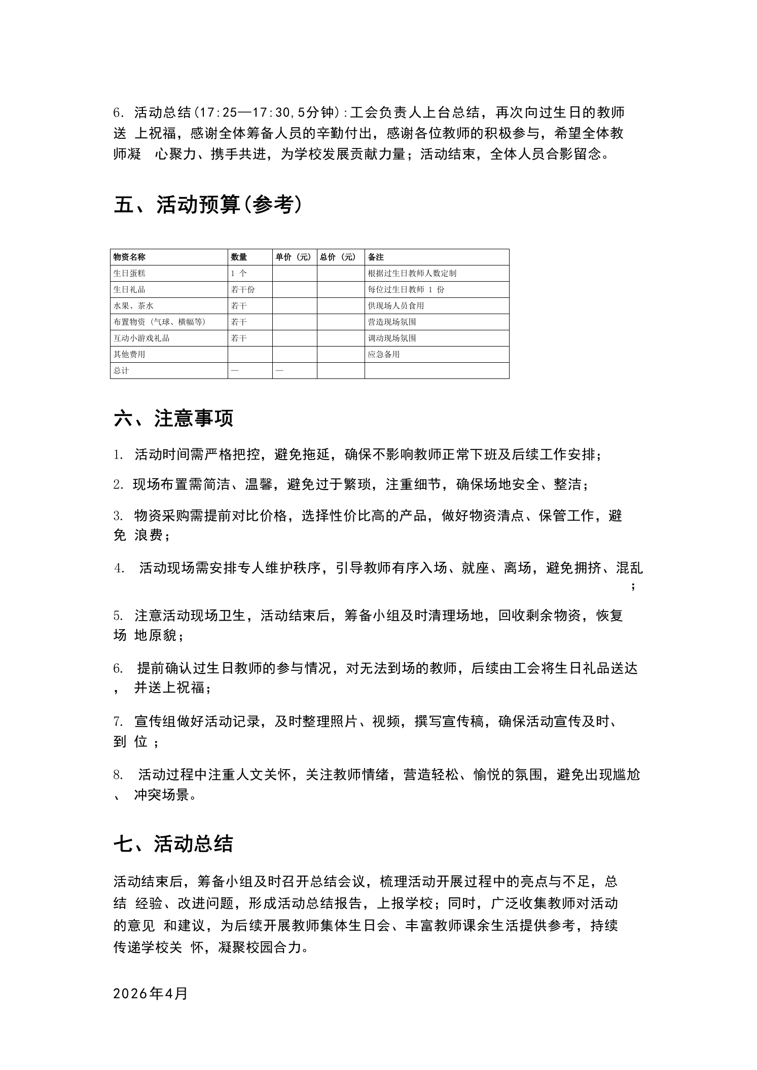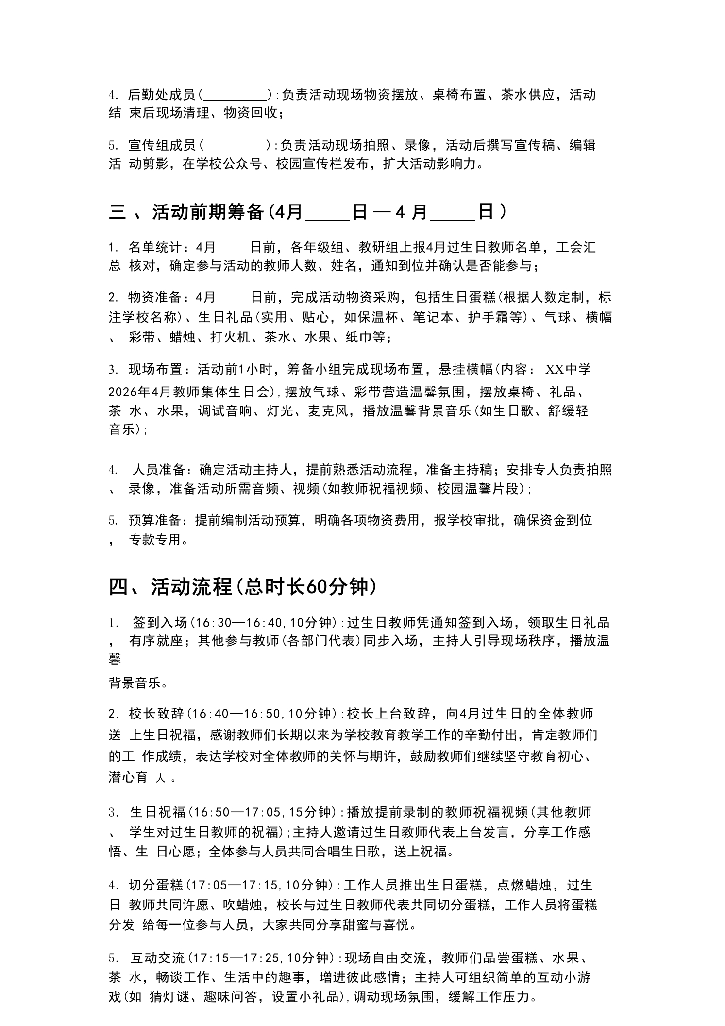 XX中学2026年4月教师集体生日会活动方案为进一步凝聚校园力量,传递学校对全体教师的关怀与温暖,增强教师的归属感、幸福感和团队凝聚力,营造和谐、友爱、奋进的校园氛围,切实让教师感受到学校大家庭的温暖,缓解工作压力,激发工作热情,结合学校实际,特举办XX中学2026年4月教师集体生日会,具体方案如下:一、活动基本信息项目具体内容活动主题情暖校园,致敬师者一X中学4月教师集体生日会活动对象X中学2026年4月过生日的全体教职工(提前统计名单,确保无遗漏)活动时间2026年4月日(周)下午16:30一17:30(避开教学高峰时段,不影响正常教学秩序剂)活动地点学校多功能报告厅(或大会议室,提前布置,营造温馨氛围)主办单位双中学工会、教务处、德育处活动目的1.为4月过生日的教师送上祝福。传递学校关怀,让教师感受到校园温暖:2.丰富教师课余生活,缓解工作压力,增进教师之间的交流与友道:3.凝聚团队力量,增强教师归属感,激发教师投身教育教学工作的热情,推动学校教育事业稳步发展。二、活动筹备小组及职责为确保活动顺利开展,成立活动筹备小组,明确分工、协同配合,具体分工如下:(一)筹备小组组长组长:(职务:),负责统筹活动整体安排,审批活动预算、方案,协调各部门工作,确保活动有序推进。(二)筹备小组成员及分工1.工会成员():负责统计4月过生日教师名单、联系生日教师,收集教师需求,准备活动礼品、生日蛋糕,协调活动流程细节;2.教务处成员():负责协调活动时间,确保不与教学、教研活动冲突,通知各年级组、教研组过生日教师按时参与活动;3.德育处成员():负责活动现场布置、氛围营造(如气球、横幅、灯光等),安排活动主持人,准备活动流程所需音频、视频素材;