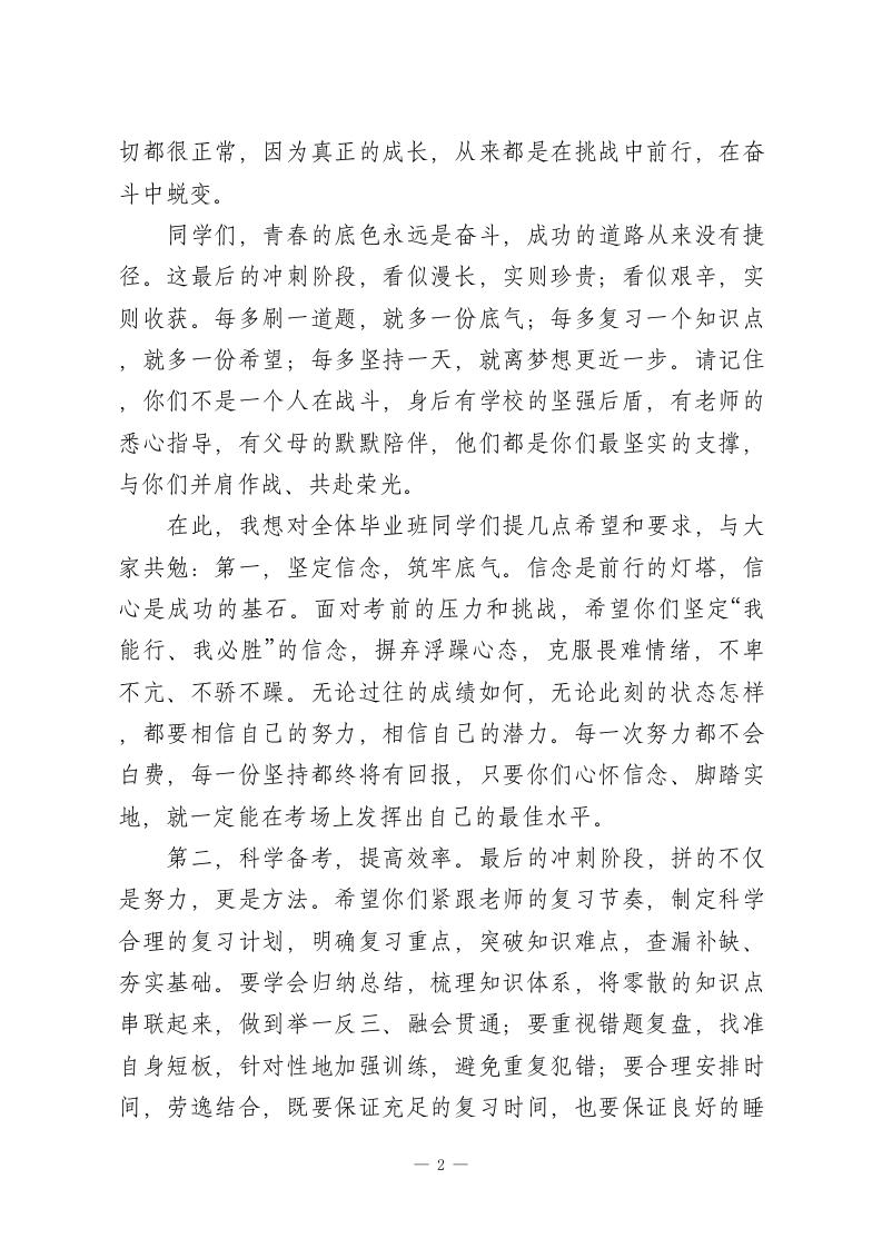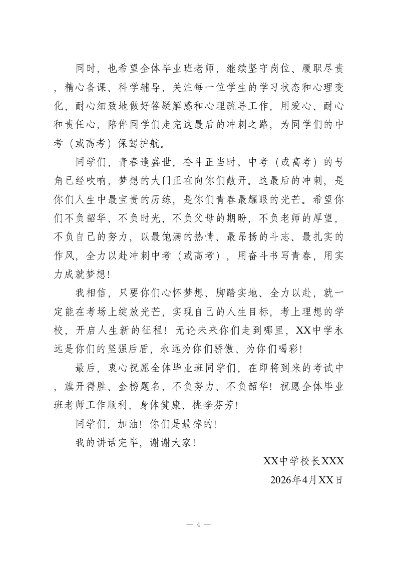 XX中学2026年春季学期毕业班学生考前动员校长讲话尊敬的各位老师,亲爱的毕业班同学们:大家下午好!春潮涌动,万象更新,在这充满希望与挑战的时节,我们齐聚一堂,召开2026年春季学期毕业班考前动员大会。首先,我谨代表学校,向辛勤耕耘在教学一线、默默奉献的全体毕业班老师,致以最崇高的敬意和最诚挚的感谢!向即将奔赴考场、迎接人生重要考验的全体毕业班同学们,致以最殷切的期望和最美好的祝福!同学们,时光荏苒,岁月如梭,转眼间,你们在XX中学的初中(或高中)时光即将画上圆满的句号。回首过往,教室里有你们伏案苦读的身影,操场上有你们挥洒汗水的模样,课堂上有你们积极思考的眼神,校园的每一个角落,都留下了你们成长的足迹、奋斗的印记。这几年,你们从懵懂青涩走向沉稳成熟,从迷茫困惑走向坚定自信,在知识的海洋中遨游,在成长的道路上前行,你们用努力和坚持,书写着属于自已的青春篇章。今天,距离中考(或高考)仅剩一个多月的时间,这是你们人生中至关重要的一次考验,是对你们几年寒窗苦读的全面检验,更是你们实现梦想、奔赴新征程的重要起点。此刻,我知道,你们当中,有人满怀信心、斗志昂扬,也有人些许紧张、些许迷茫,甚至有人感到疲惫、想要退缩。但我想说,这一1