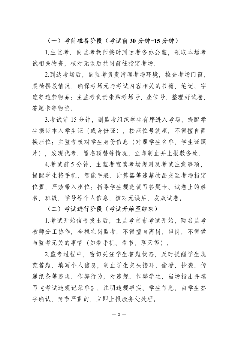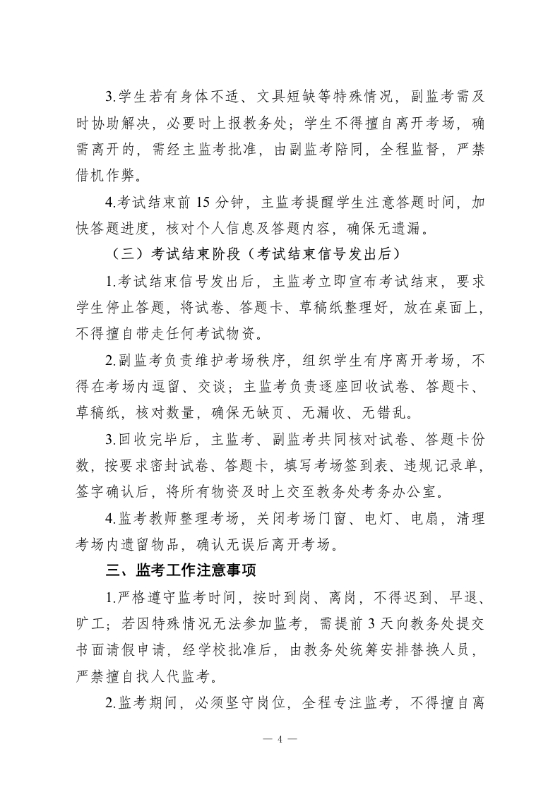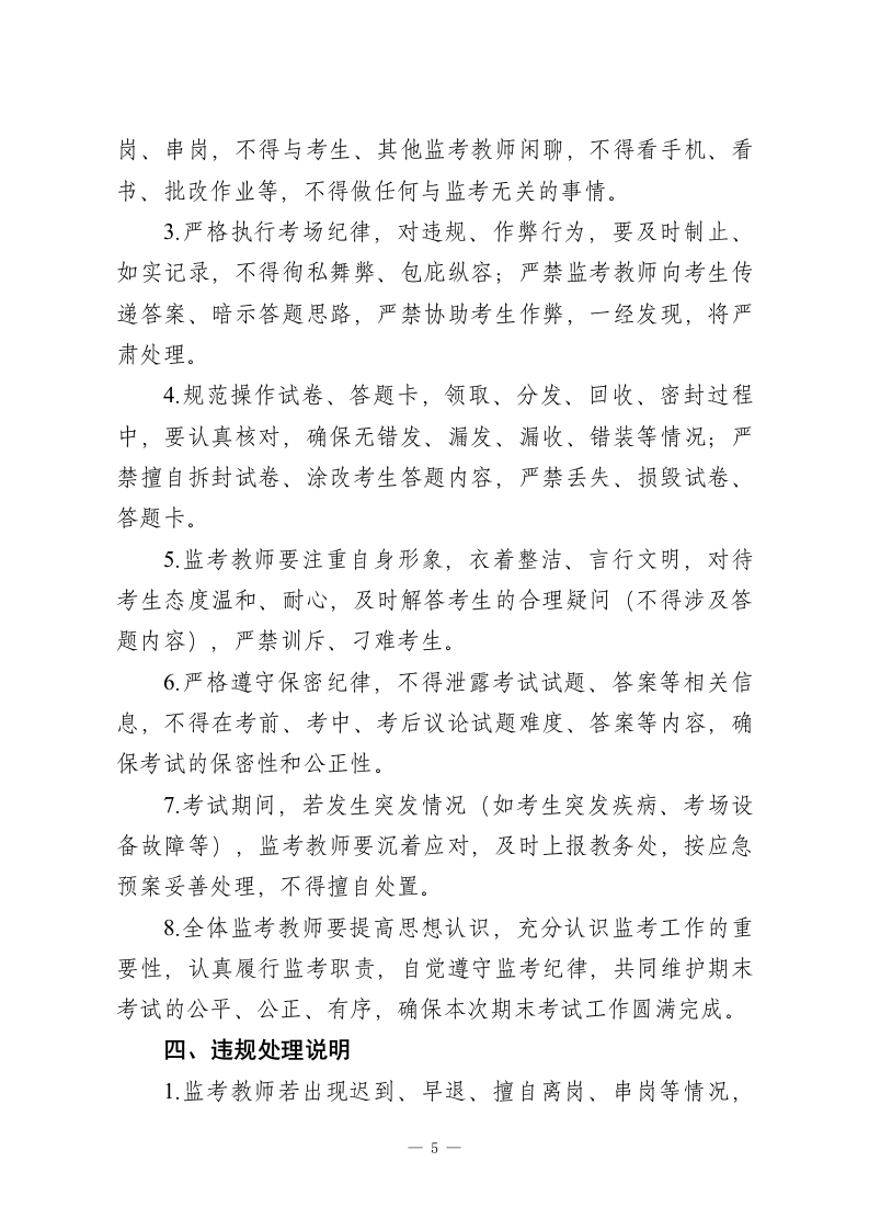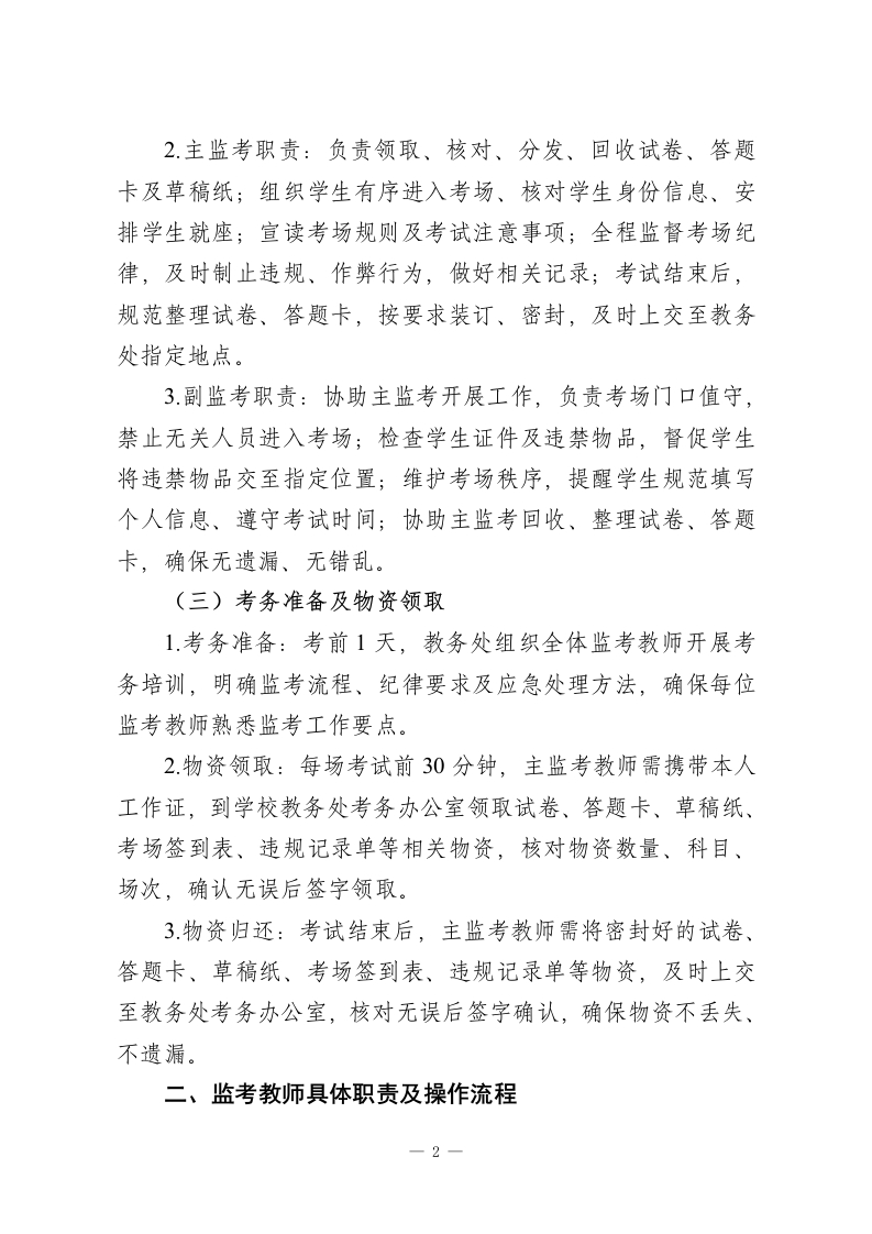 XX中学2026年春季学期教师期末监考安排及注意事项期末考试是检验本学期教育教学成果、评价学生学业水平的重要环节,监考工作是维护考试公平、公正、有序开展的核心保障。为规范我校2026年春季学期期末监考工作,明确监考教师职责,细化监考流程,严肃考风考纪,确保期未考试工作顺利推进,结合我校实际情况,特制定本教师期未监考安排及注意事项,请全体监考教师严格遵照执行。本次期末监考工作覆盖初一至初三全体学生,涉及各学科期末检测,全体在岗教师均需服从学校统一安排,认真履行监考职责,坚守监考岗位,杜绝各类考试违规、作弊行为,共同营造严谨、公正、有序的考试环境。一、监考工作总体安排(一)监考时间2026年X月X日一2026年X月X日(具体考试日程及场次安排详见附件《XX中学2026年春季学期期末考试日程表》),每场考试提前30分钟到指定地点领取试卷及相关用品,提前15分钟进入考场组织学生就座。(二)监考分组及职责1.监考分组:由教务处牵头,结合各年级、各学科教师人数,合理划分监考小组,每组2名监考教师,明确主监考、副监考职责,具体分组名单及监考场次、考场安排,将另行下发至各教师及年级组。一1